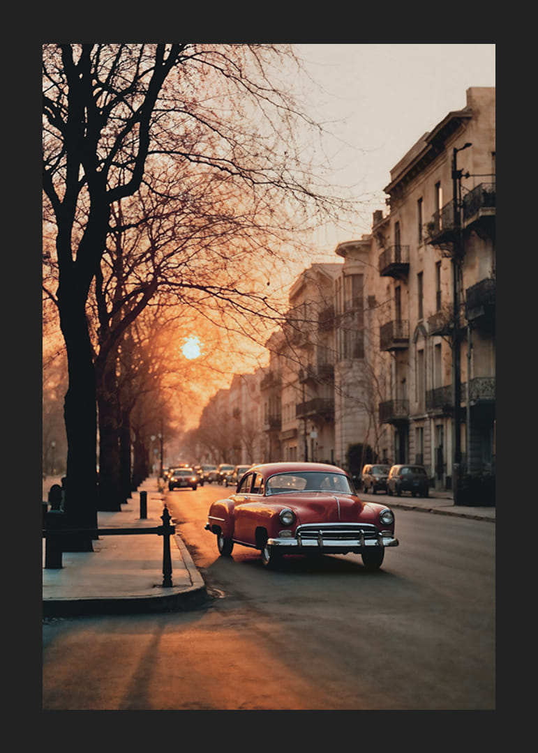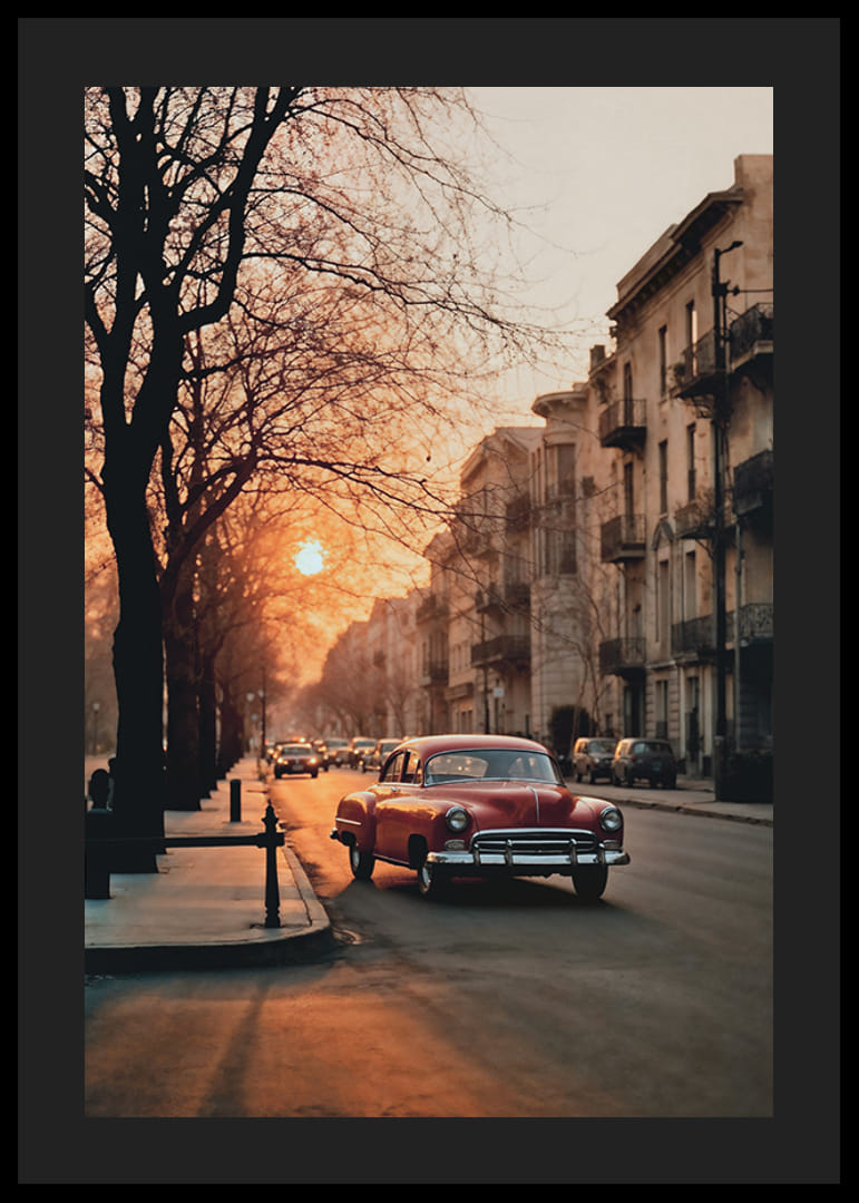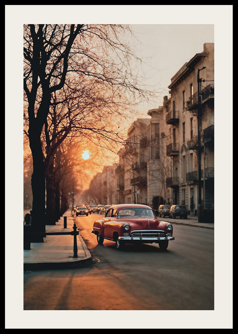 Poster med ett fotografi av en gammal, klassisk röd bil från 1950-talet som står parkerad på en lugn stadsgata i motljus, omgiven av vackra äldre byggnader och nakna trädgrenar. Solnedgångens varma toner reflekteras i gatans asfalt och på bilens lack. Denna poster ger en tidlös känsla till rum där urban nostalgi och stilren design uppskattas.
