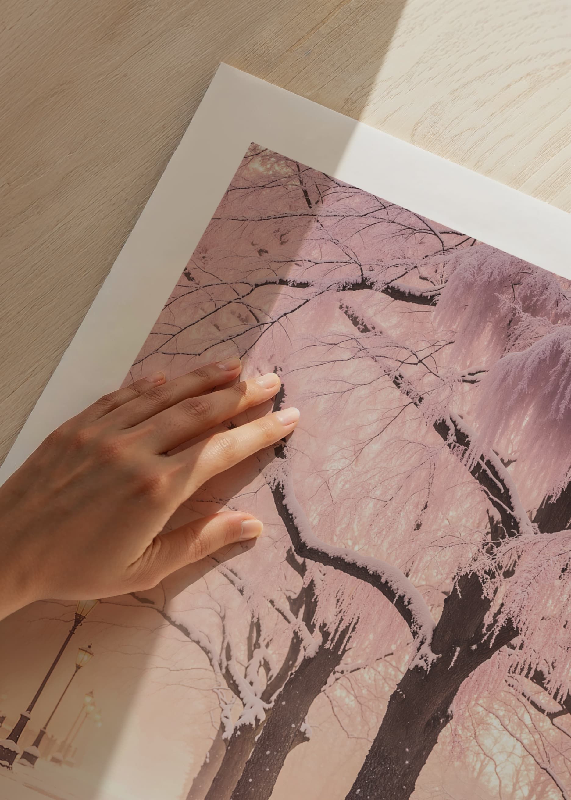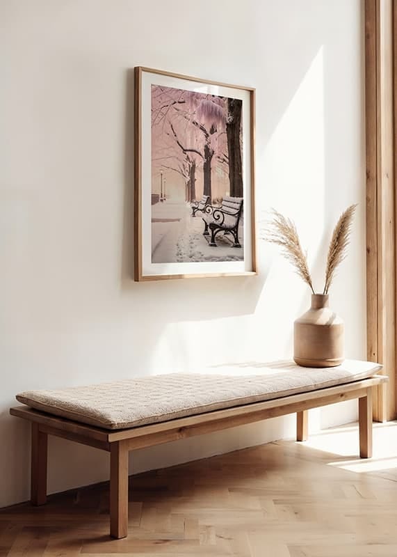 Snötäckta bänkar står längs en gångväg kantad av höga träd vars grenar täcks av pudriga rosatoner och vintervitt. Gatlyktor lyser svagt i bakgrunden och fotspår i snön leder blicken genom motivet. Postern Winter In Pink kombinerar stadsmiljö och natur, och ger en mjuk, vintrig stämning till hemmet.