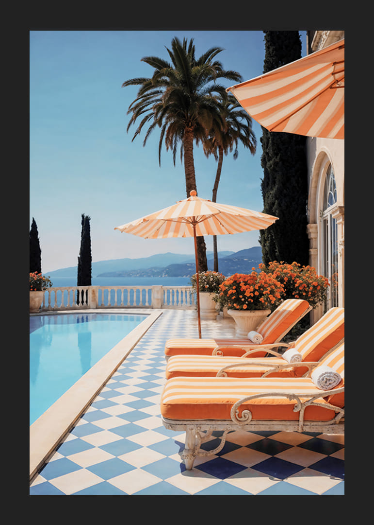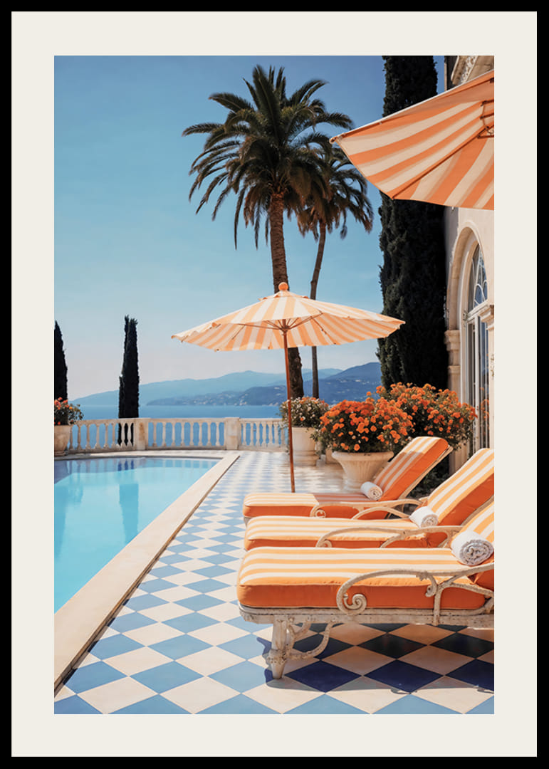 Solsängar med orange- och vitrandiga dynor radar upp sig längs en poolkant, omgivna av blommor och palmer. Det blått och vitt rutiga stengolvet speglar det klara vattnet, med utsikt över hav och berg i fjärran. Denna poster ger en känsla av medelhavskustens ljus och kan skapa en luftig atmosfär i ditt hem.