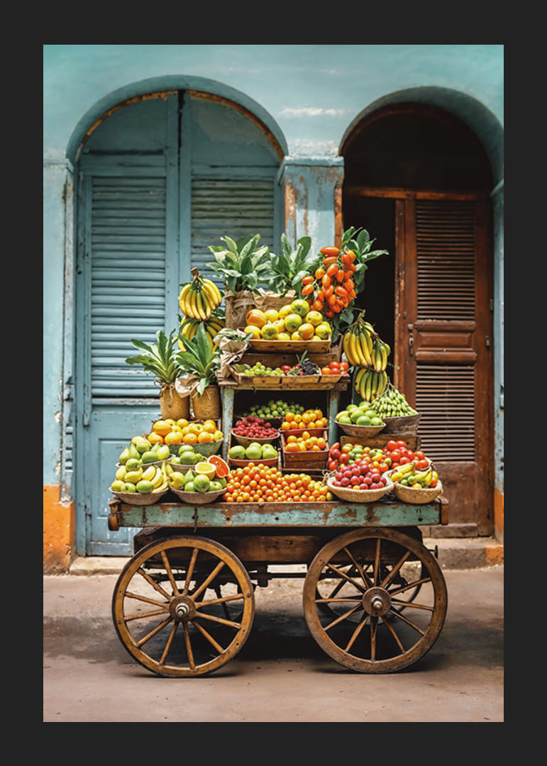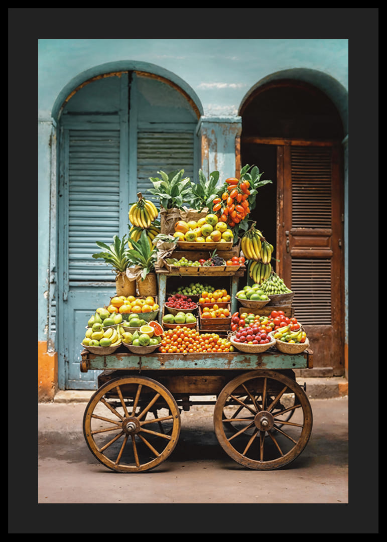 En fruktvagn fylld med bananer, apelsiner, äpplen, tomater och andra färgrika frukter står placerad mot en bakgrund av ljusblå trädörrar och putsade fasader. De naturliga färgerna och det rustika temat skapar en livlig känsla. Denna poster ger kök och matplats en varm, medelhavsinspirerad atmosfär.