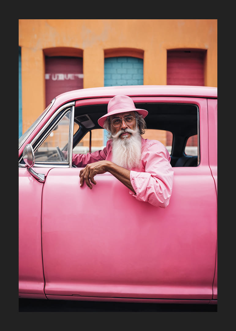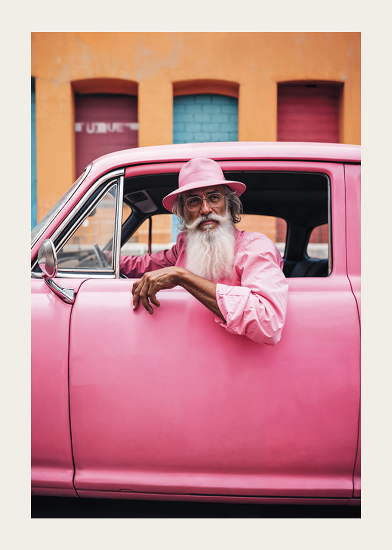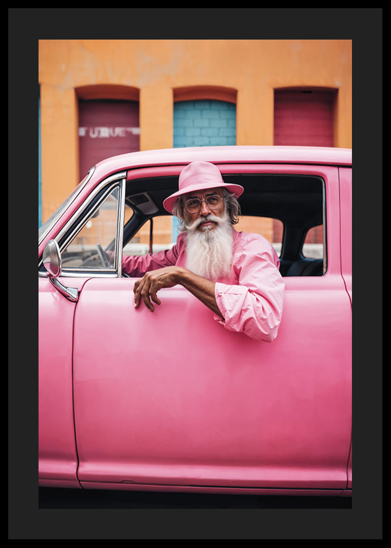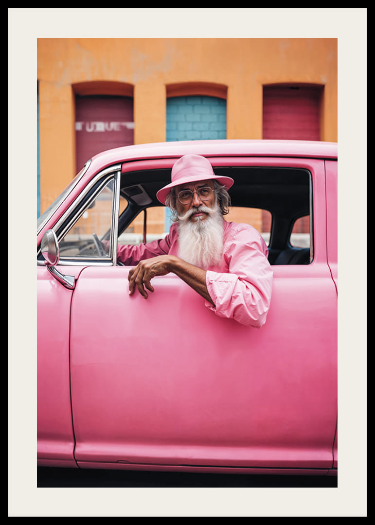 En äldre man med vitt skägg och rosa skjorta sitter avslappnat i en klassisk rosa bil, matchande med sin hatt och omgivning. Bakgrunden består av en livlig fasad i orange och pastellfärger, vilket ger motivet en lekfull och färgstark känsla. Denna poster blir ett uttrycksfullt inslag i moderna och kreativa miljöer.