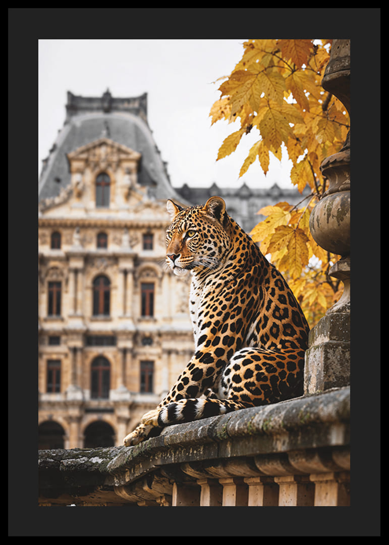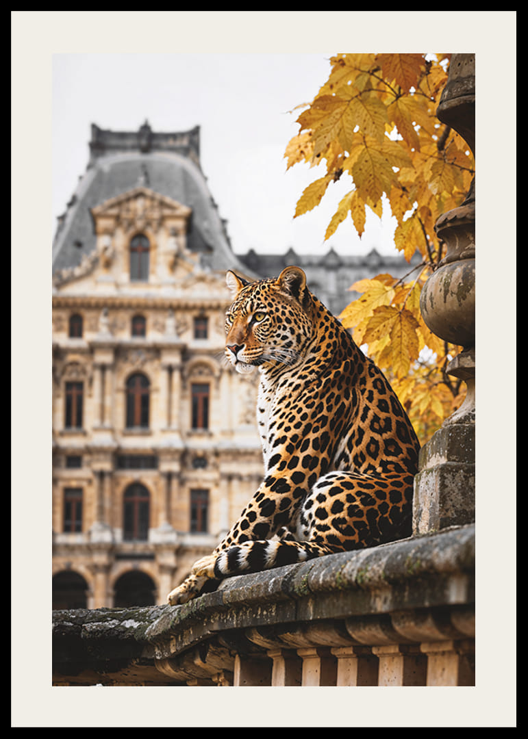 En jaguar sitter avslappnat på ett stenräcke med en praktfull, gammal byggnad i bakgrunden. Gula höstlöv ramar in motivet och skapar en varm kontrast till den arkitektoniska miljön. Denna poster ger ett oväntat möte mellan djurliv och stad, och passar väl i moderna vardagsrum eller arbetsrum.