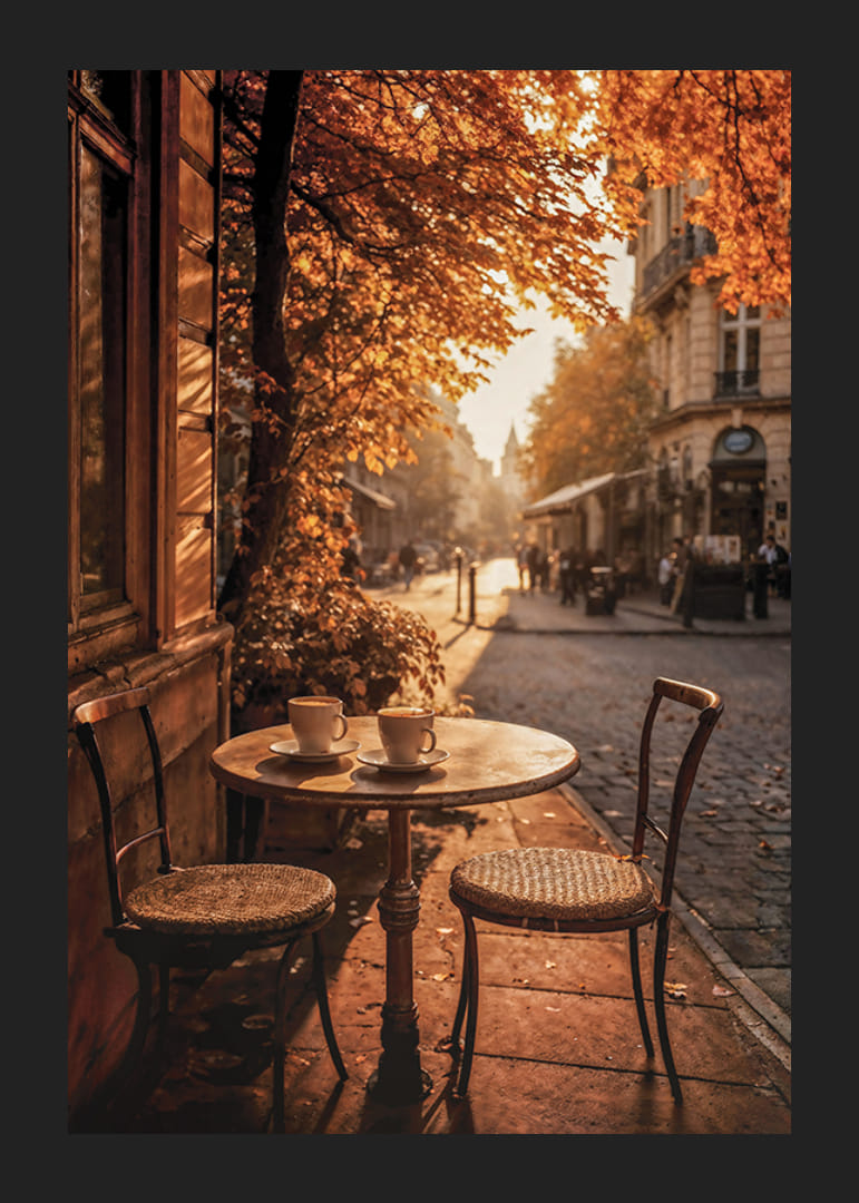Runt cafébord med två tomma stolar står vid en stenlagd trottoar omgiven av gula och orange höstlöv. Solen silas genom träden och skapar varm belysning på fasad och mark. Denna poster fångar stadslivets mjuka caféatmosfär och höstens inbjudande stämning.
