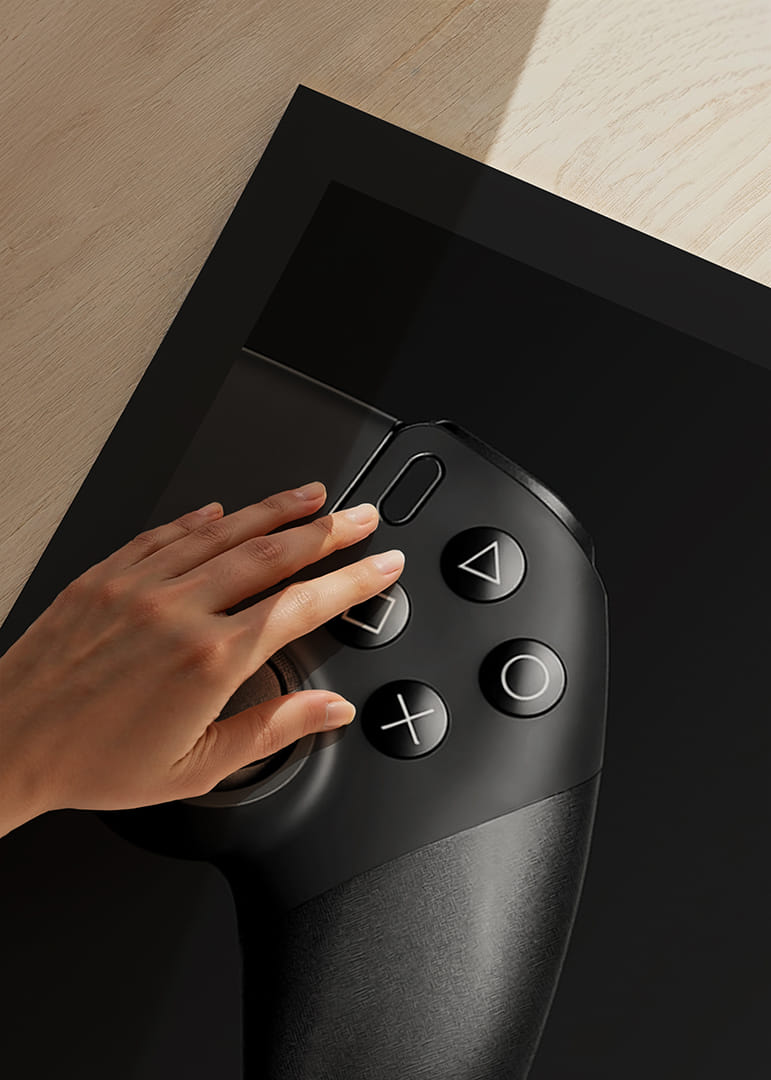 Motivet består av en närbild på en svart spelkontroll med tydliga, klassiska knappar mot en djup, mattsvart bakgrund. Detaljer och former framträder i mjuka skuggor och ren design. Den här postern passar både i gamingrum och moderna arbetsrum och ger en diskret teknisk känsla till inredningen.