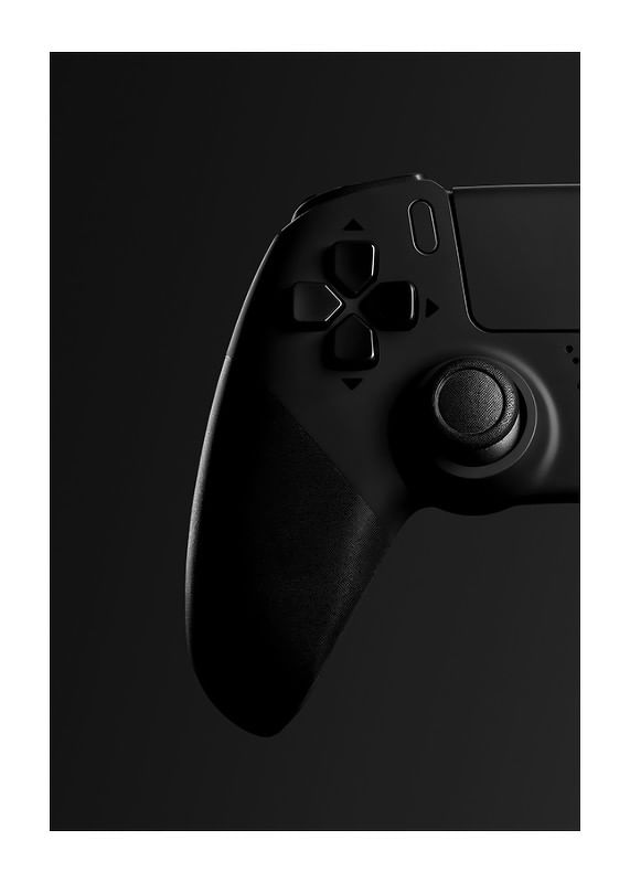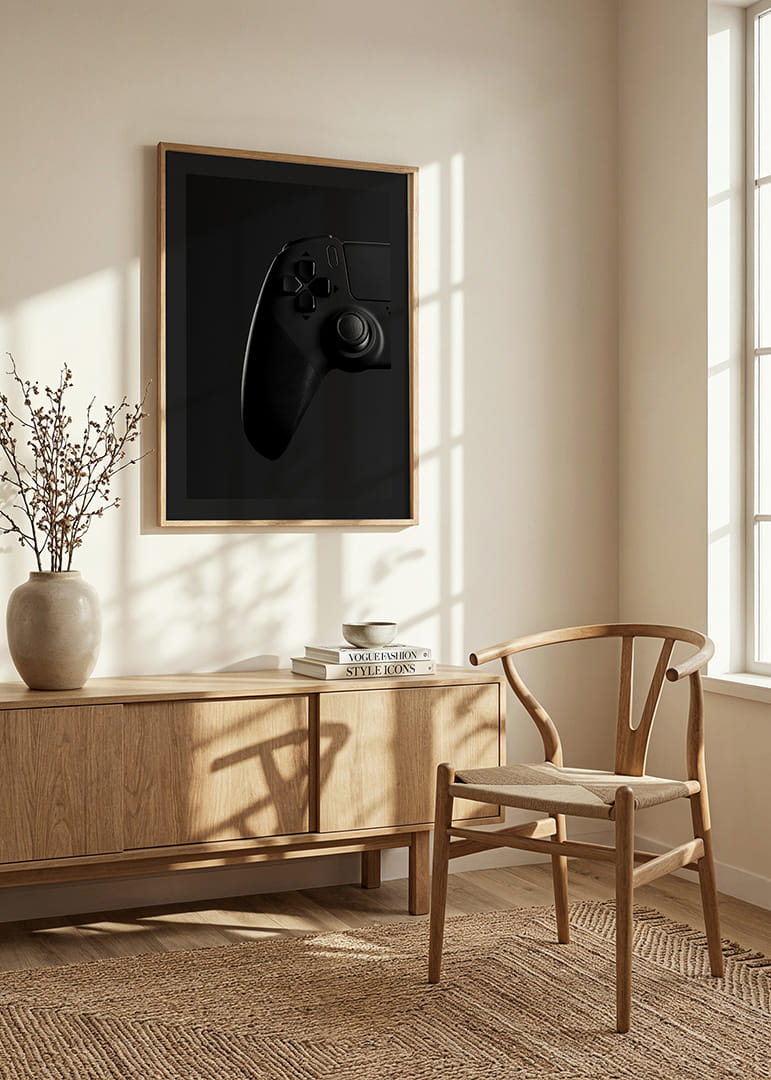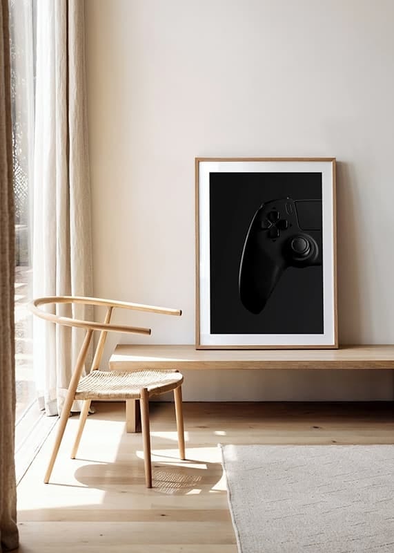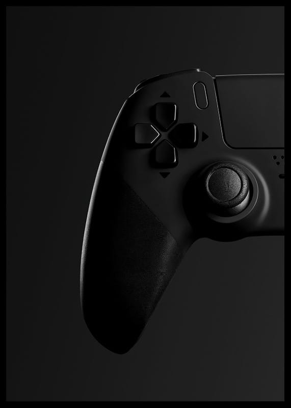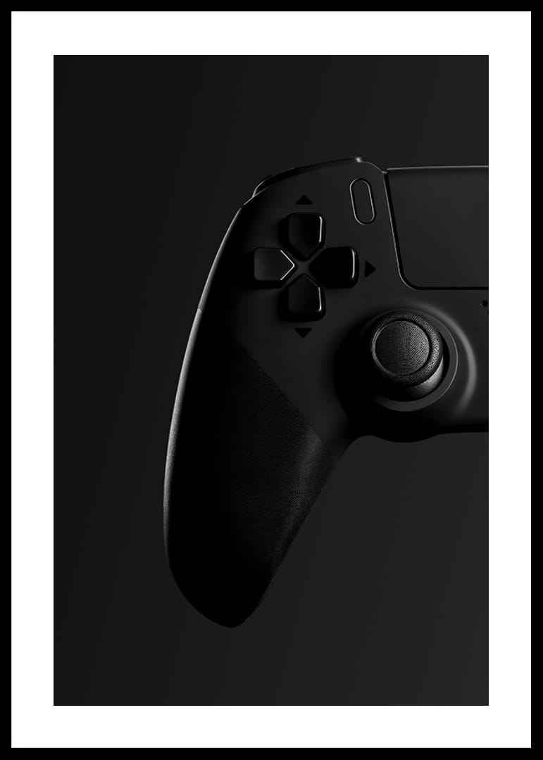 Motivet består av en klassisk spelkontroll i svart med tydliga detaljer, där grepp och knappar framträder mot en djup, mörk bakgrund. Den minimalistiska, monokroma stilen ger postern ett modernt uttryck och passar både i gamingrummet, tonårsrummet eller hemmakontoret där teknik möter inredning.