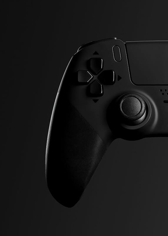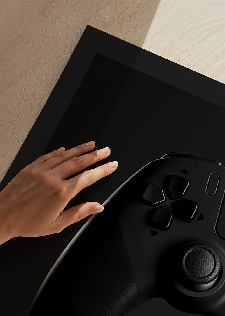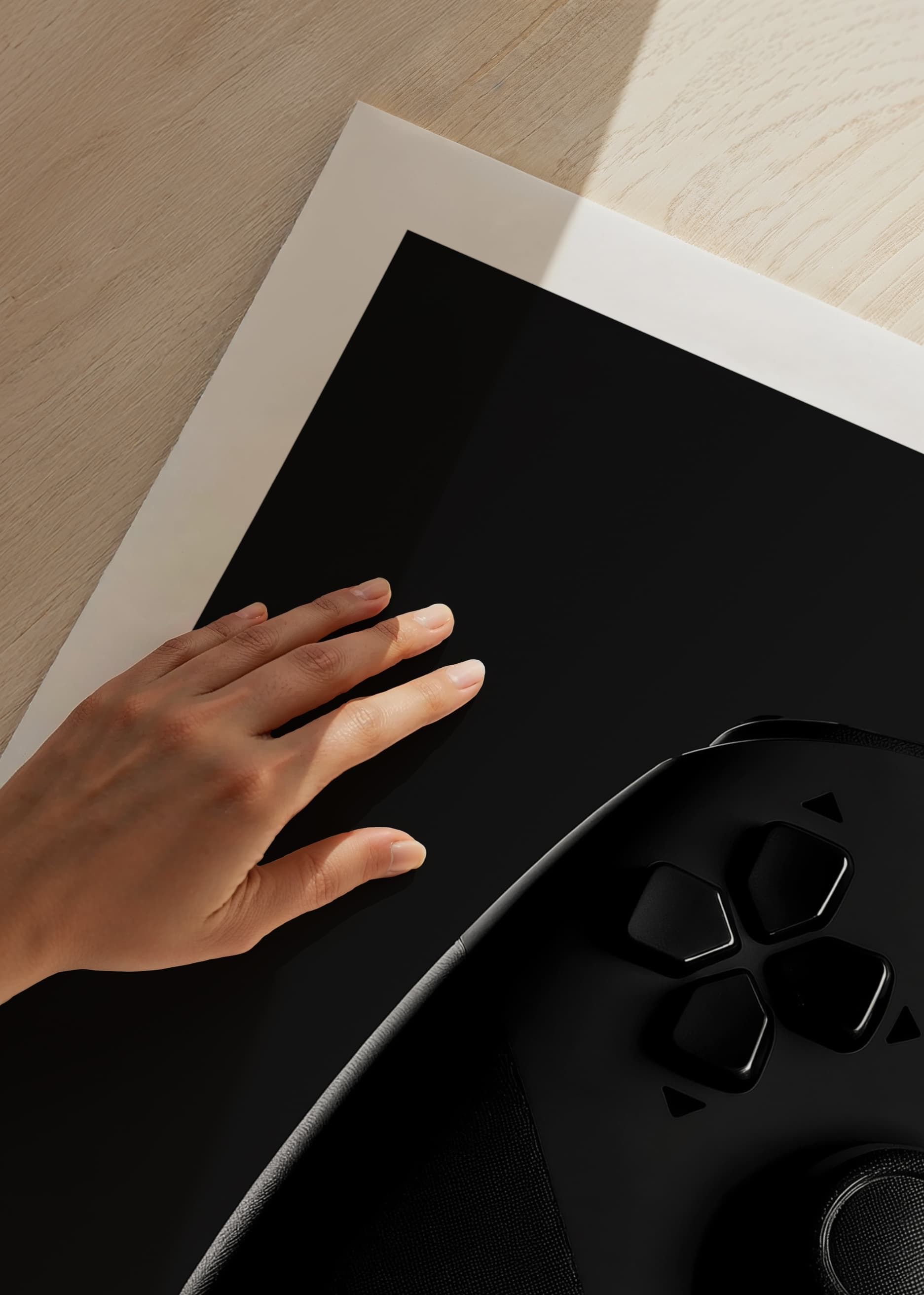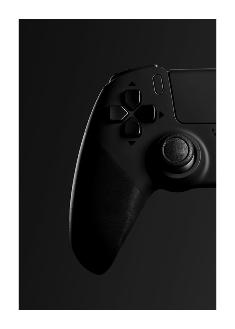 Motivet består av en klassisk spelkontroll i svart med tydliga detaljer, där grepp och knappar framträder mot en djup, mörk bakgrund. Den minimalistiska, monokroma stilen ger postern ett modernt uttryck och passar både i gamingrummet, tonårsrummet eller hemmakontoret där teknik möter inredning.