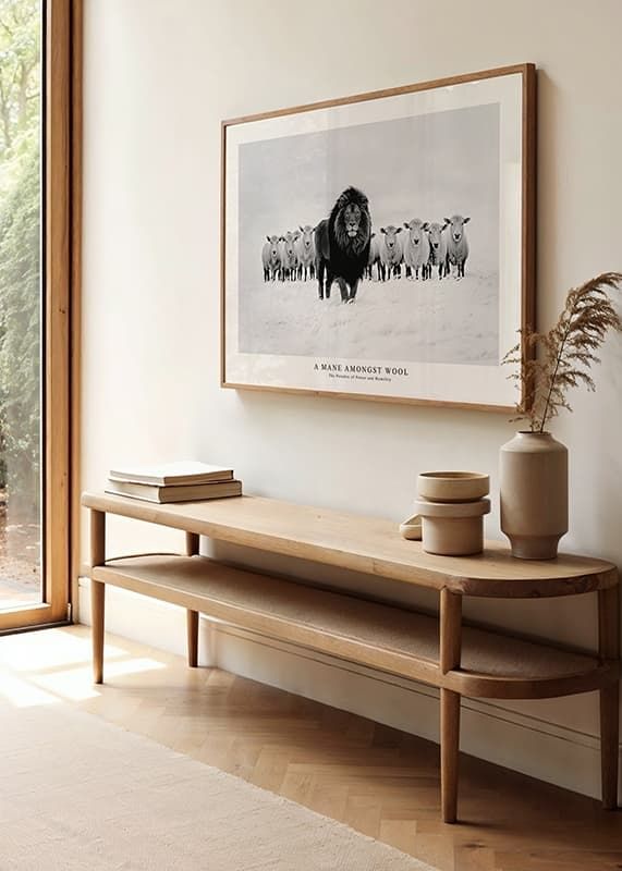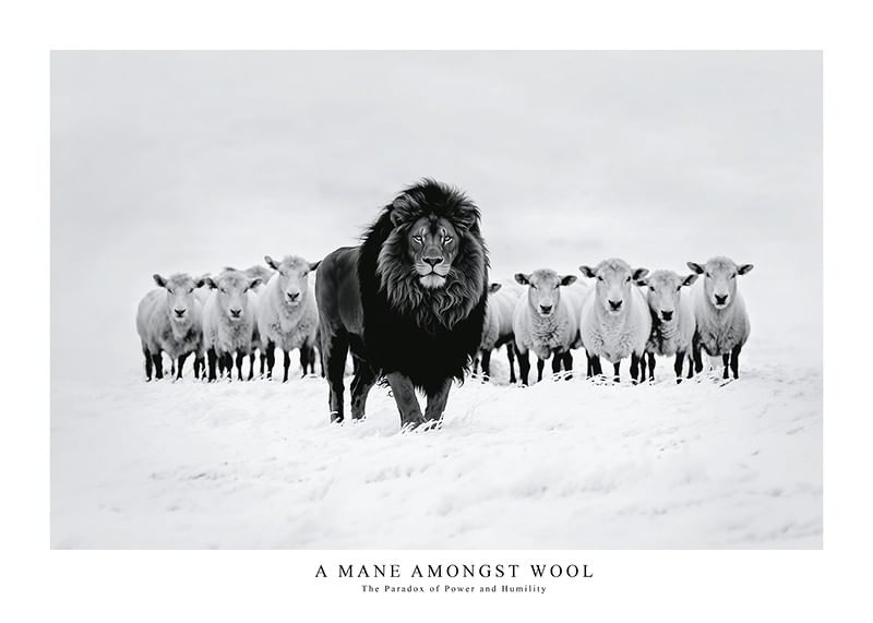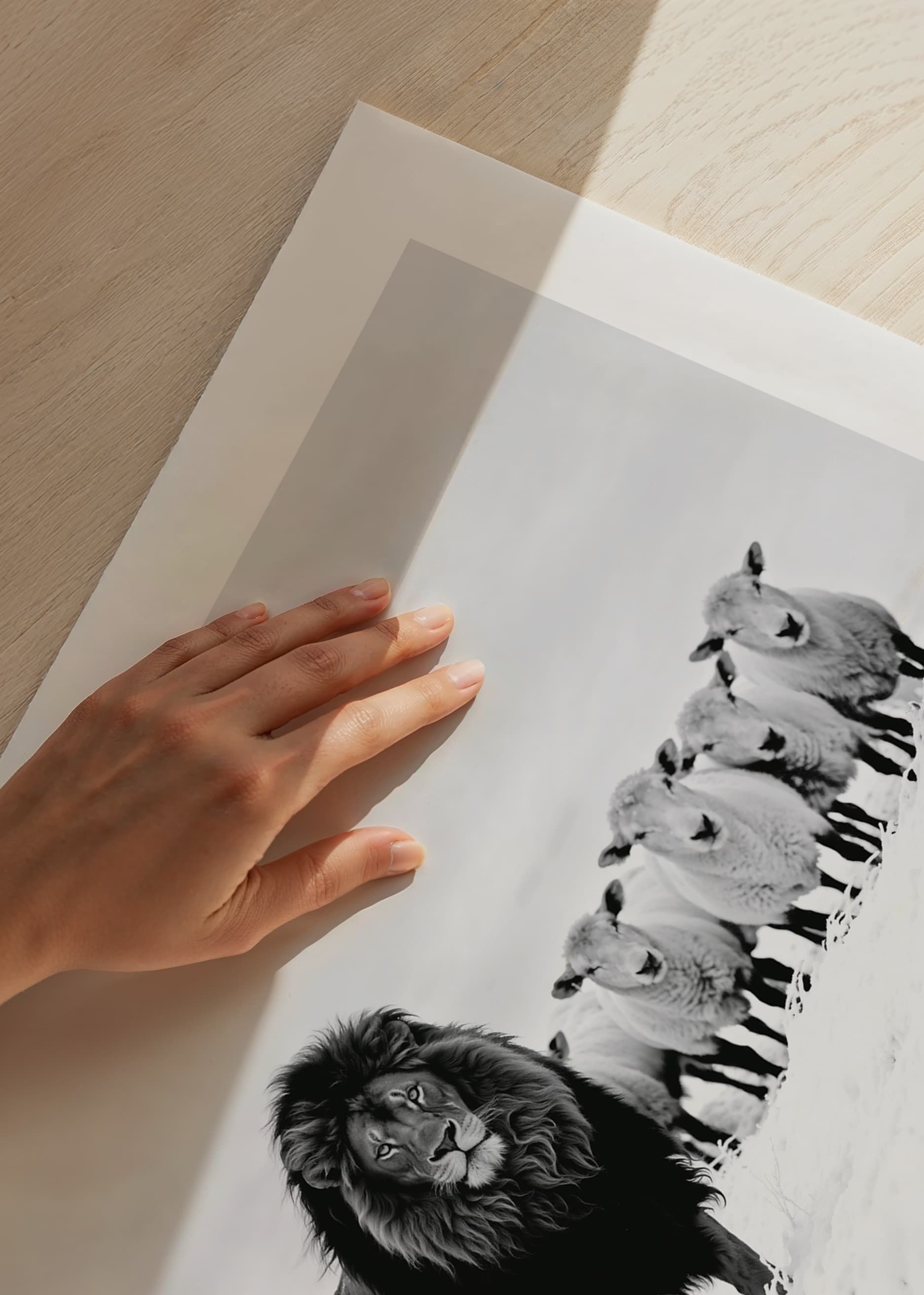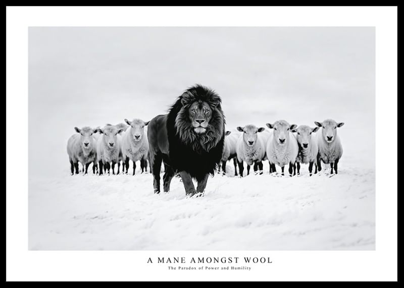 Ett svart lejon står i centrum och omges av en flock vita får. Motivet är komponerat i svartvitt med tydliga kontraster mellan lejonets mörka man och fårens ljusa ull, placerade mot en snötäckt mark och mjukt diffust himmel. Denna poster ger ett grafiskt och modernt uttryck till vardagsrum eller arbetsmiljö.