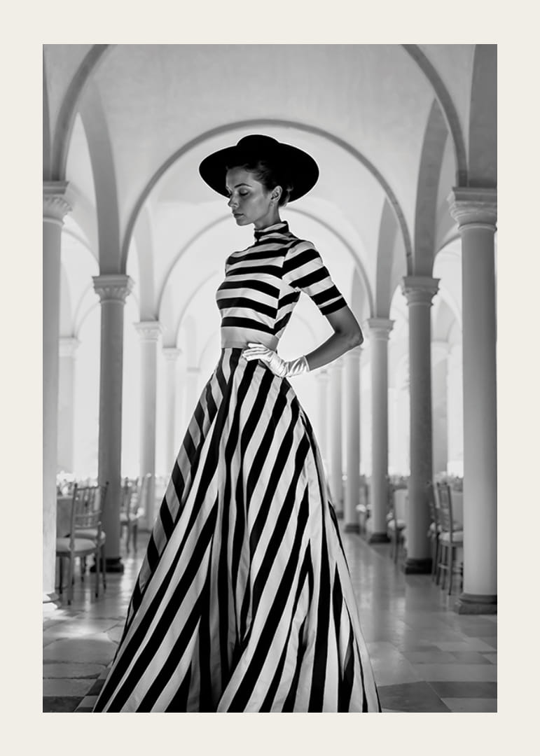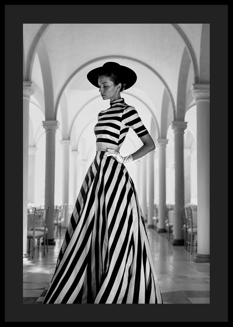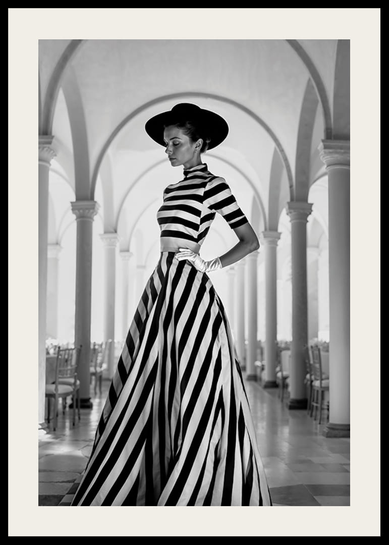 En kvinna i svartvit-randig, golvlång klänning och hatt står i ett ljust valvprytt rum med klassiska pelare. Stilen för tankarna till vintage modefotografi, där de tydliga kontrasterna i klänningens mönster förstärks av det grafiska formspråket. Denna poster passar i sovrum eller vardagsrum för en tidlös atmosfär.