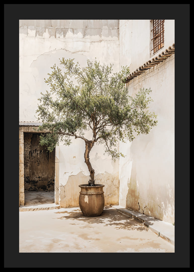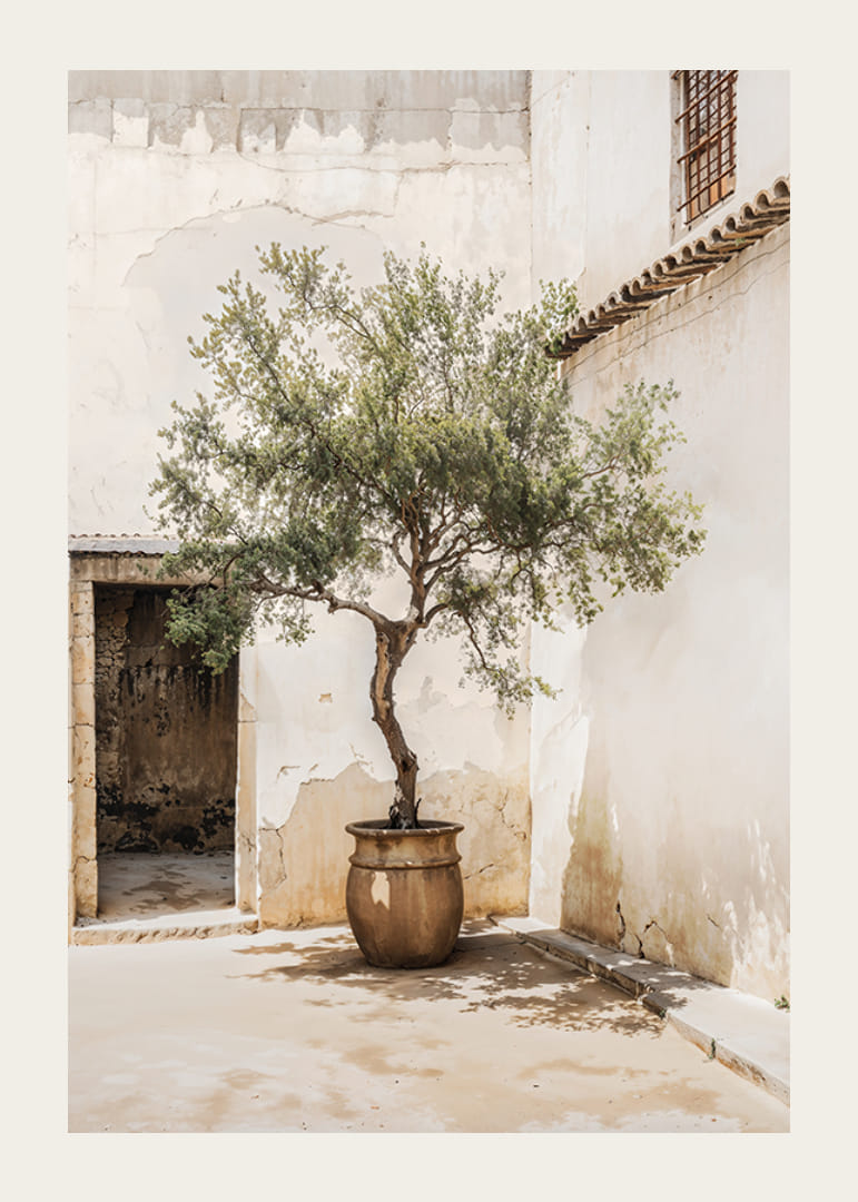 Motivet består av ett olivträd planterat i en större terrakottakruka, placerat på en innergård med slitna, solblekta väggar i ljusa beige och sandtoner. Mjukt naturligt ljus faller över scenen och framhäver både bladverket och väggarnas patina. Denna poster ger en varm, medelhavsinspirerad känsla till moderna hem.