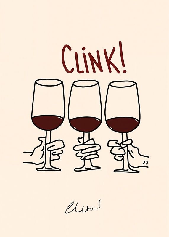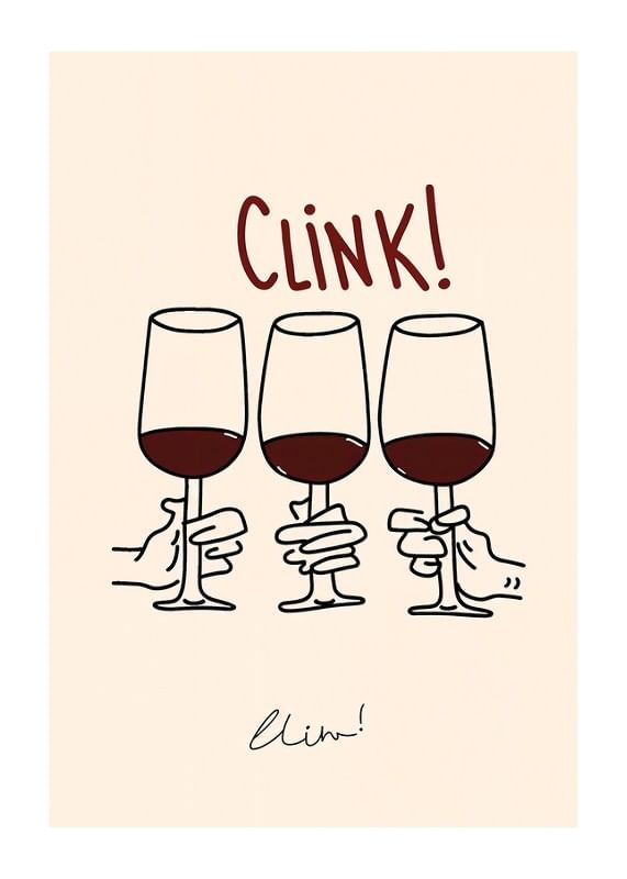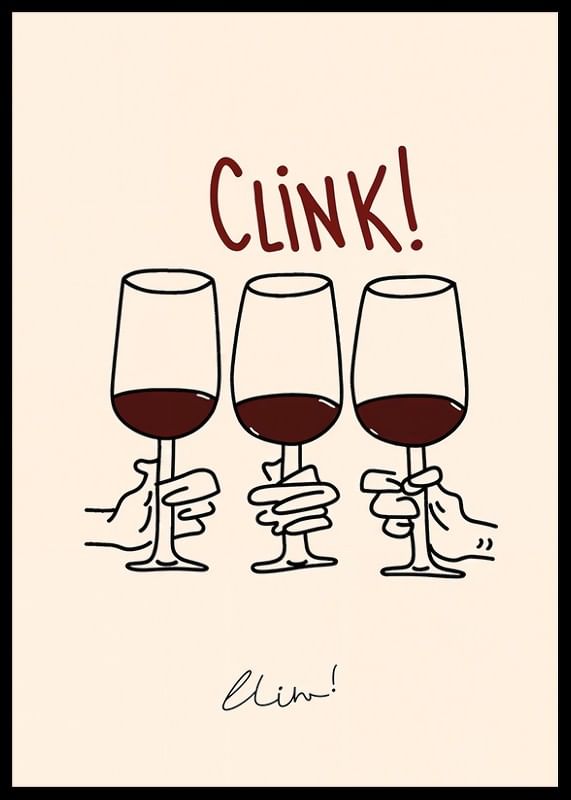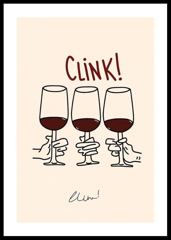 Poster med en enkel och charmig illustration av tre vinglas med rödvin som skålar. Ovanför glasen är ordet "CLINK!" skrivet i en lekfull och handskriven typ stil.