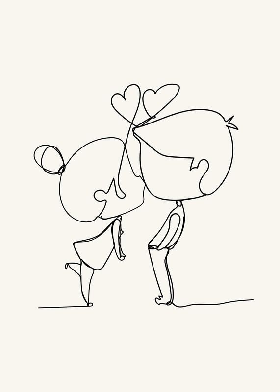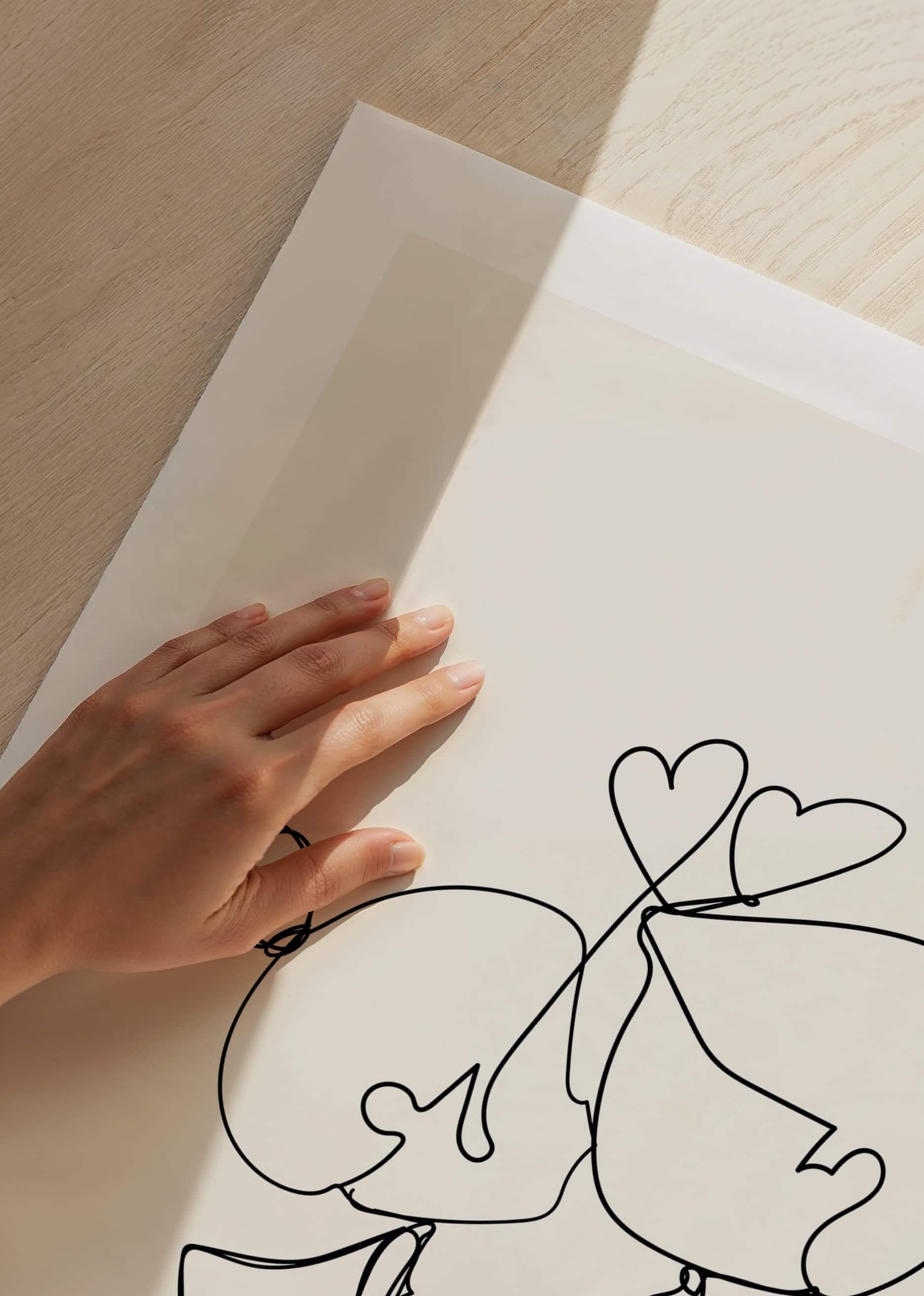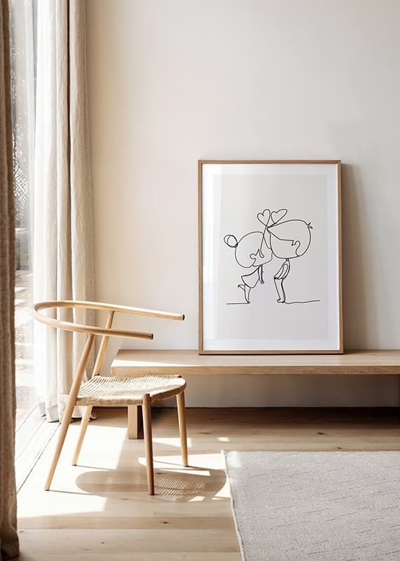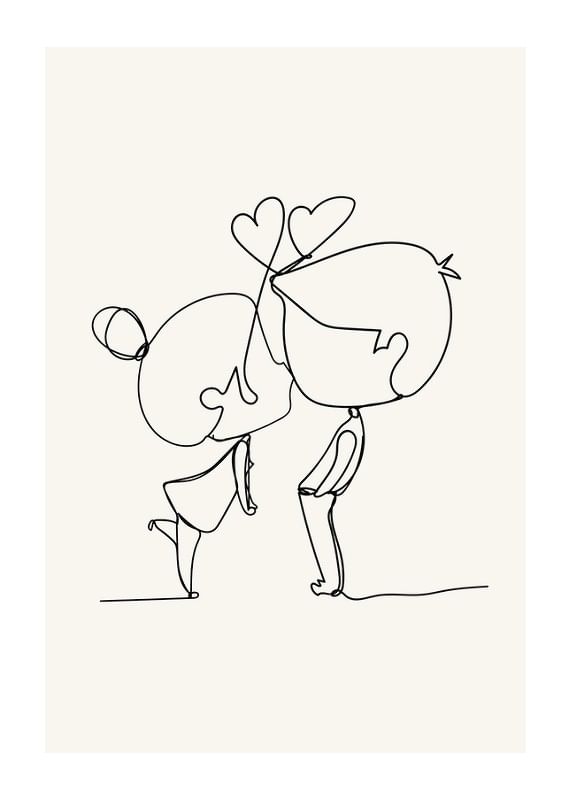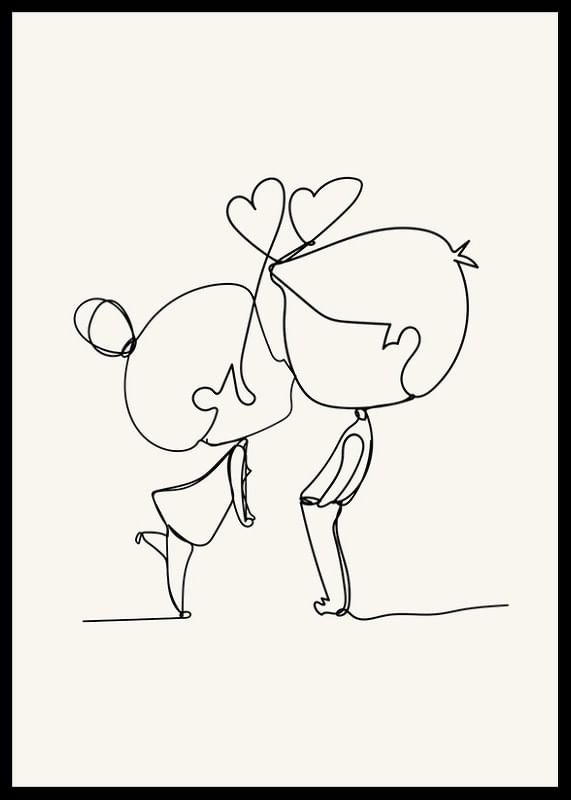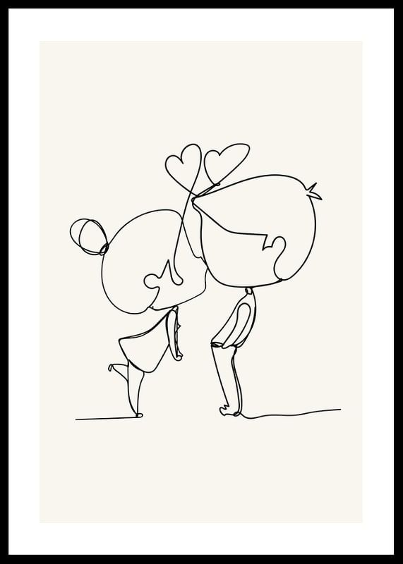 Poster med en minimalistisk line art illustration av en flicka och en pojke som förmedlar kärlek på ett uttrycksfullt sätt.
