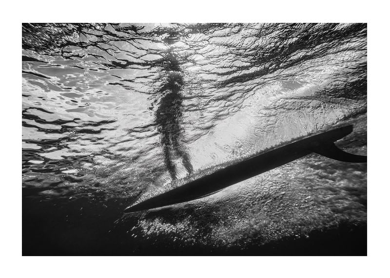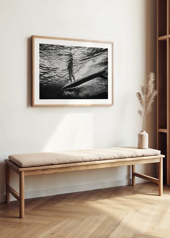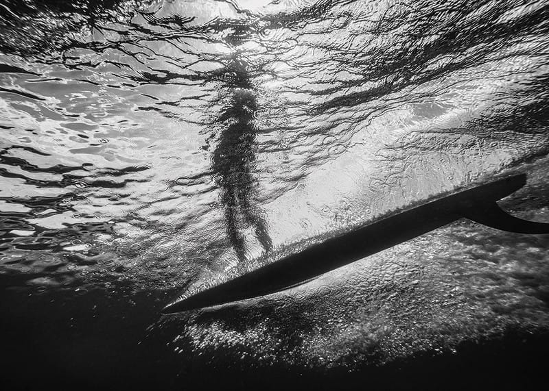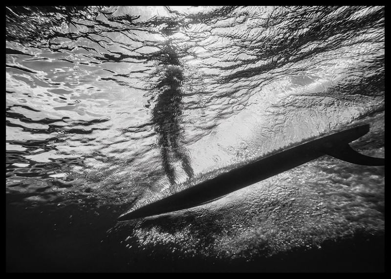 Svartvit poster med ett fotografi på en undervattensvy där ljuset från solen sipprar igenom havsytan, skapar ett mönster av glittrande vågor ovanför. En mörk silhuett av en person som står på en surfbräda syns i motljus mot det skimrande vattnet. Det är en dramatisk och nästan surrealistisk scen som fångar essensen av frihet och lugn under vattenytan.