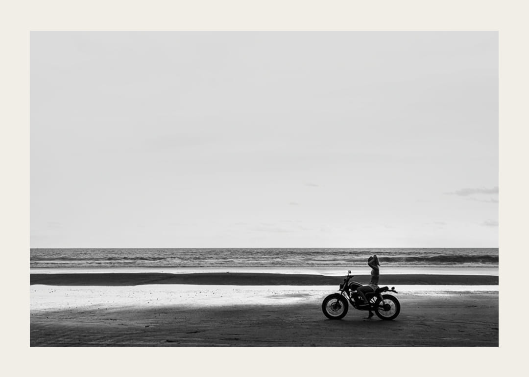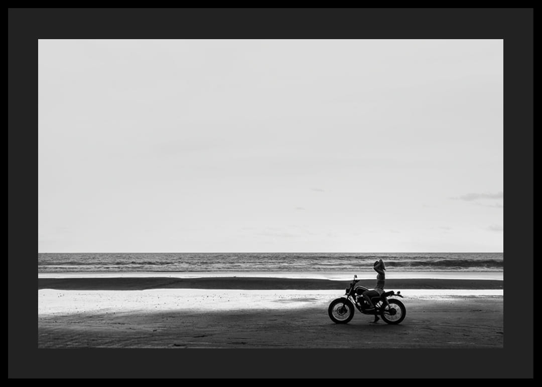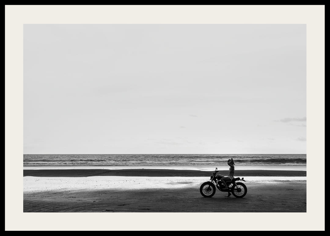 Svartvit poster med ett fotografi på en ensam motorcykel på en ödslig strand. Bilden ger en harmonisk känsla av stillhet.