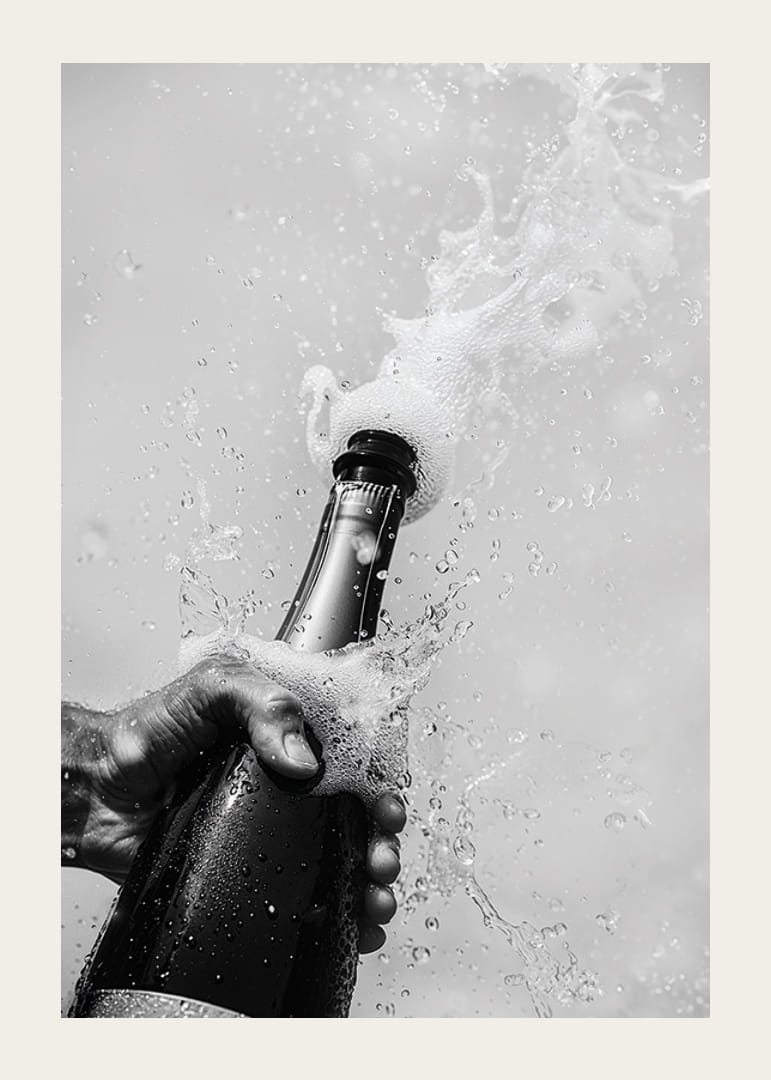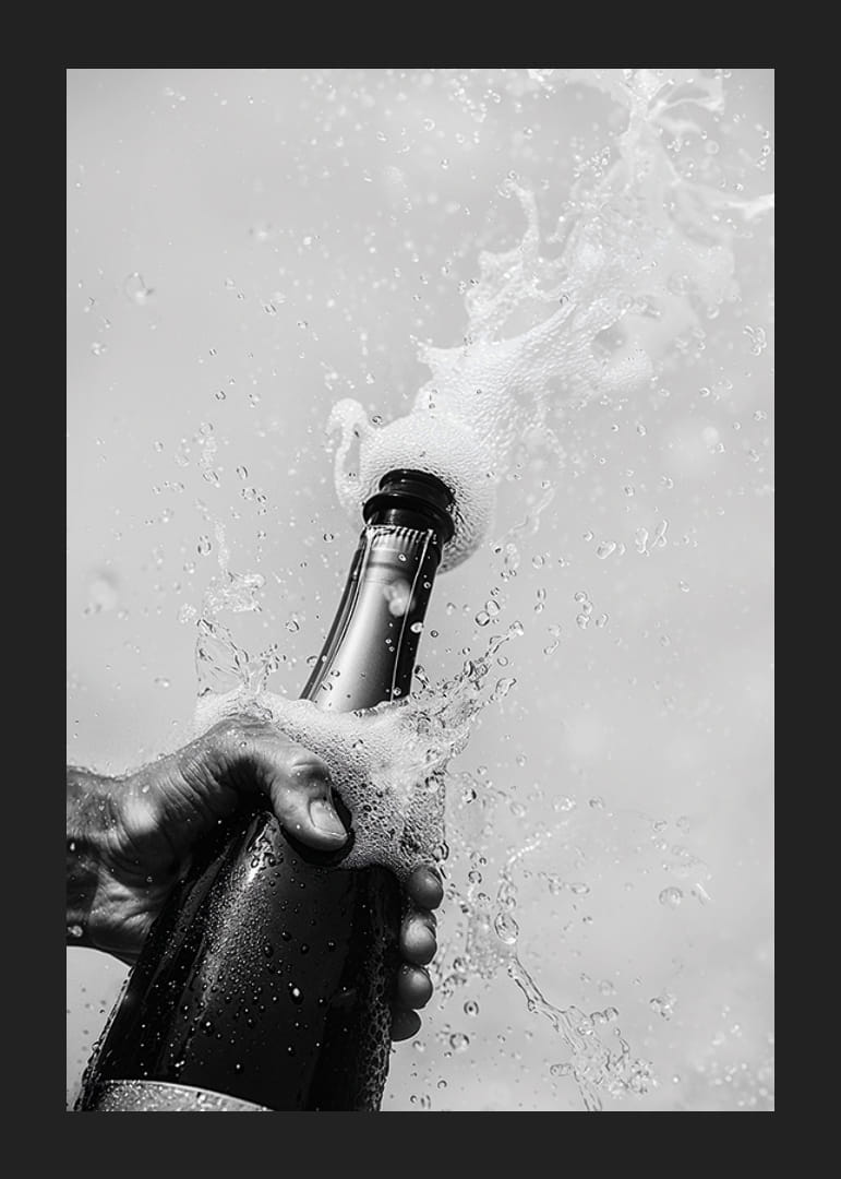 Denna svartvita poster fångar ett kraftfullt och glädjefyllt ögonblick när en champagneflaska just har öppnats och skummet sprutar ut i en livlig ström. Ett dynamiskt fotografi som förmedlar känslan av firande, lyx och spontana ögonblick att minnas. Perfekt för vardagsrum, hemmabar eller som en elegant detalj i köket – ett motiv som passar både till fest och som stilfull inredning året om. En poster som sprudlar av energi – perfekt för dig som älskar livet, bubblor och att fira stort.