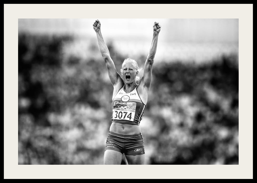 Svartvit poster med ett fotografi på den svenska friidrottsstjärnan Carolina Klüft från Olympiska spelen i Aten år 2004 där hon tog guld i sjukamp. Klüft är innehavare av det svenska rekordet, europarekordet (med 7 032 poäng noterat den 26 augusti 2007 vid friidrotts-VM i Osaka) och juniorvärldsrekordet i sjukamp. Hon den yngsta friidrottaren hittills som erövrat samtliga fem internationella guldmedaljer: Olympiska spelen, världsmästerskap (inom- och utomhus) och Europamästerskap (inom- och utomhus).