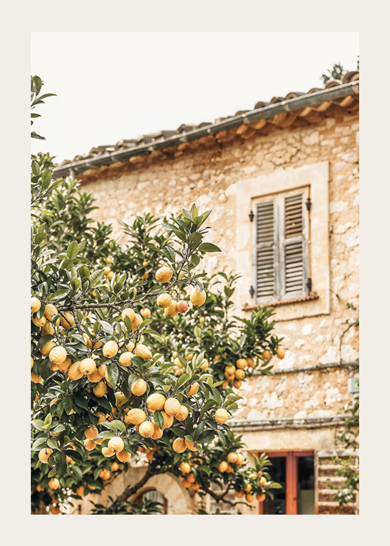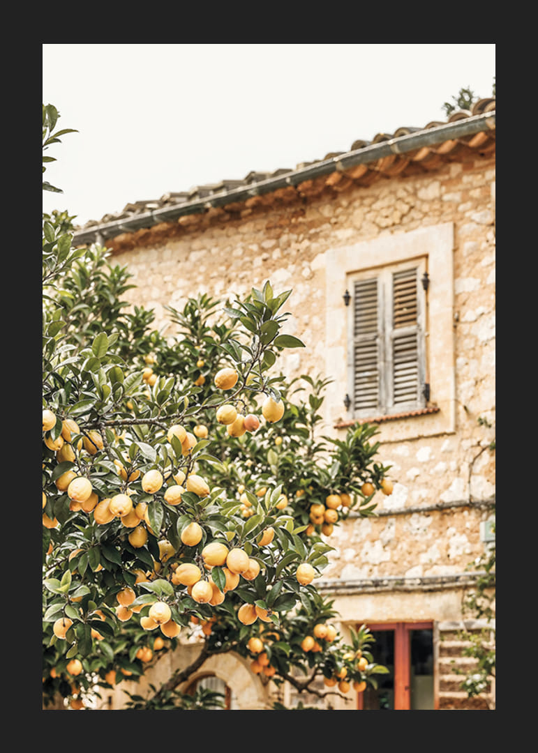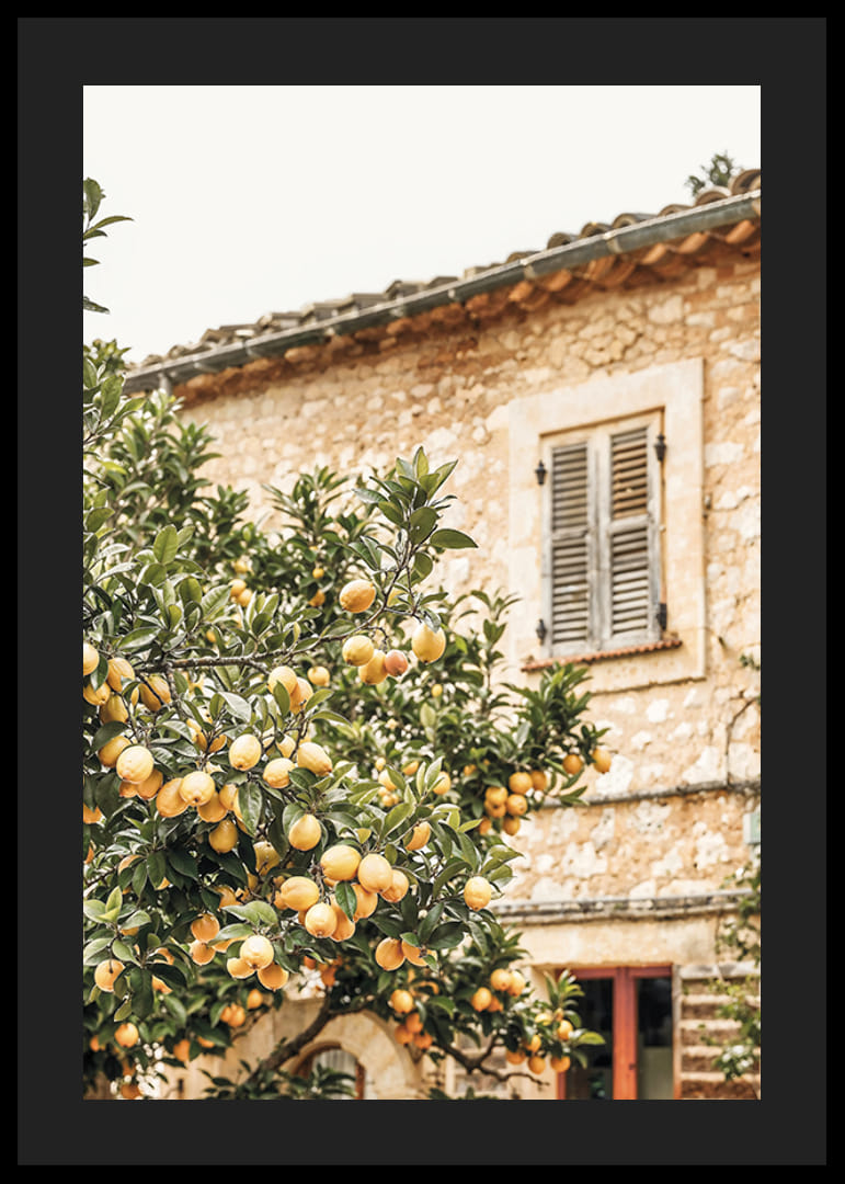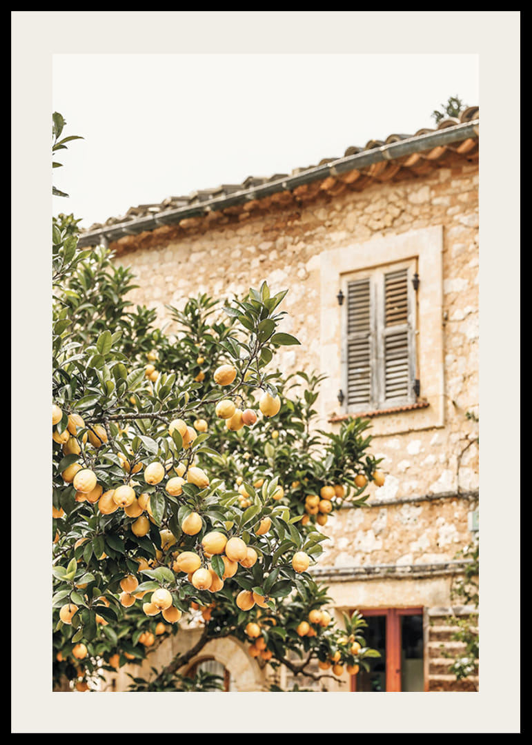Poster med ett fotografi som fångar den lantliga idyllen av ett stenhus omfamnat av ett frodigt citronträd, dess gyllene frukter lyser upp scenen. Huset, med dess patinerade fönsterluckor, vittnar om en tidlös skönhet och enkelhet i hjärtat av landsbygden.