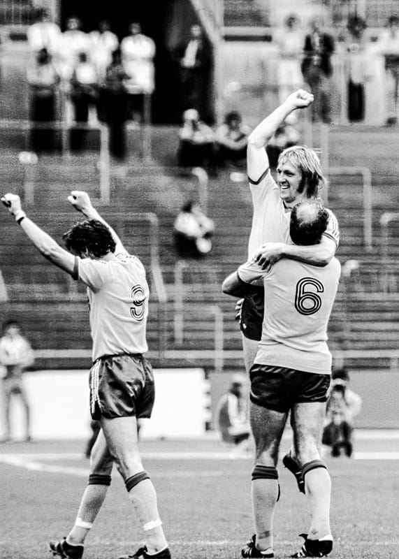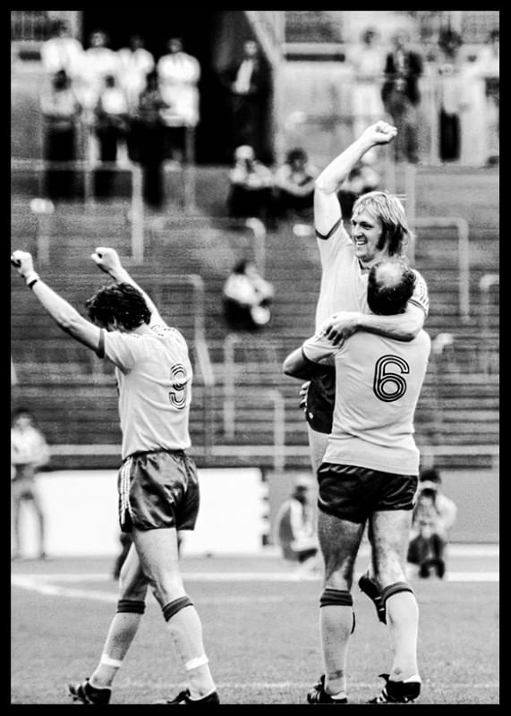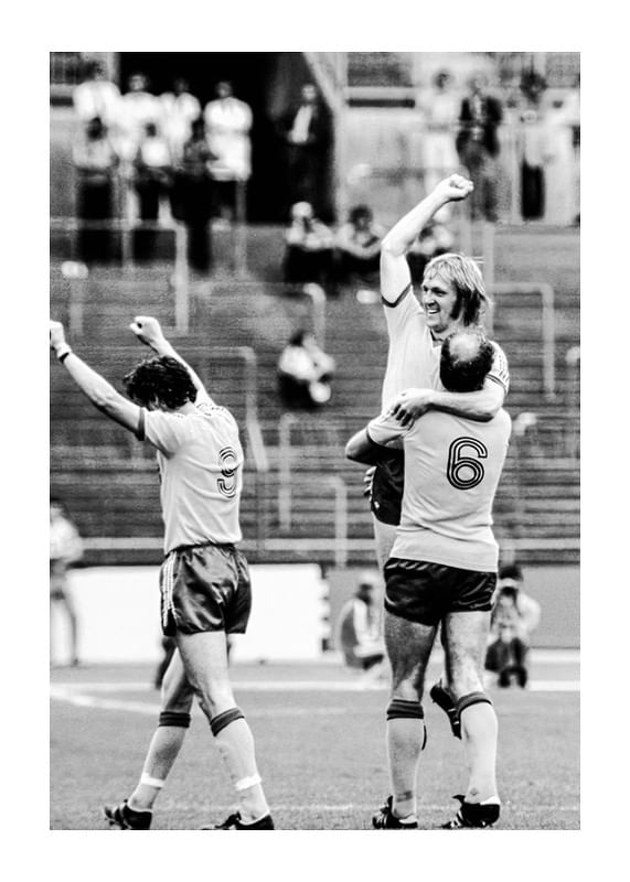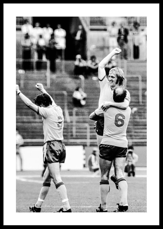 Svartvit poster med ett fotografi på Roland Sandberg som jublar under en match mellan Sverige och Bulgarien, Fotbolls-VM år 1974.