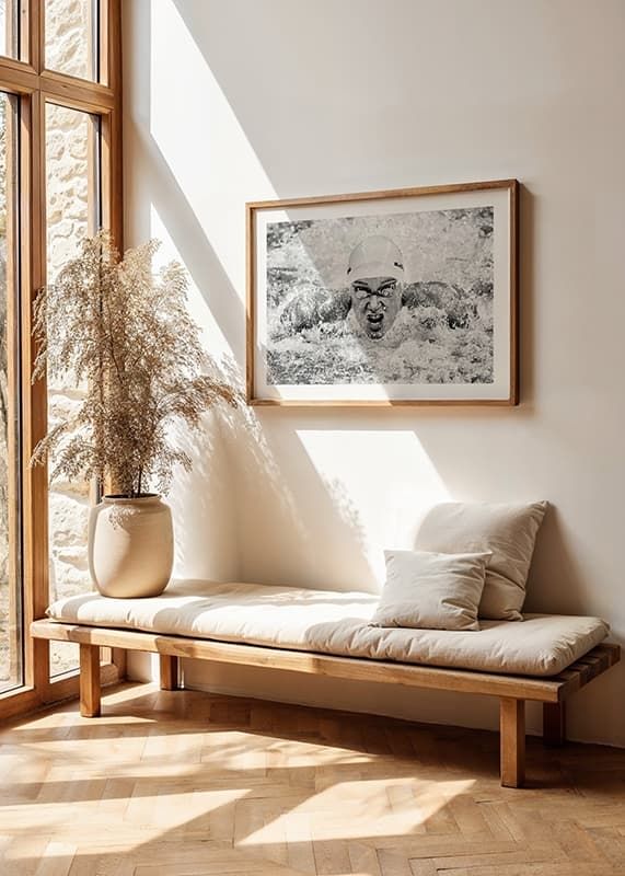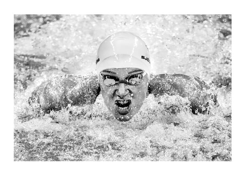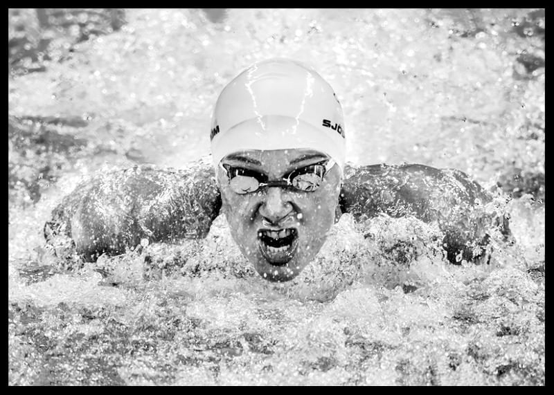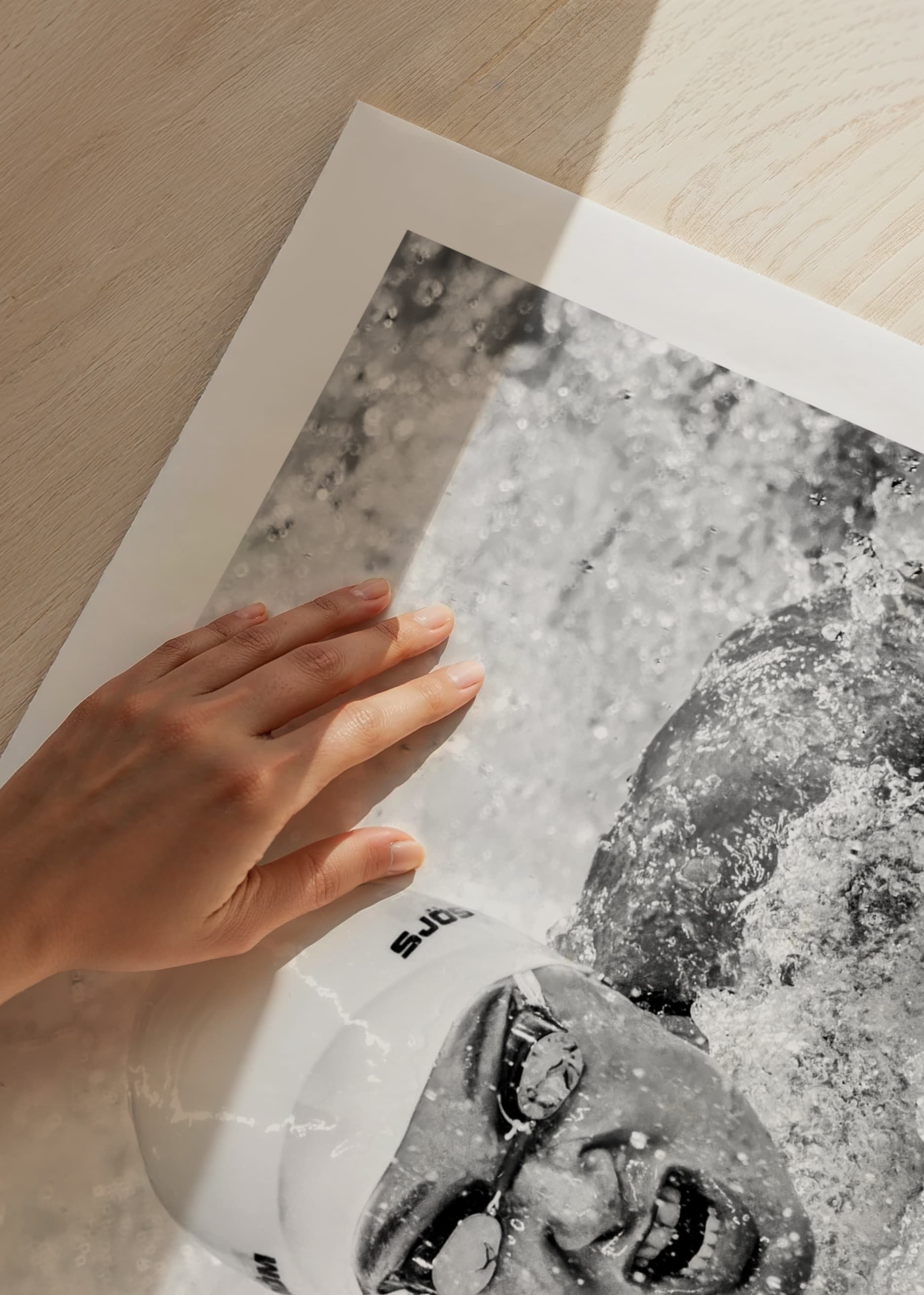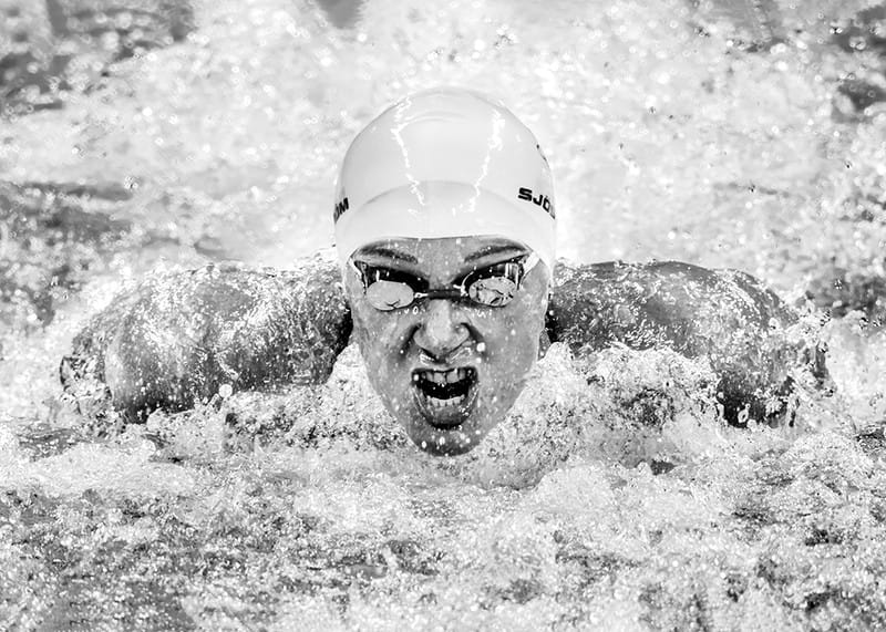Svartvit poster med ett fotografi på den svenska simmerskan Sarah Sjöström från OS i Rio de Janeiro år 2016 där hon tog guld i 100 m fjärilsim.