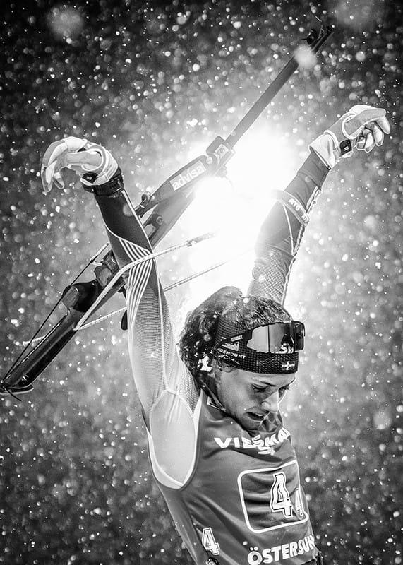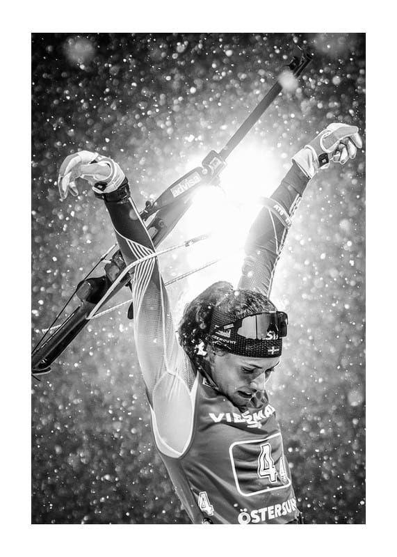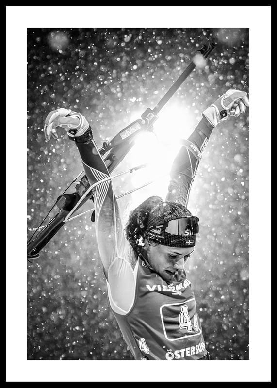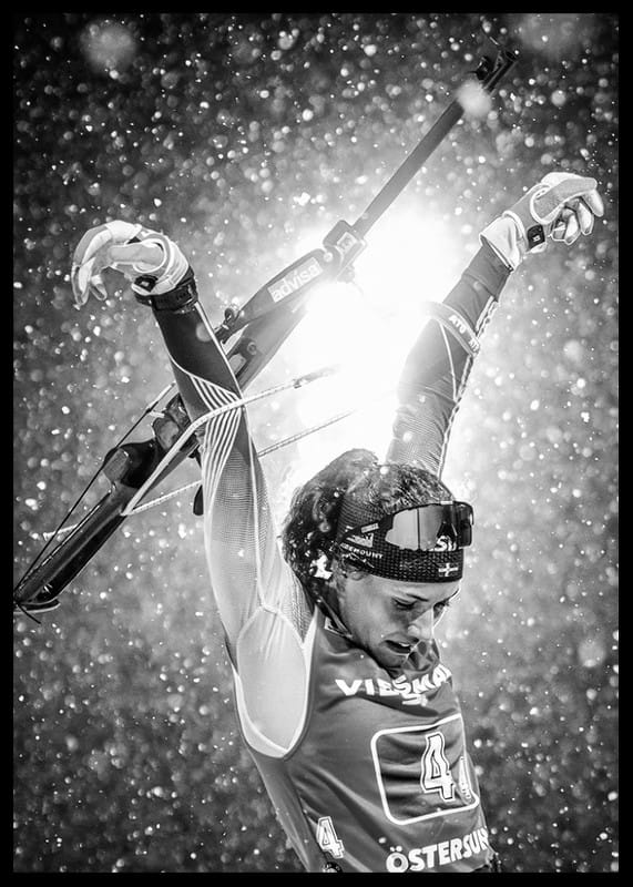 Svartvit poster med ett fotografi på den svenska skidskyttestjärnan Hanna Öberg under världscupen i Östersund, december 2019.
