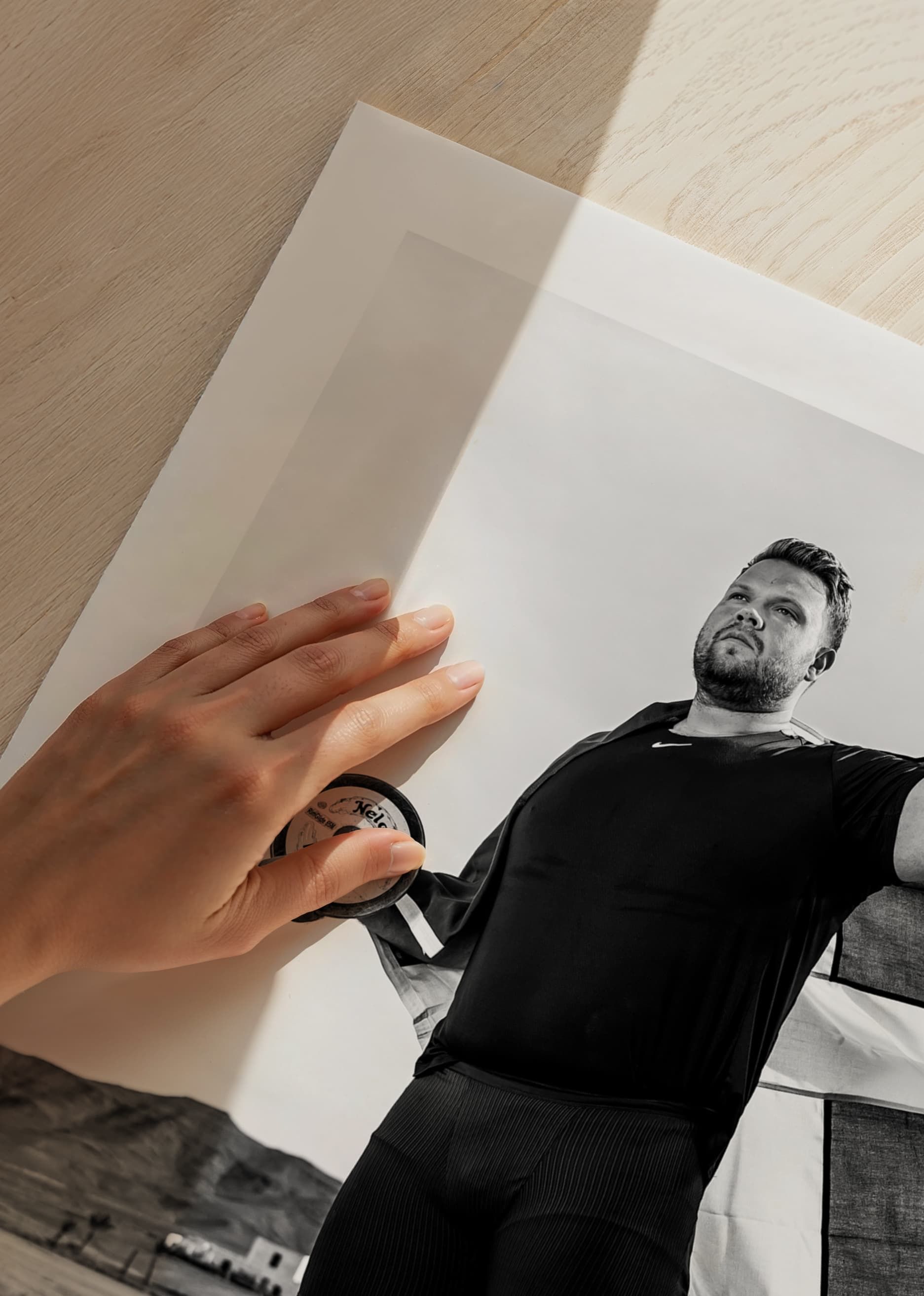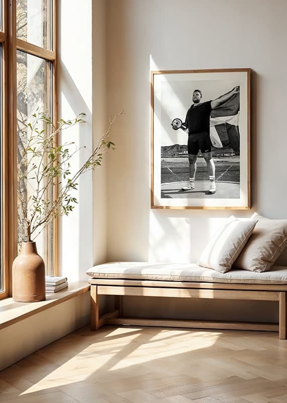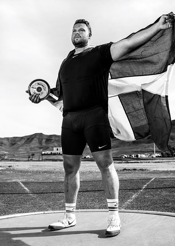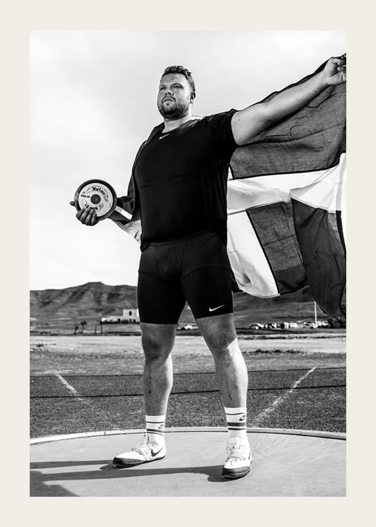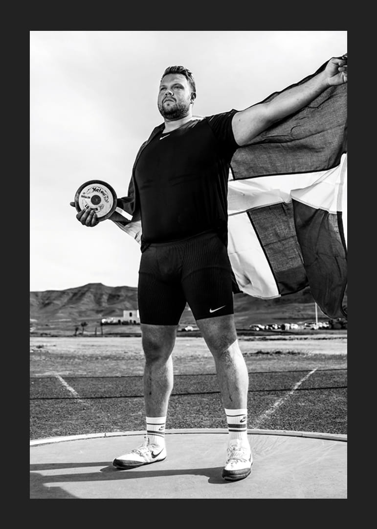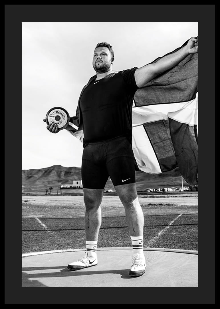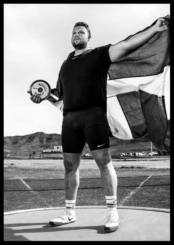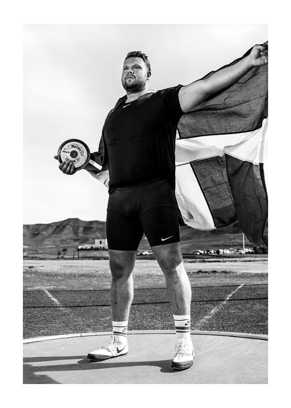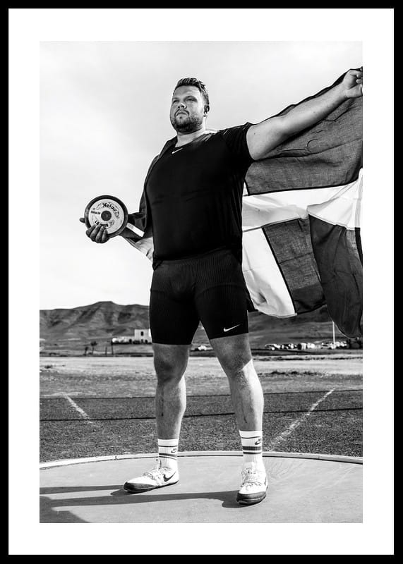 Svartvit poster med ett fotografi på den svenske diskusstjärnan Daniel Ståhl från år 2023. Fotografiet är taget under ett träningsläger inför förberedelserna till OS i Paris år 2024.