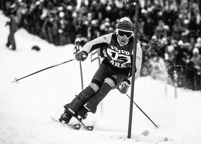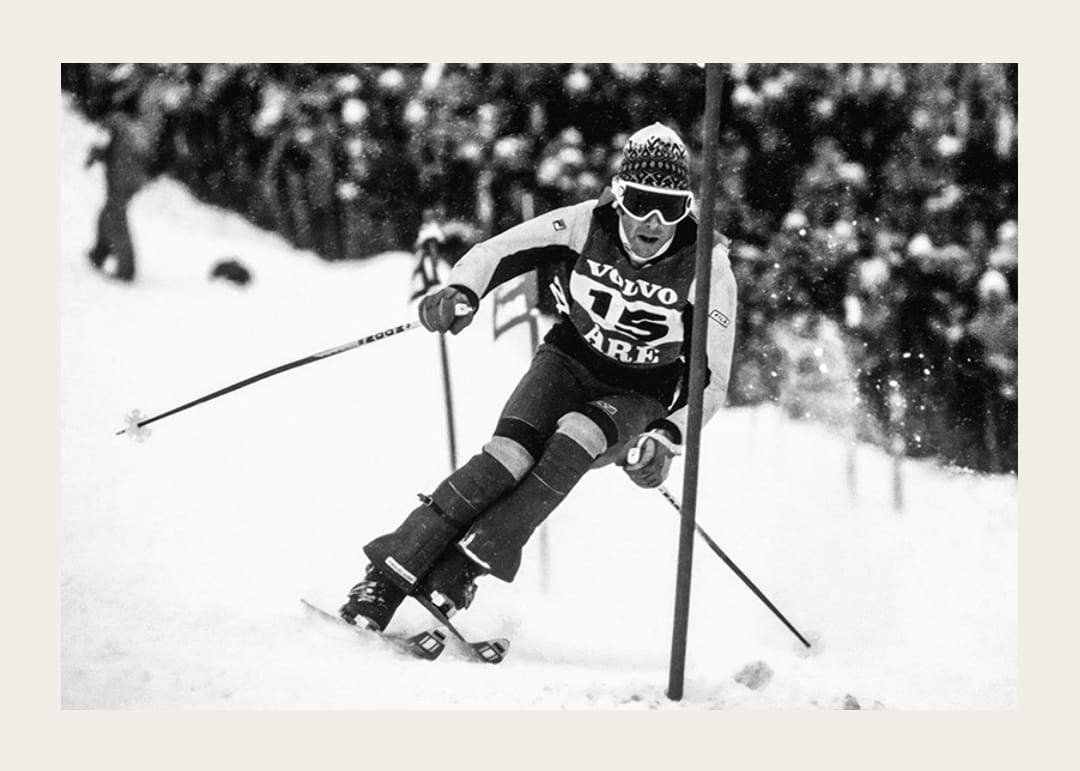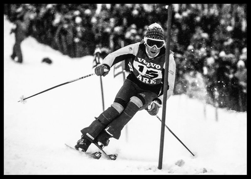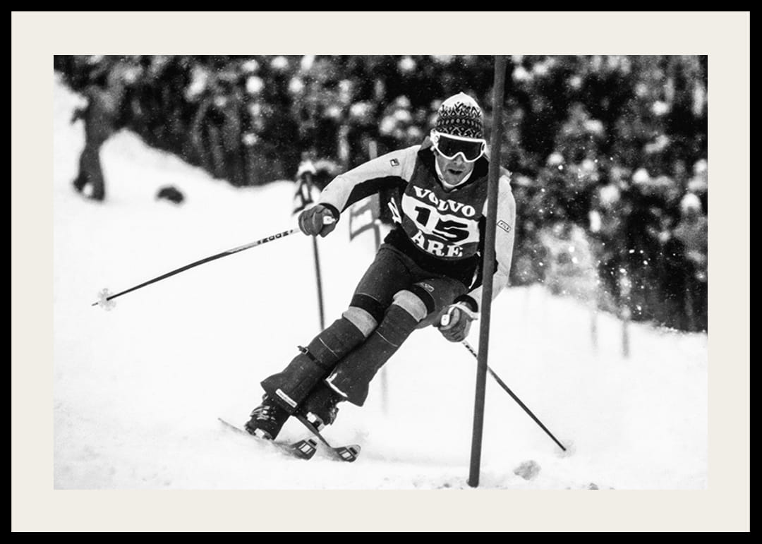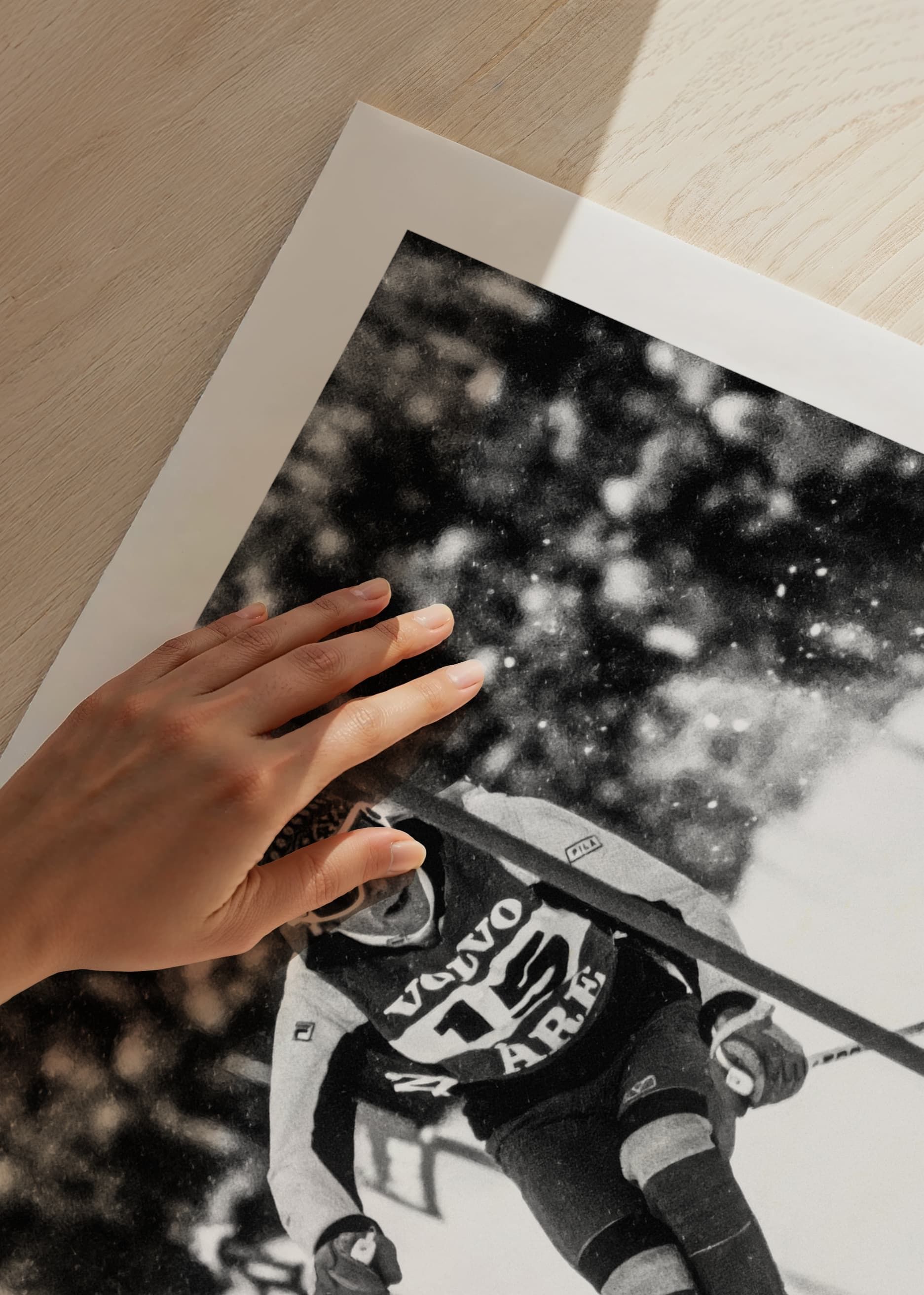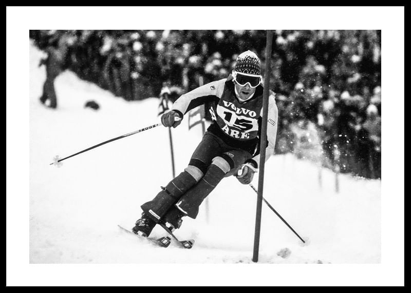 Svartvit poster med ett fotografi på den svenske alpina skidåkaren Ingemar Stenmark år 1979. Stenmark är en av tidernas allra främsta alpina skidåkare med sammanlagt två OS-guld, fem VM-guld och 86 världscupsegrar i disciplinerna slalom och storslalom.
