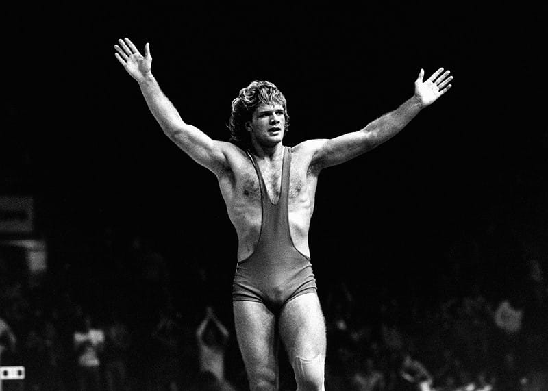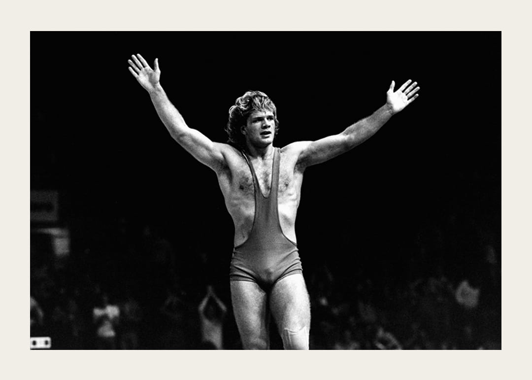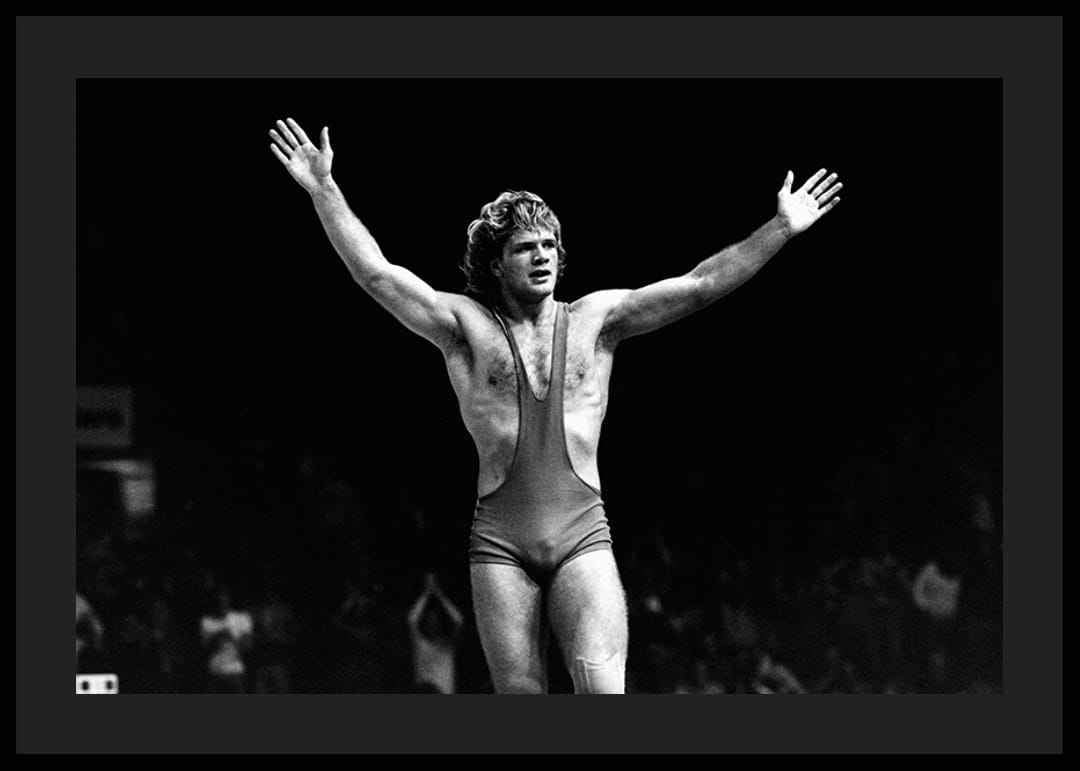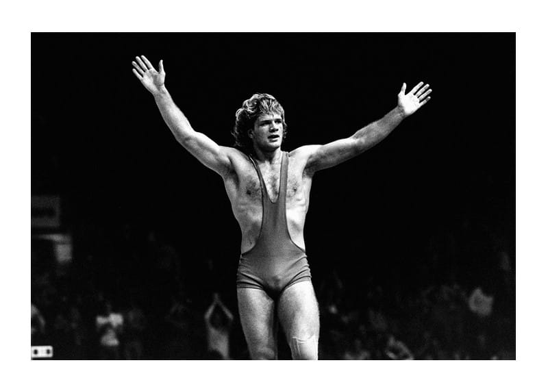 Svartvit poster med ett fotografi på den svenske brottaren Frank Andersson under VM i Göteborg 1977 där han tog guld efter att ha besegrat Dicu från Rumänien. Under sin framgångsrika brottningskarriär tog Andersson fyra EM-guld (1976, 1978, 1979, 1981), tre VM-guld (1977, 1979, 1982) och ett brons i OS 1984 i grekisk-romersk stil.