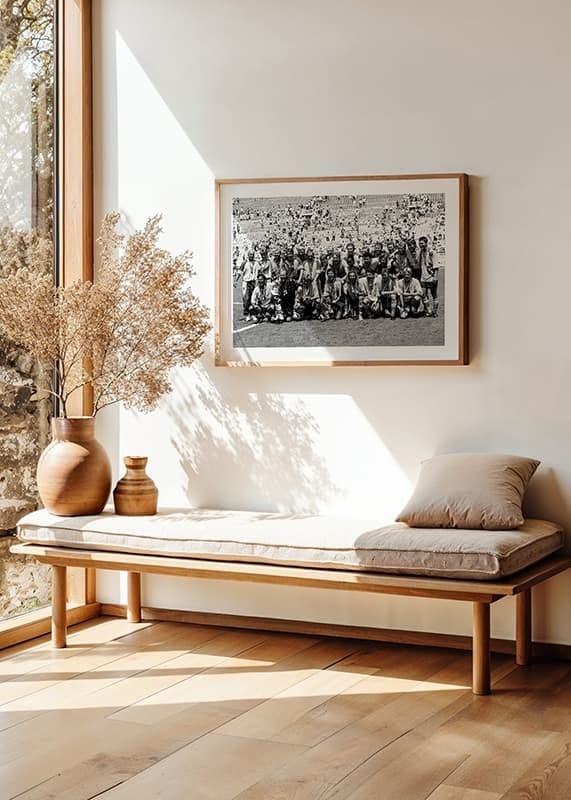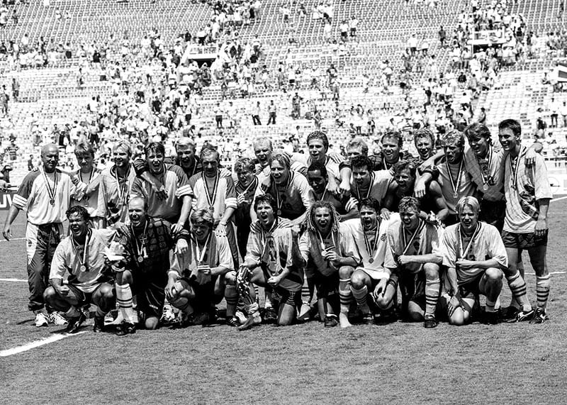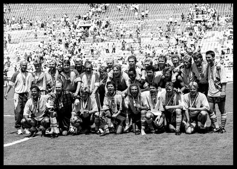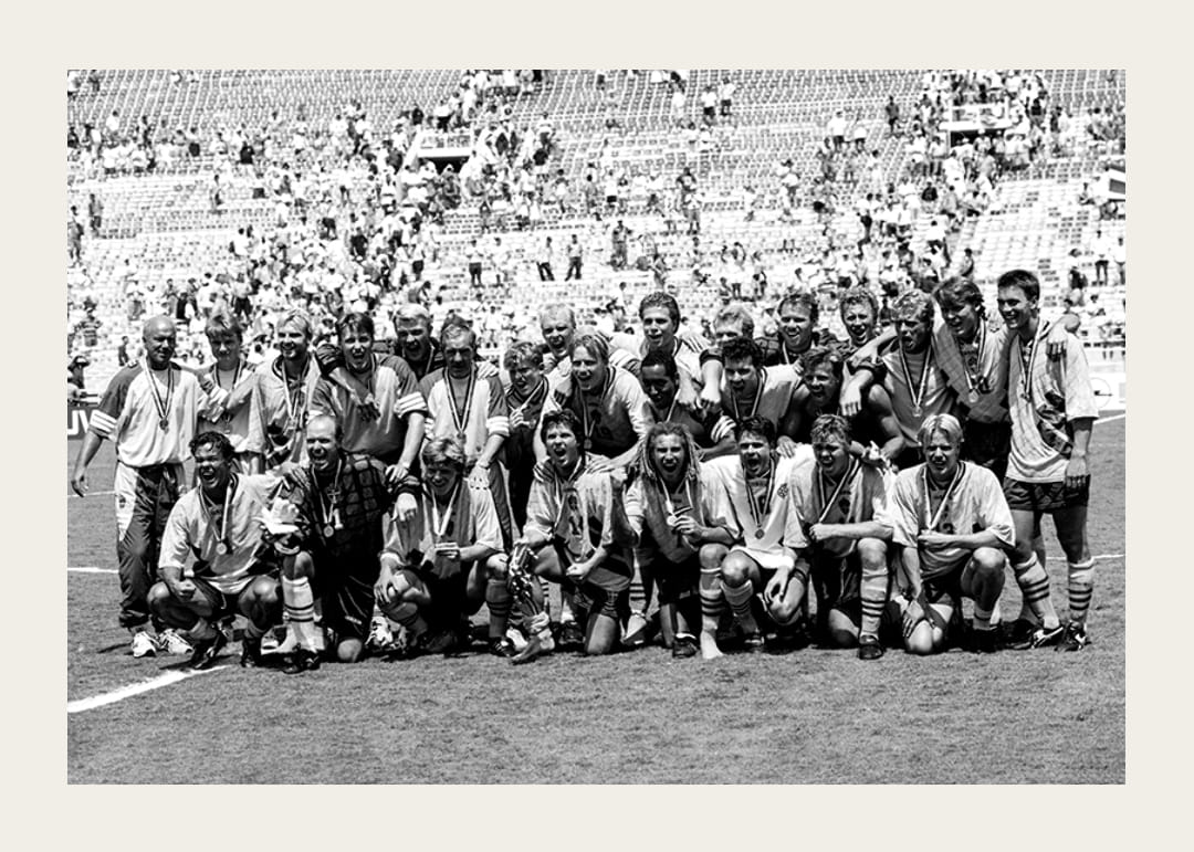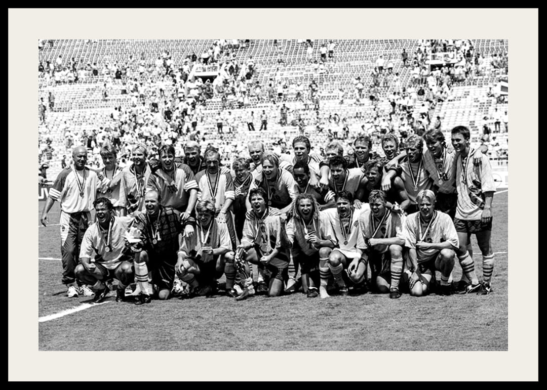 Svartvit poster med ett fotografi på det svenska fotbollslandslaget efter seger i bronsmatchen mot Bulgarien, Fotbolls-VM i USA, 1994. Bakre raden fr v Tommy Svensson, Hans Hultman, presschef, Håkan Mild, Roger Ljung, Magnus Hedman, Tord Grip, Jesper Blomqvist, Klas Ingesson, Kennet Andersson, Teddy Lucic, Martin Dahlin, Leif Andersson, sponsor, Stefan Rehn, Lasse Eriksson, Roland Nilsson, Sten-Ove Ringborg, massör, Jonas Thern, Magnus Erlingmark, Patrik Andersson. Främre raden fr v Joachim Björklund, Thomas Ravelli, Stefan Schwarz, Pontus Kåmark, Henrik Larsson, Anders Limpar, Tomas Brolin och Mikael Nilsson.