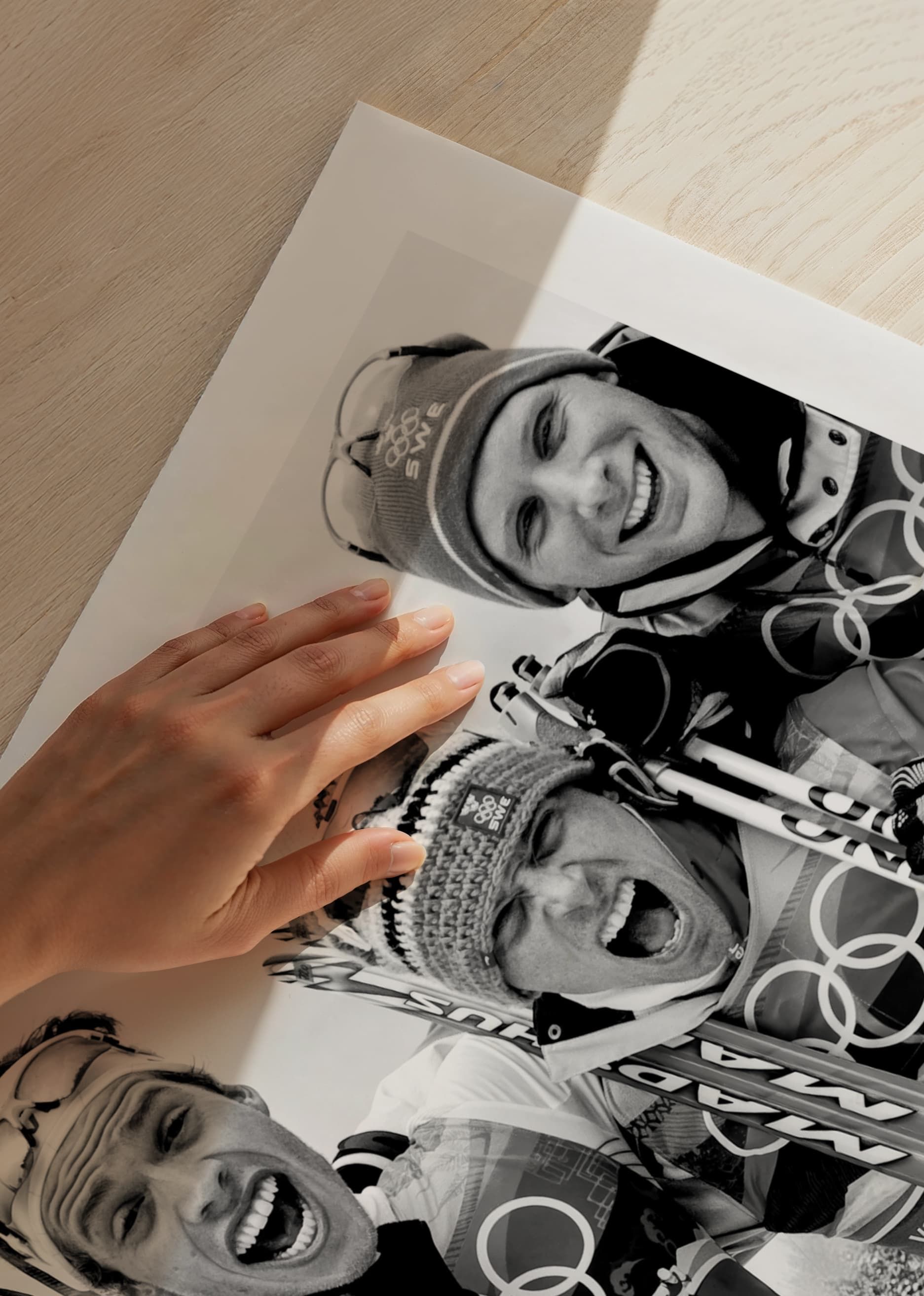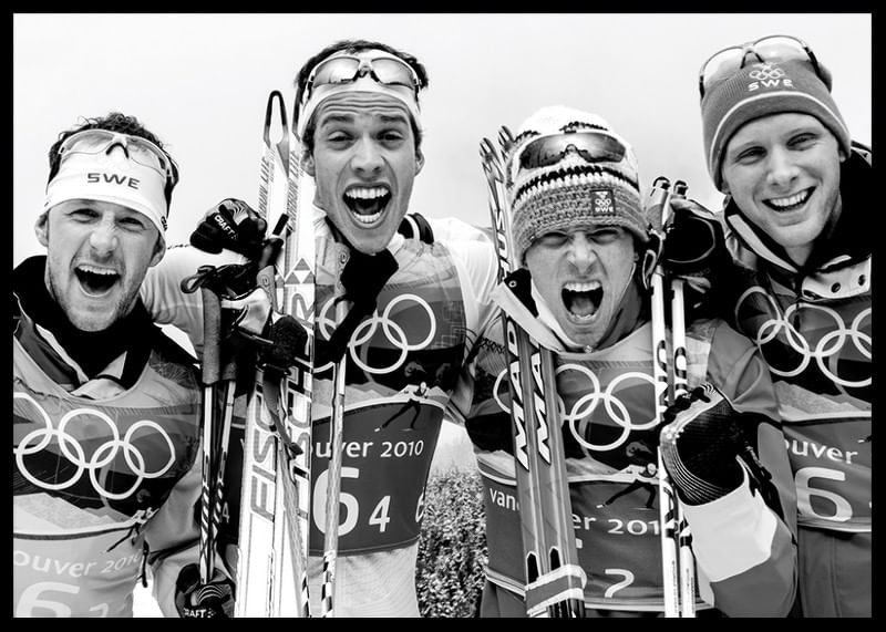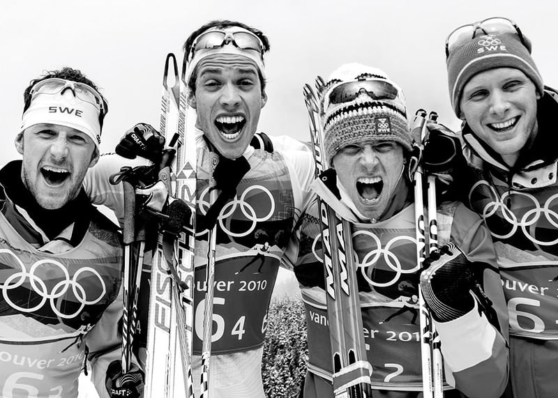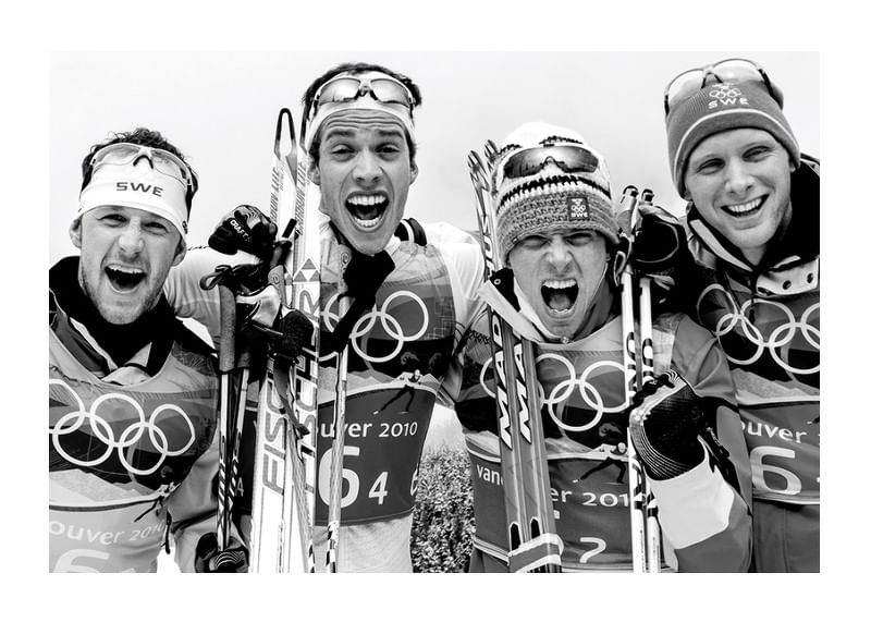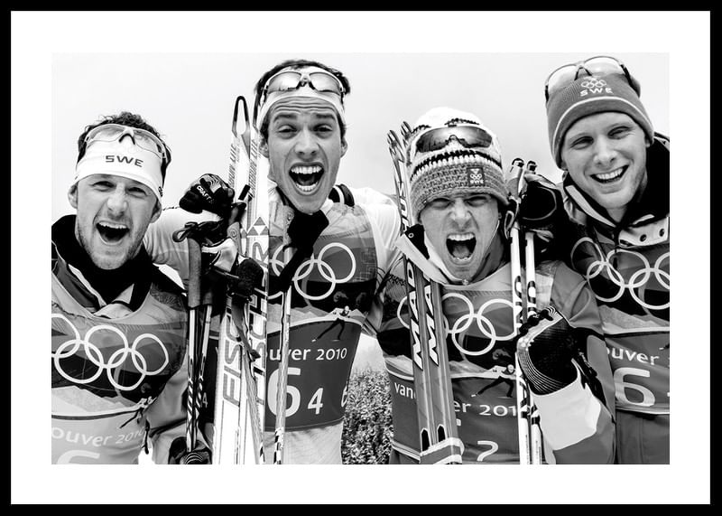 Svartvit poster med ett fotografi på det svenska stafettlaget med Anders Södergren, Marcus Hellner, Johan Olsson och Daniel Richardsson som tog guld i stafett under OS i Vancouver. Kanada, 2010.
