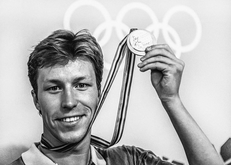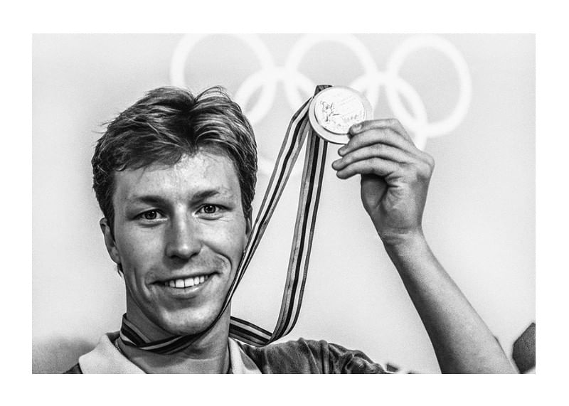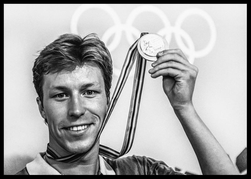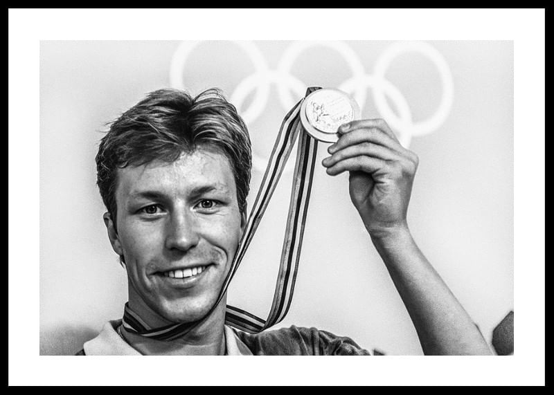 Svartvit poster med ett fotografi på den svenske bordtennisspelaren Jan-Ove Waldner med OS-guld från Barcelona år 1992. Waldner betraktas som en av världens genom tiderna bästa bordtennisspelare med OS-guld samt dubbla VM-guld i singel, fyra VM-guld i lag och sju Europa Top-12-segrar. Waldner är den förste personen, och hittills den enda, från ett icke-asiatiskt land som har vunnit ett OS-guld i bordtennis.
