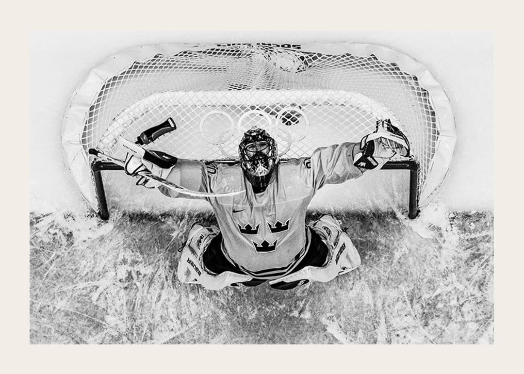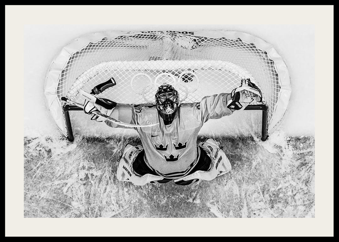 Svartvit poster med ett fotografi på Henrik Lundqvist, målvakt i svenska ishockeylandslaget, efter seger mot Finland i semifinalen av OS i Sotji år 2014.