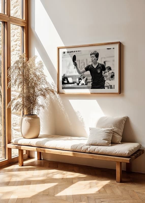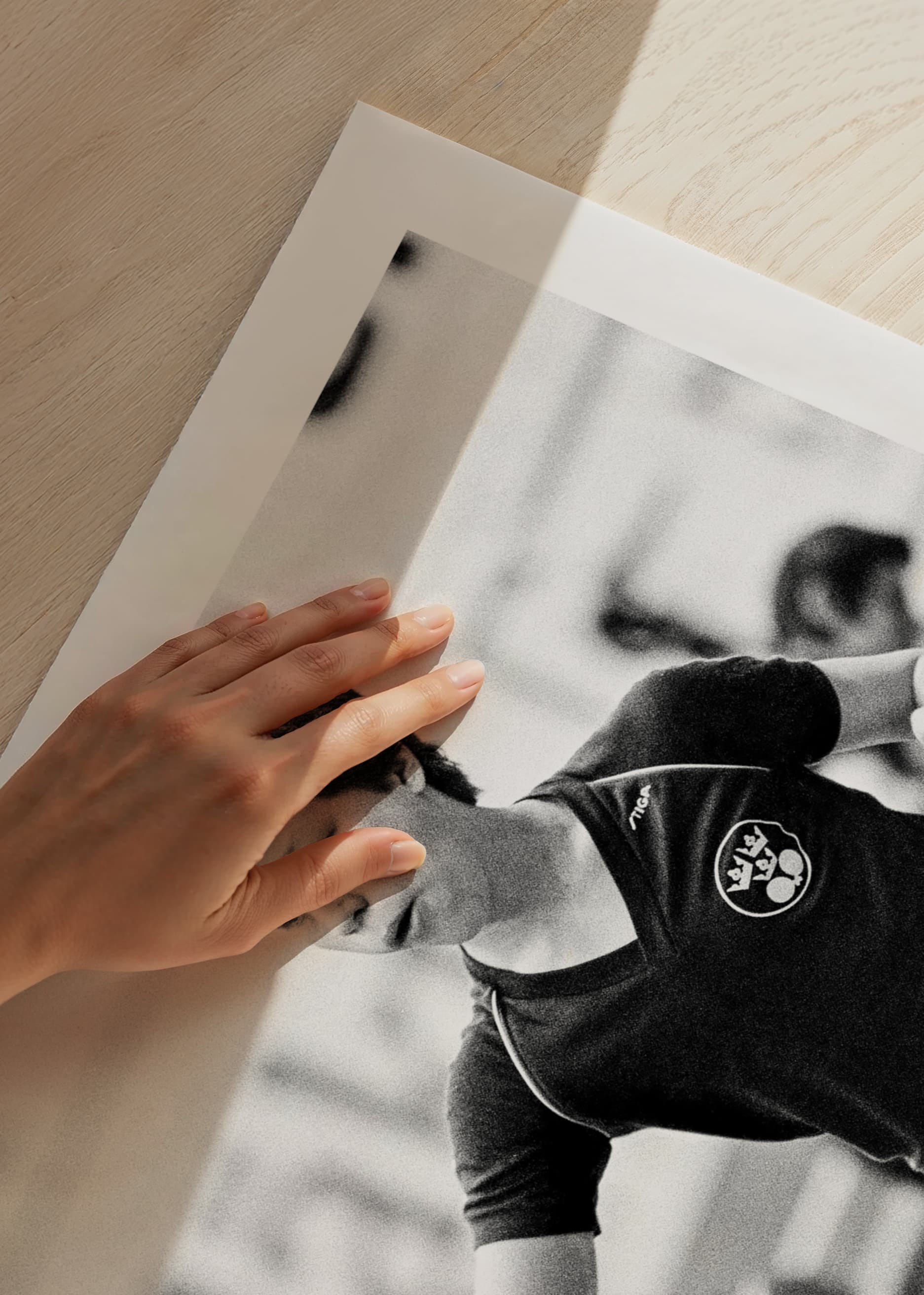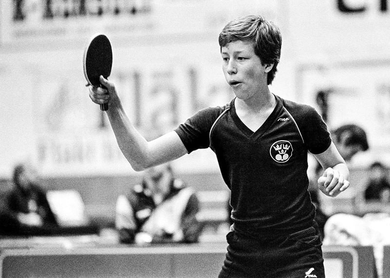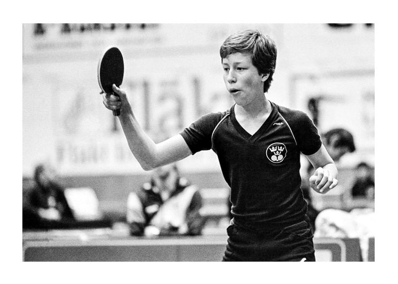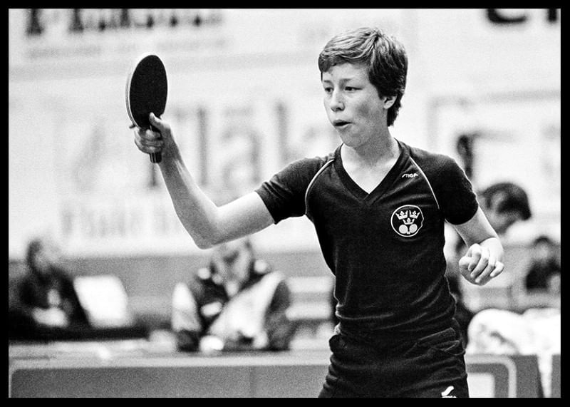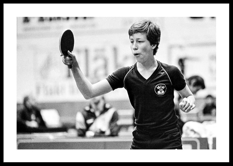 Svartvit affisch med ett fotografi på en ung Jan-Ove Waldner som spelar bordtennis år 1981.