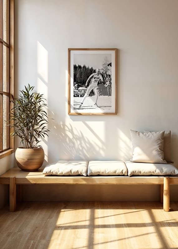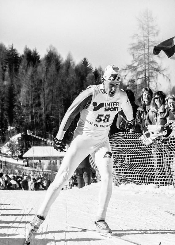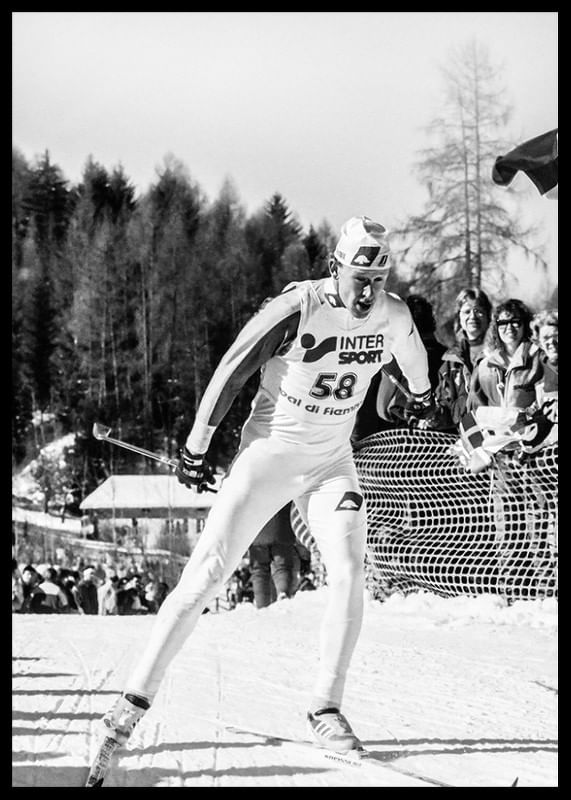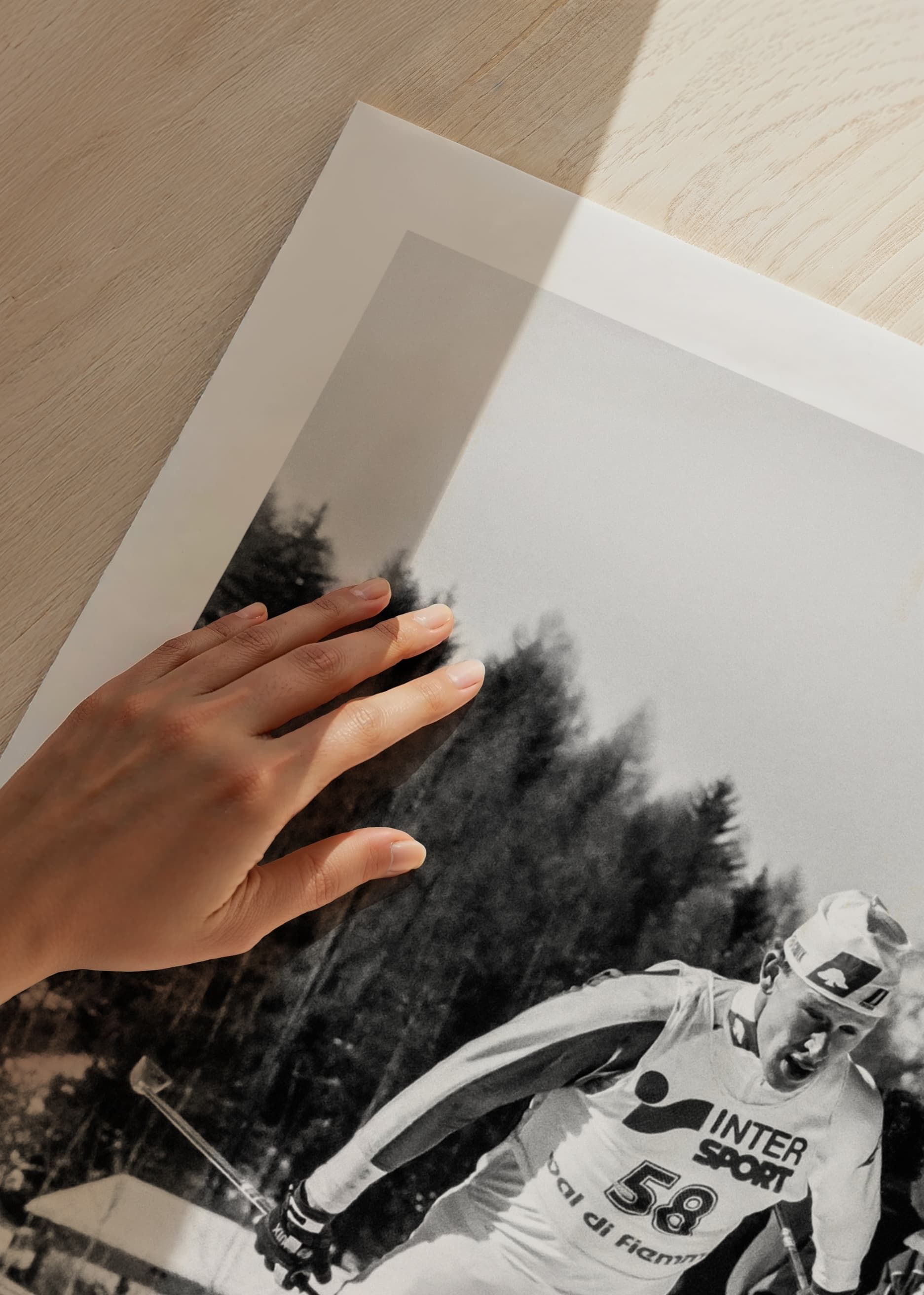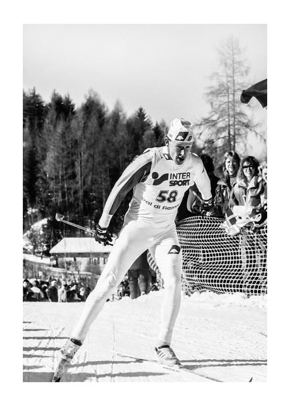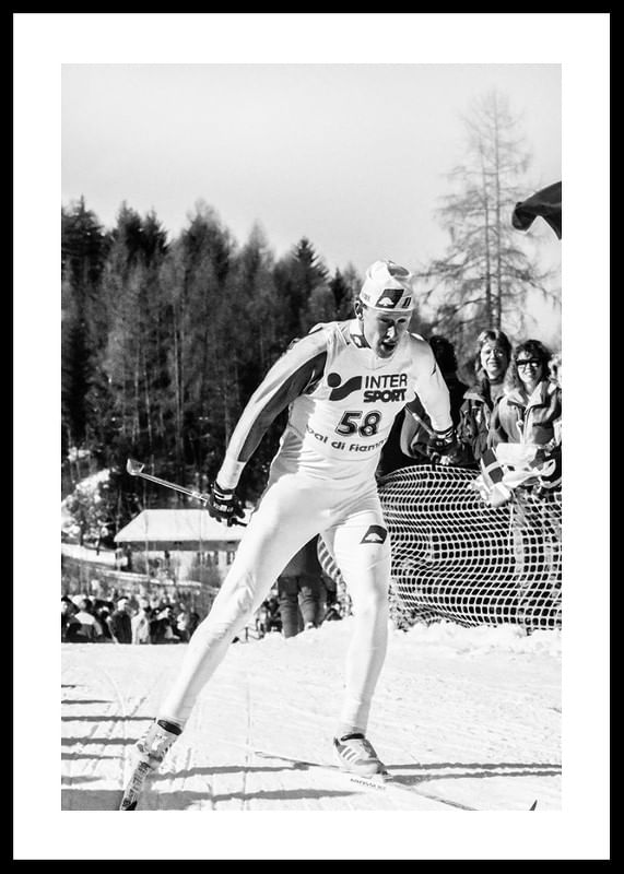 Svartvit poster med ett fotografi på Gunde Svan under skid-VM i Val di Fiemme år 1991. Han vann fyra olympiska guldmedaljer och sju VM-guld under 1980-talet och början av 1990-talet och är en av världens främsta längdskidåkare genom tiderna.