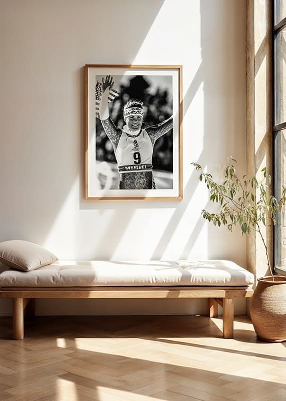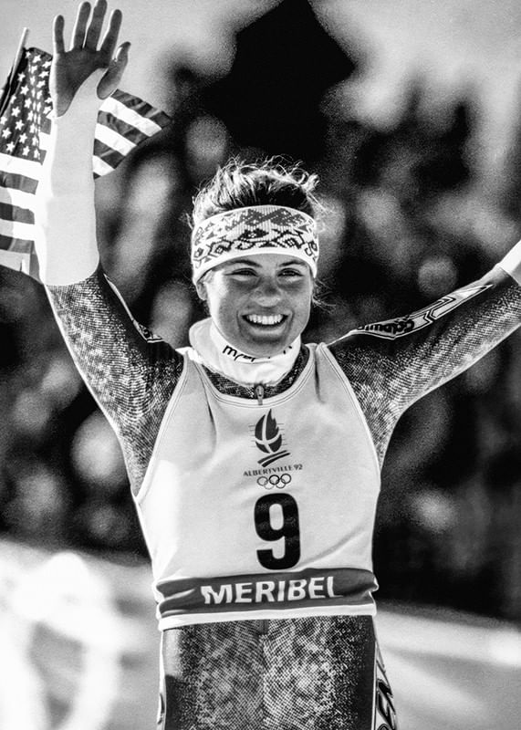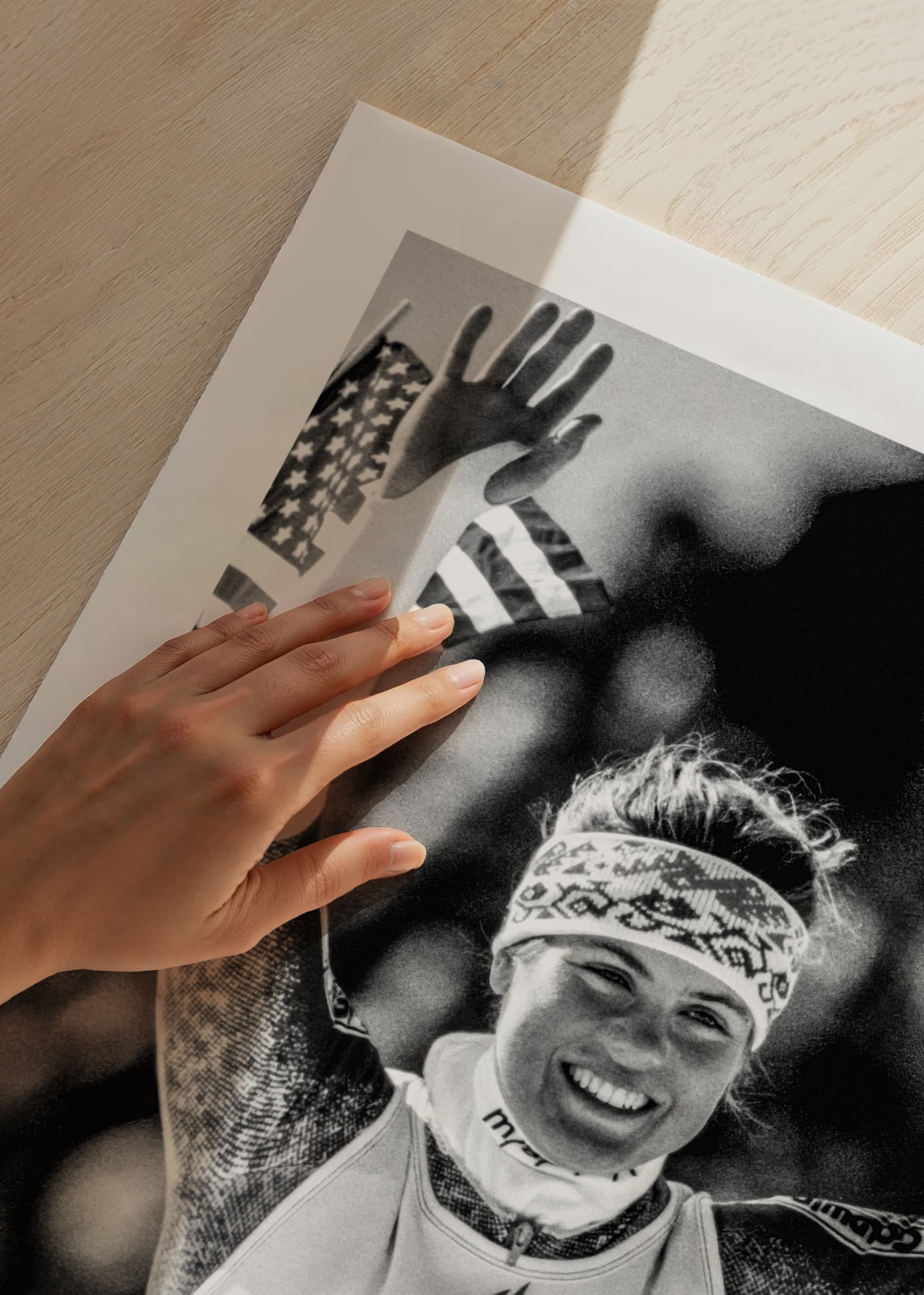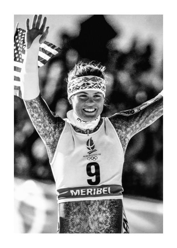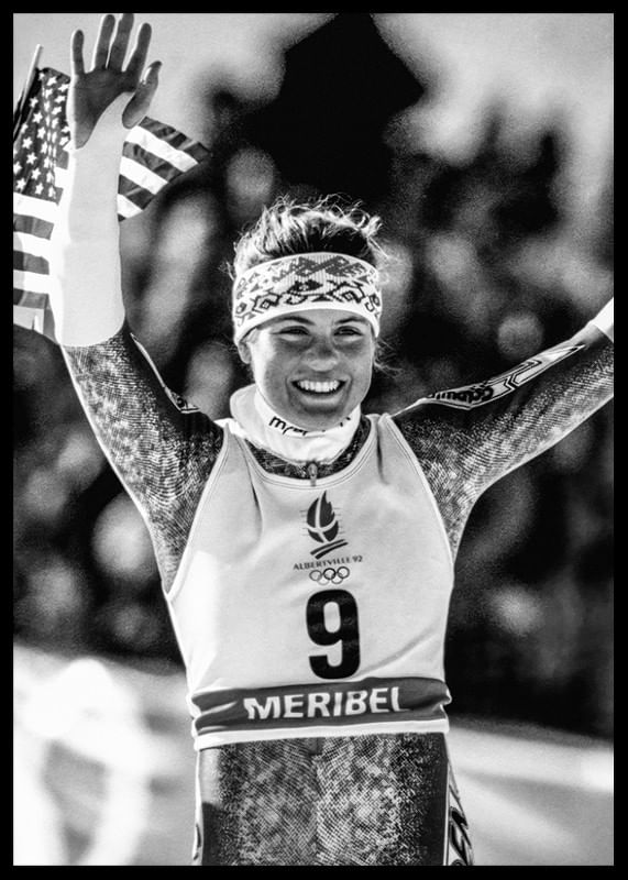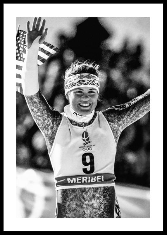 Svartvit poster med ett fotografi på Pernilla Wiberg under OS i Albertville, Frankrike, år 1992 där hon tog guld i storslalom.