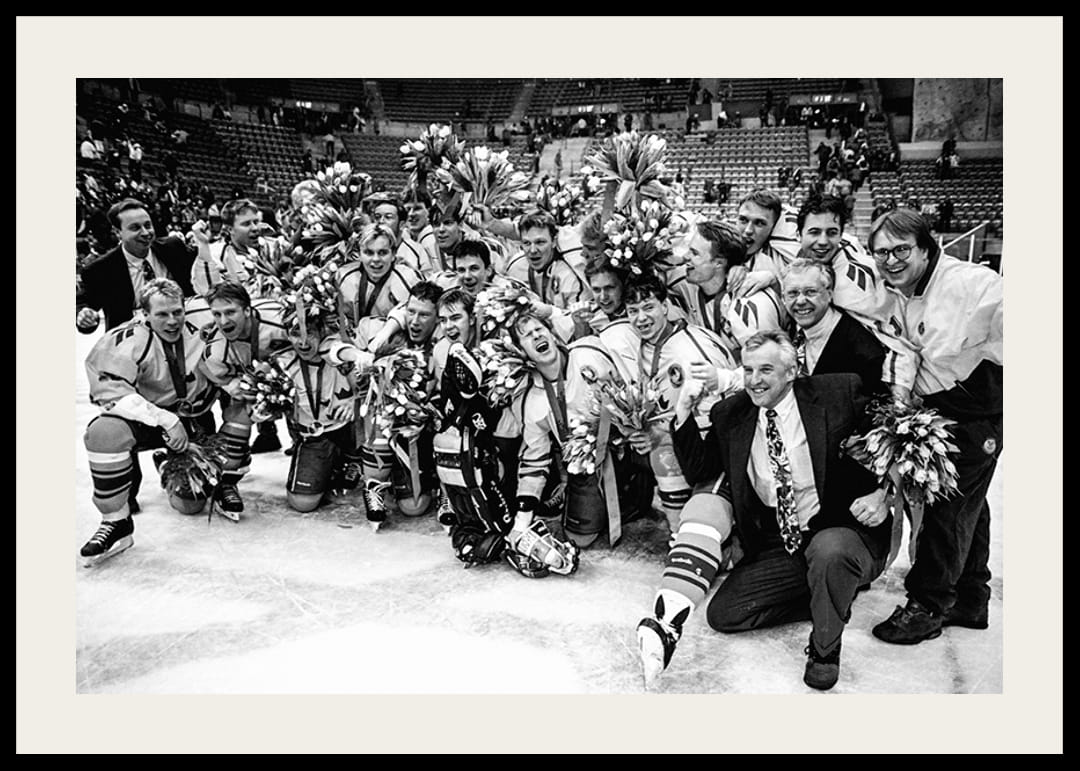 Svartvit poster med ett fotografi på Sveriges Ishockeylag från OS i Lillehammer år 1994 där Sverige tog guld efter att ha besegrat Kanada i finalen.