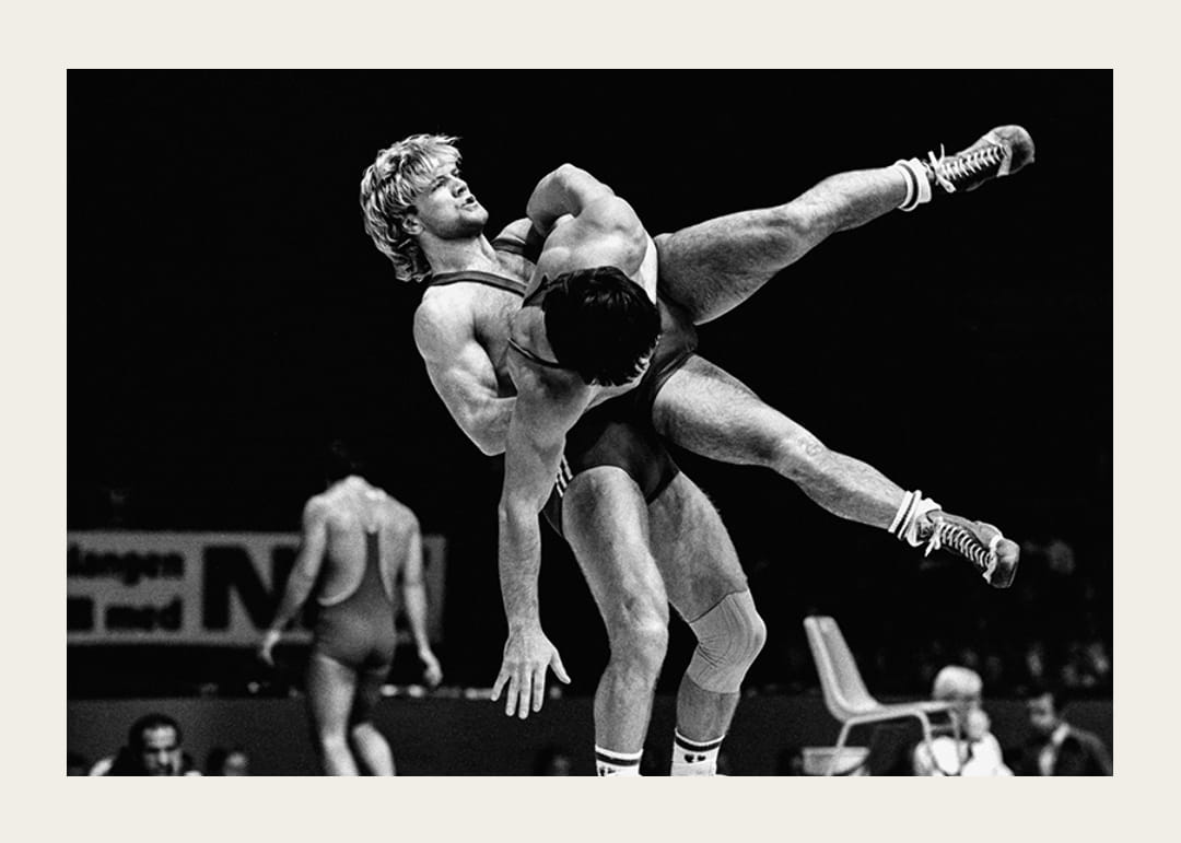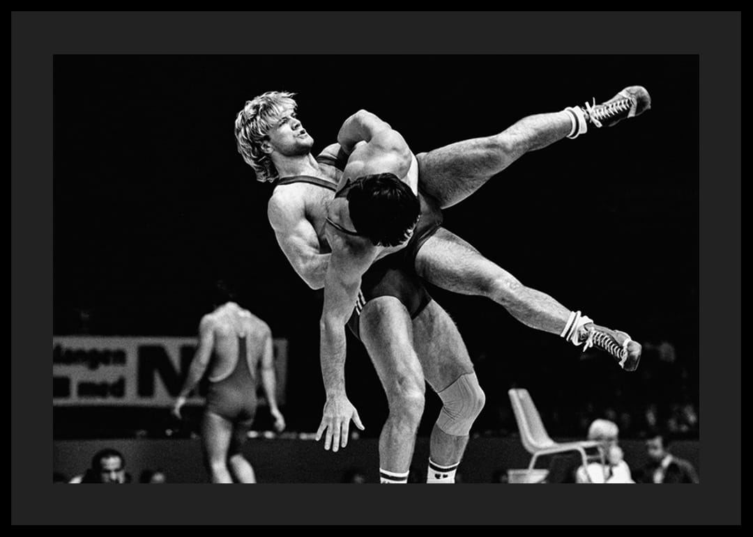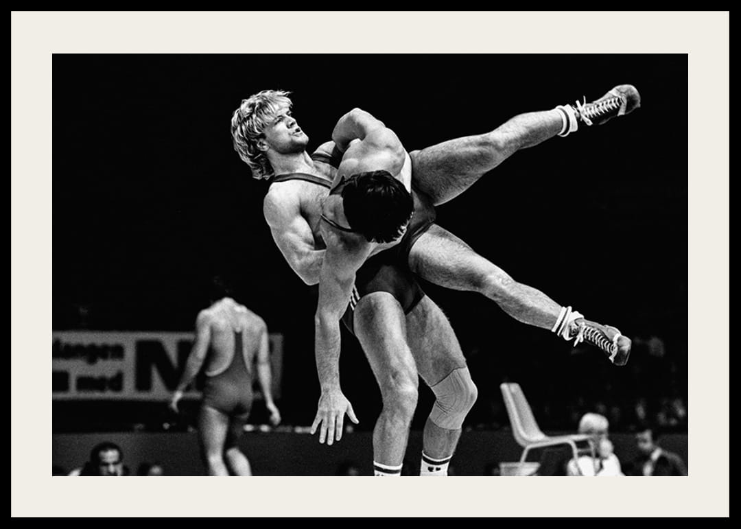 Svartvit poster med ett fotografi på legendariske brottaren Frank Andersson under VM i Göteborg år 1977.
