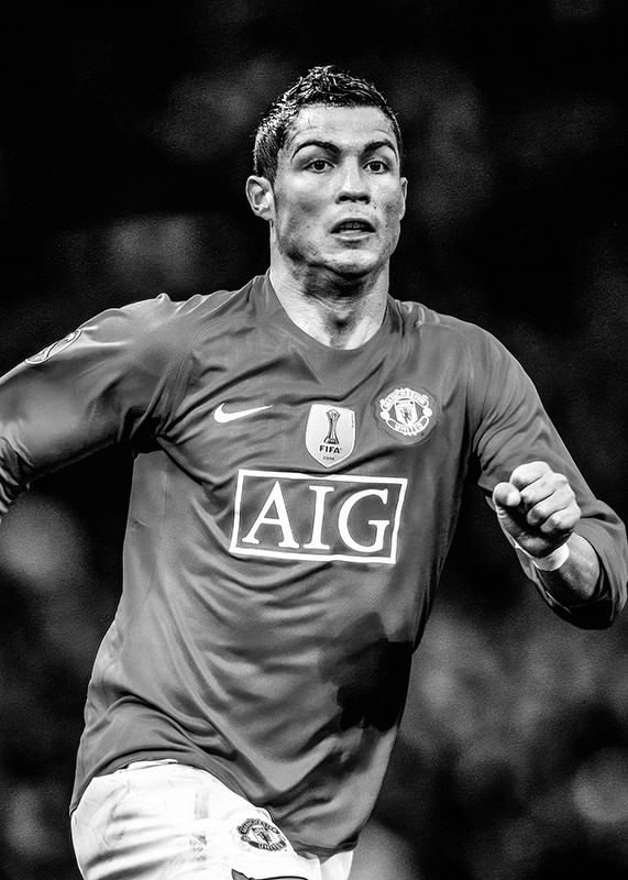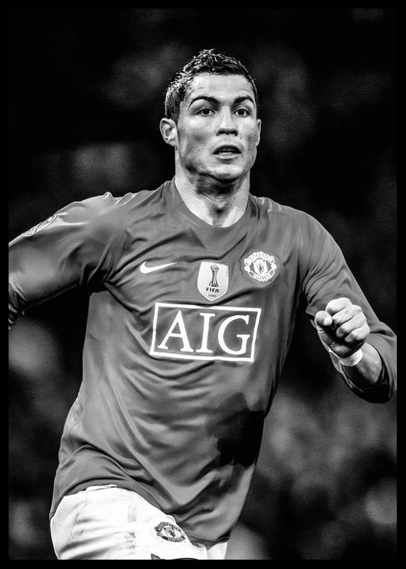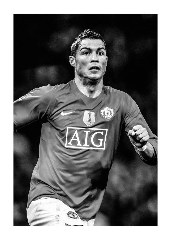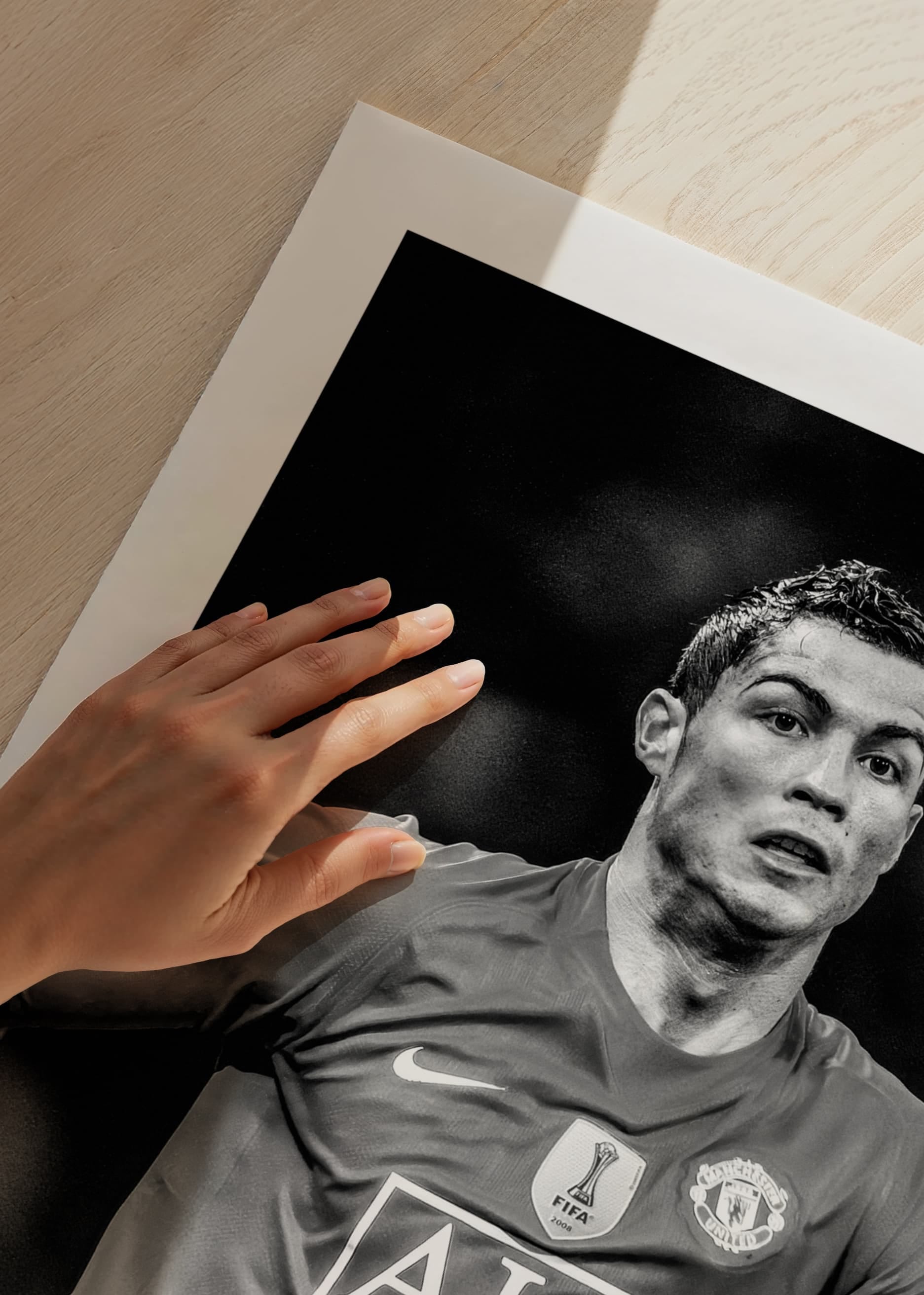 Svartvit poster med ett fotografi på portugisiske fotbollsstjärnan Cristiano Ronaldo i Manchester United år 2009.
