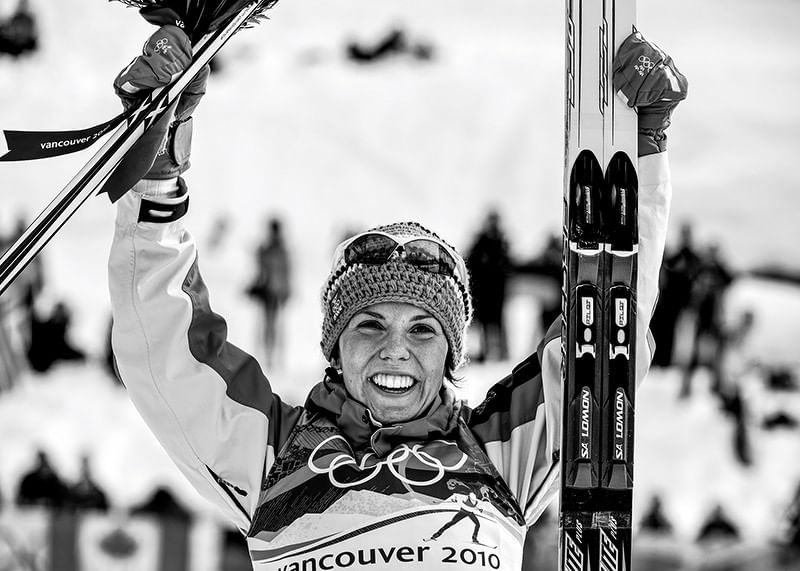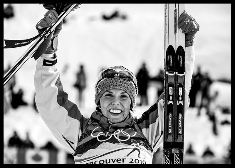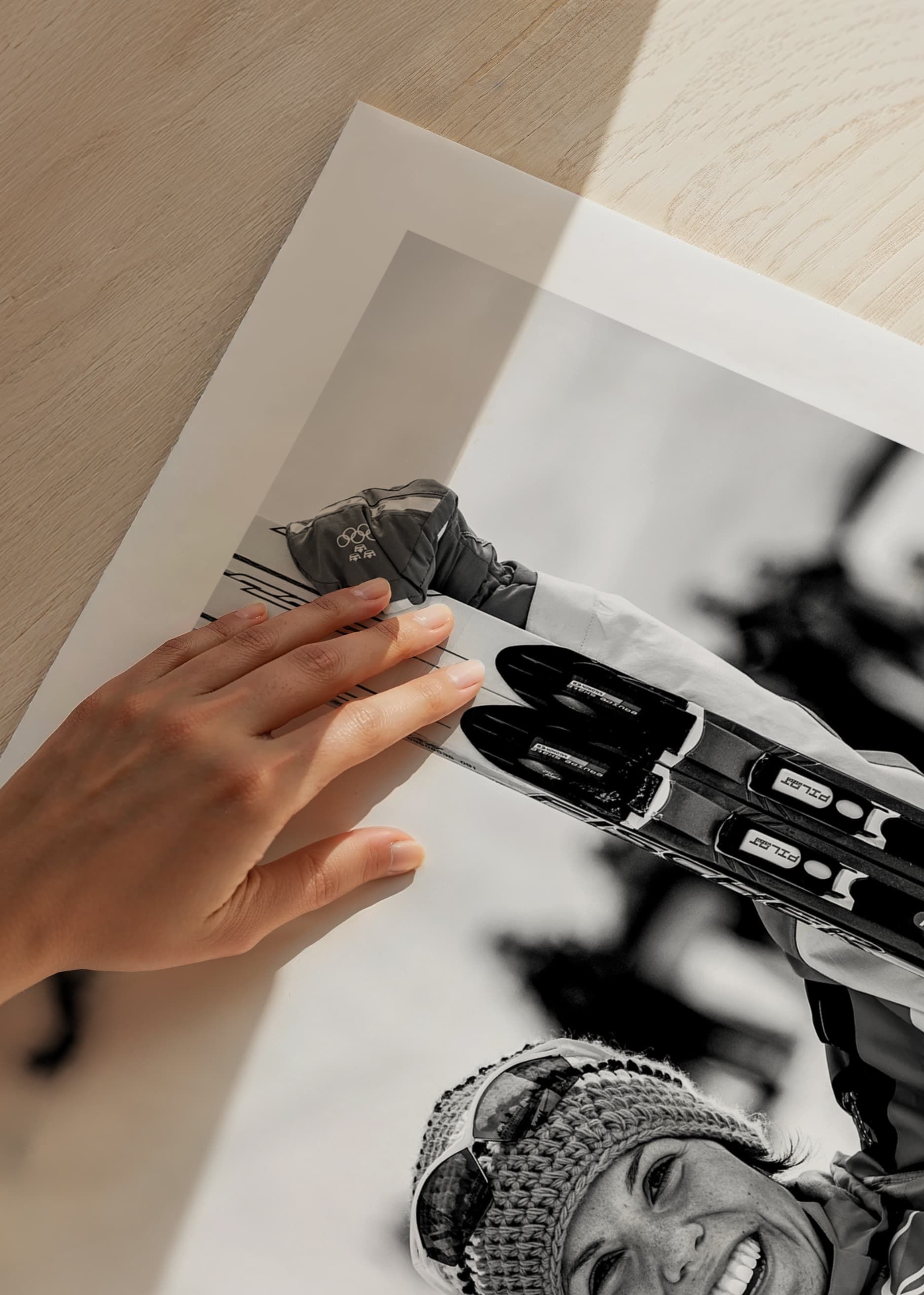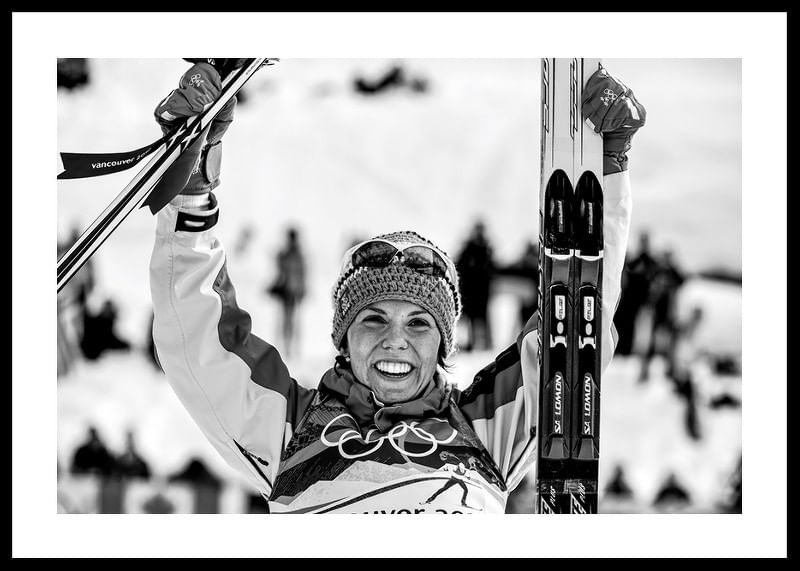 Svartvit poster med ett fotografi på Charlotte Kalla efter OS-guld på 10 km fristil i Vancouver, Kanada, år 2010.