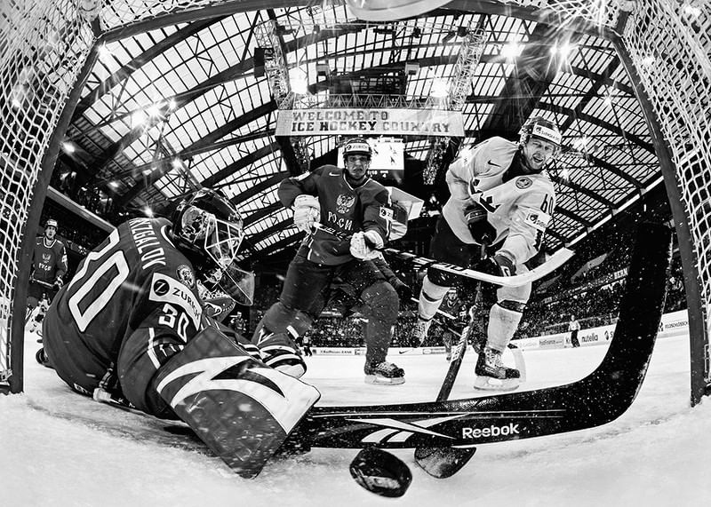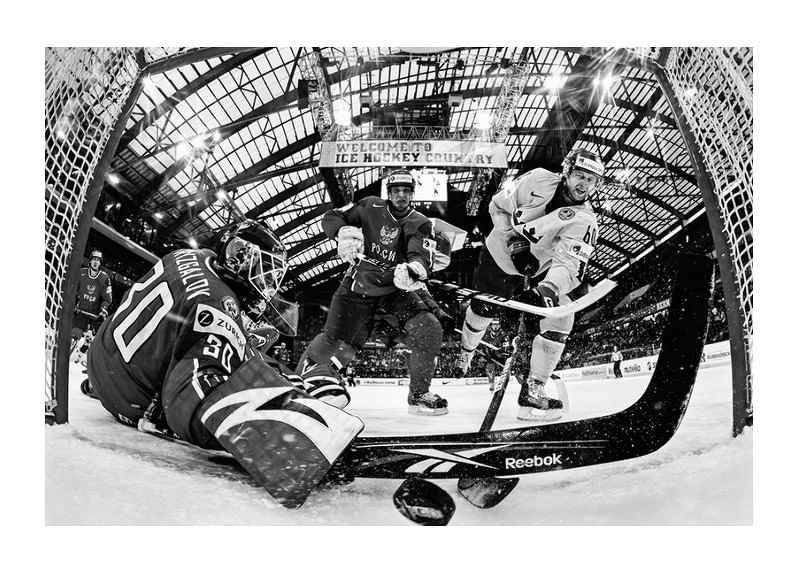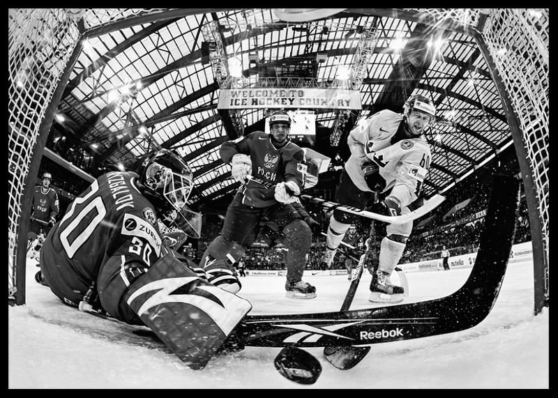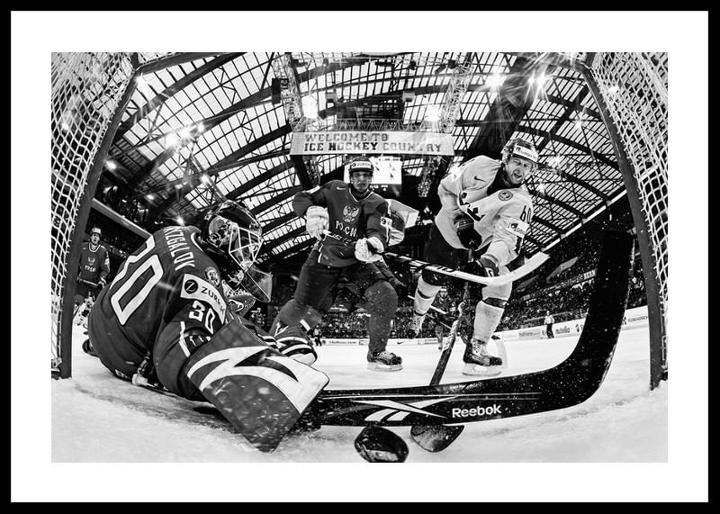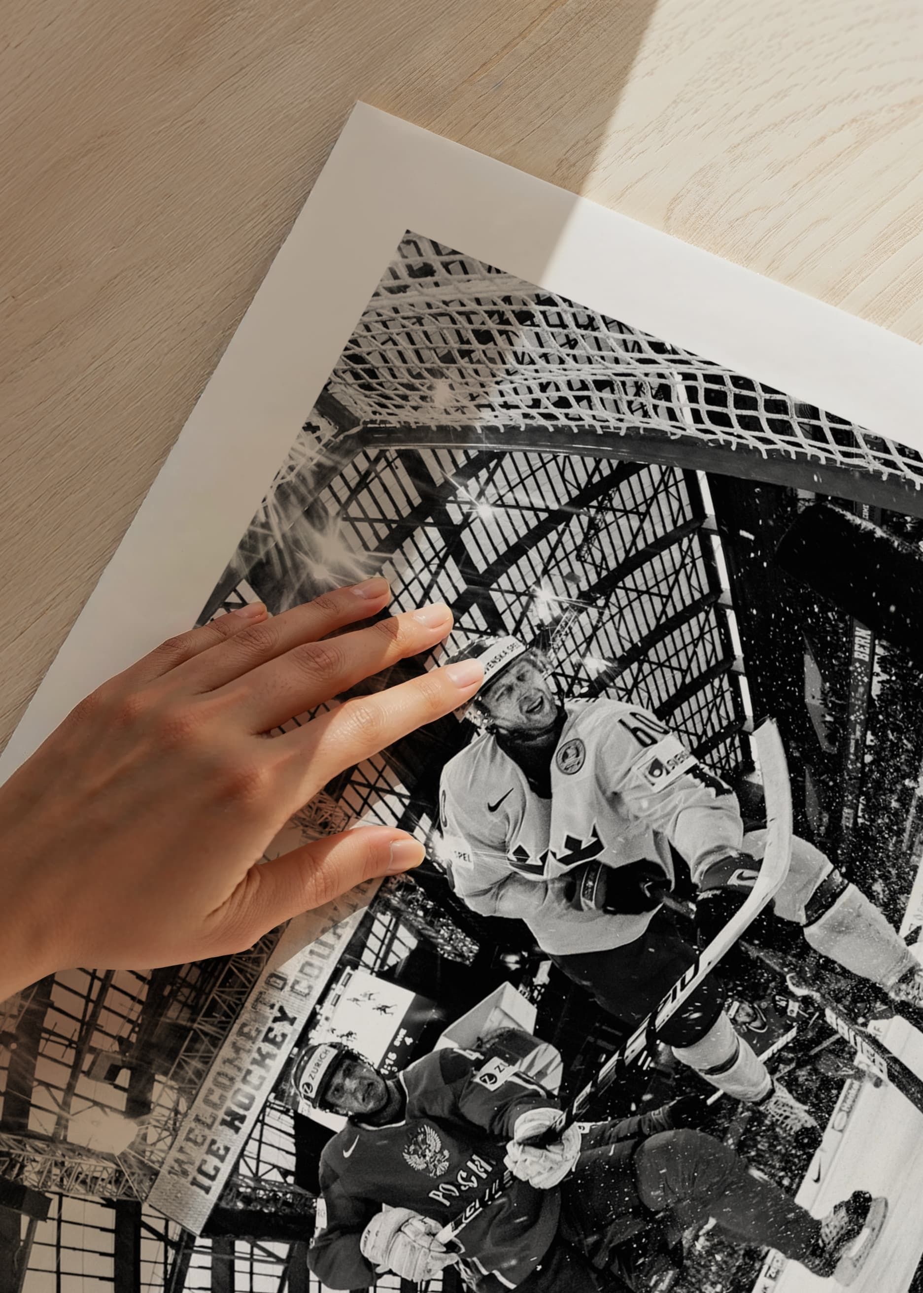 Svartvit affisch med ett fotografi på Kristian Huselium i svenska ishockeylandslaget som gör 5-5 på Ilya Bryzgalov, målvakt, under ishockey-VM i Ryssland.