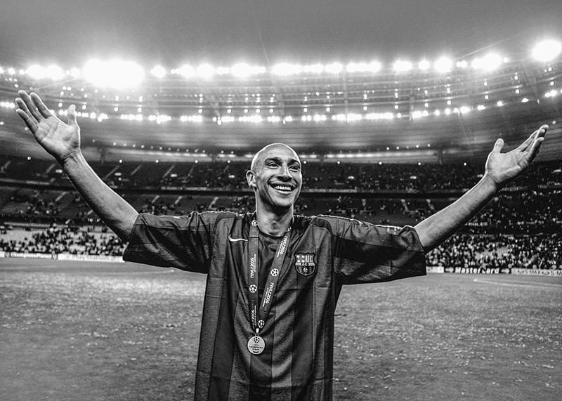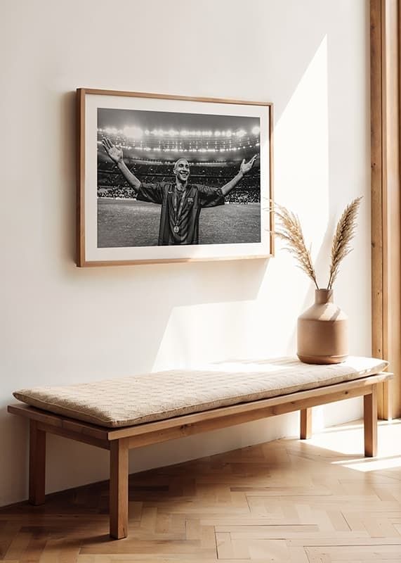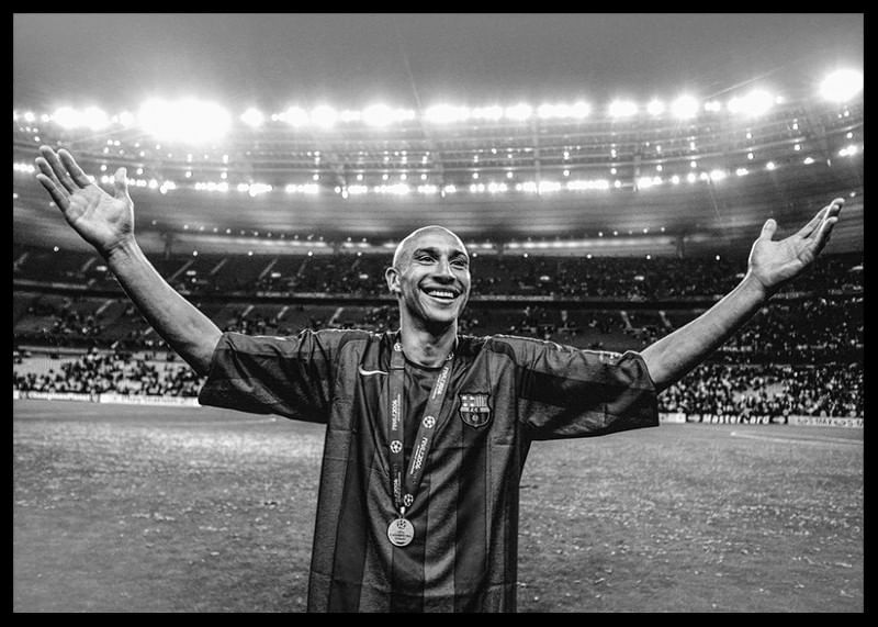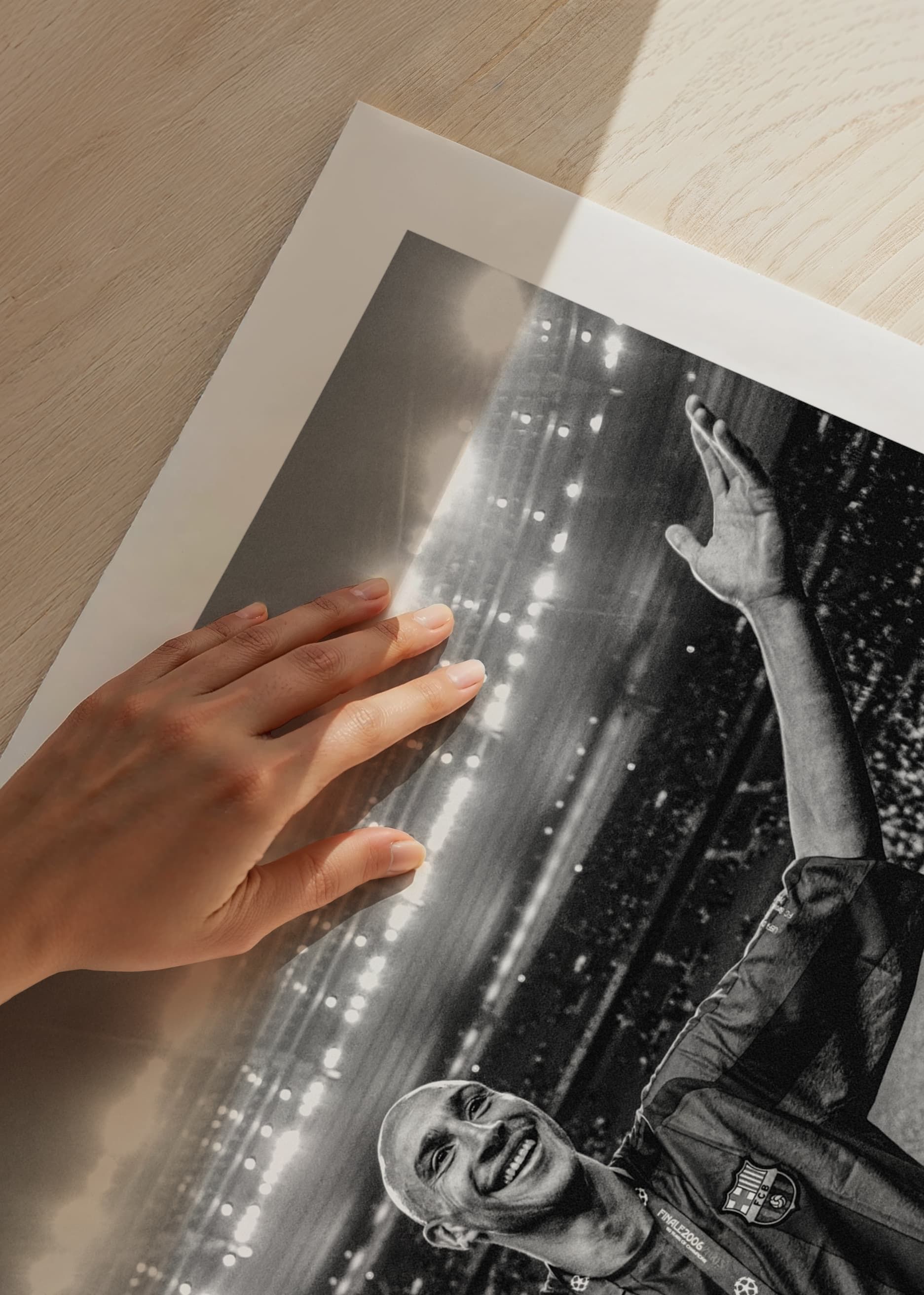 Svartvit affisch med ett fotografi på svenske fotbollsspelaren Henrik Larsson i FC Barcelona som firar segern i Champions League på Stade de France i Paris över Arsenal år 2006.