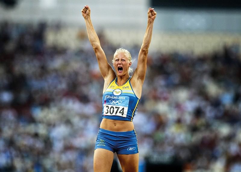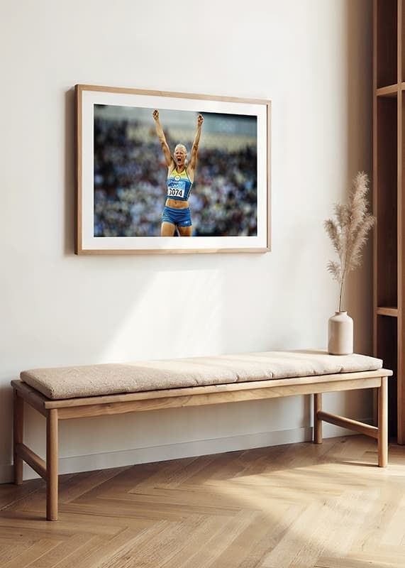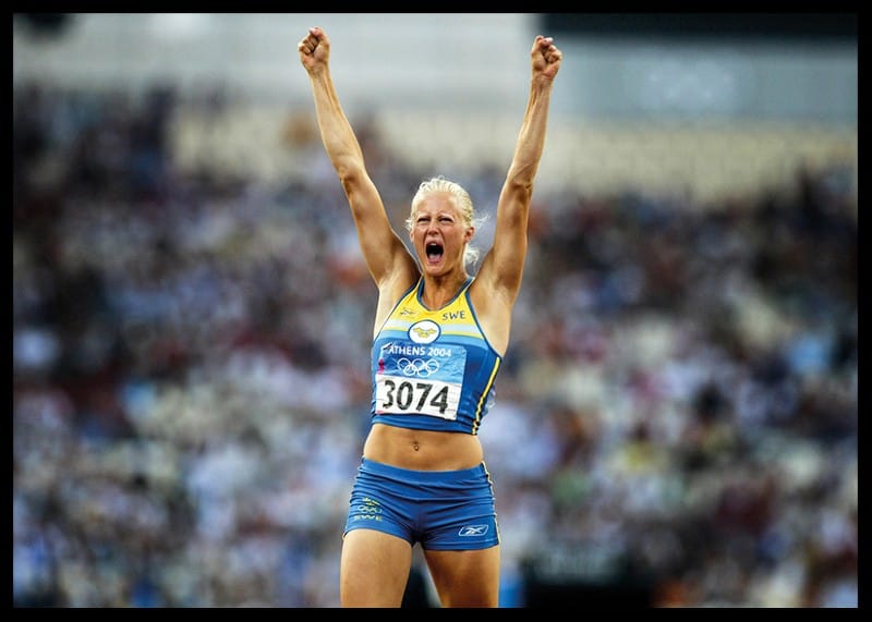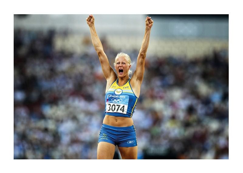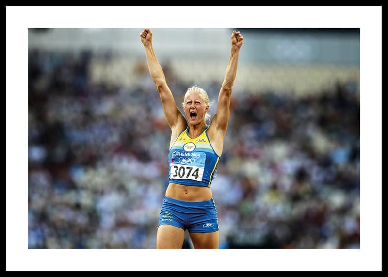 Poster med ett fotografi på den svenska friidrottsstjärnan Carolina Klüft från Olympiska spelen i Aten år 2004 där hon tog guld i sjukamp. Klüft är innehavare av det svenska rekordet, europarekordet (med 7 032 poäng noterat den 26 augusti 2007 vid friidrotts-VM i Osaka) och juniorvärldsrekordet i sjukamp. Hon den yngsta friidrottaren hittills som erövrat samtliga fem internationella guldmedaljer: Olympiska spelen, världsmästerskap (inom- och utomhus) och Europamästerskap (inom- och utomhus).