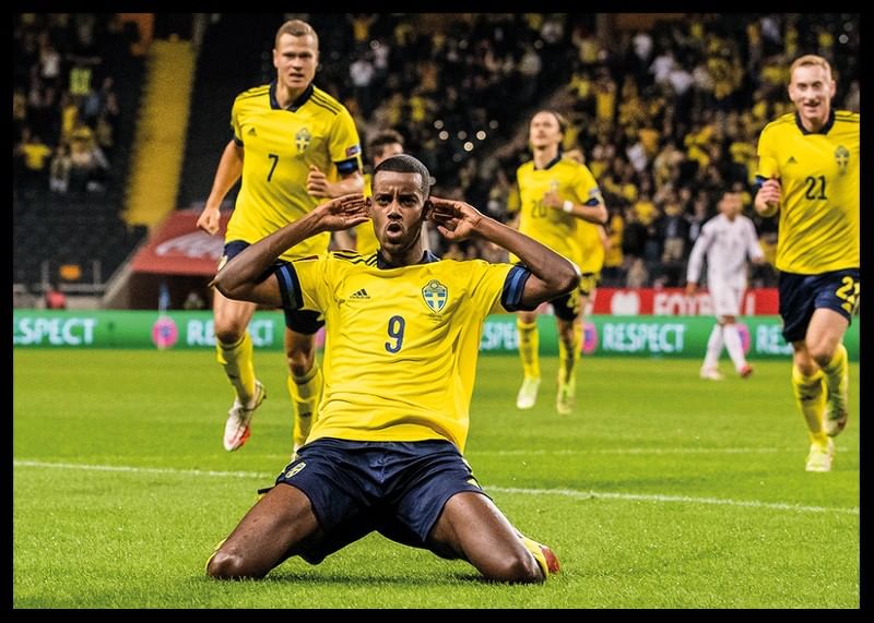 Poster med ett fotografi på Alexander Isak i det svenska landslaget som firar att han gjort 1-1 mot Spanien i vm-kvalet i Stockholm år 2021.