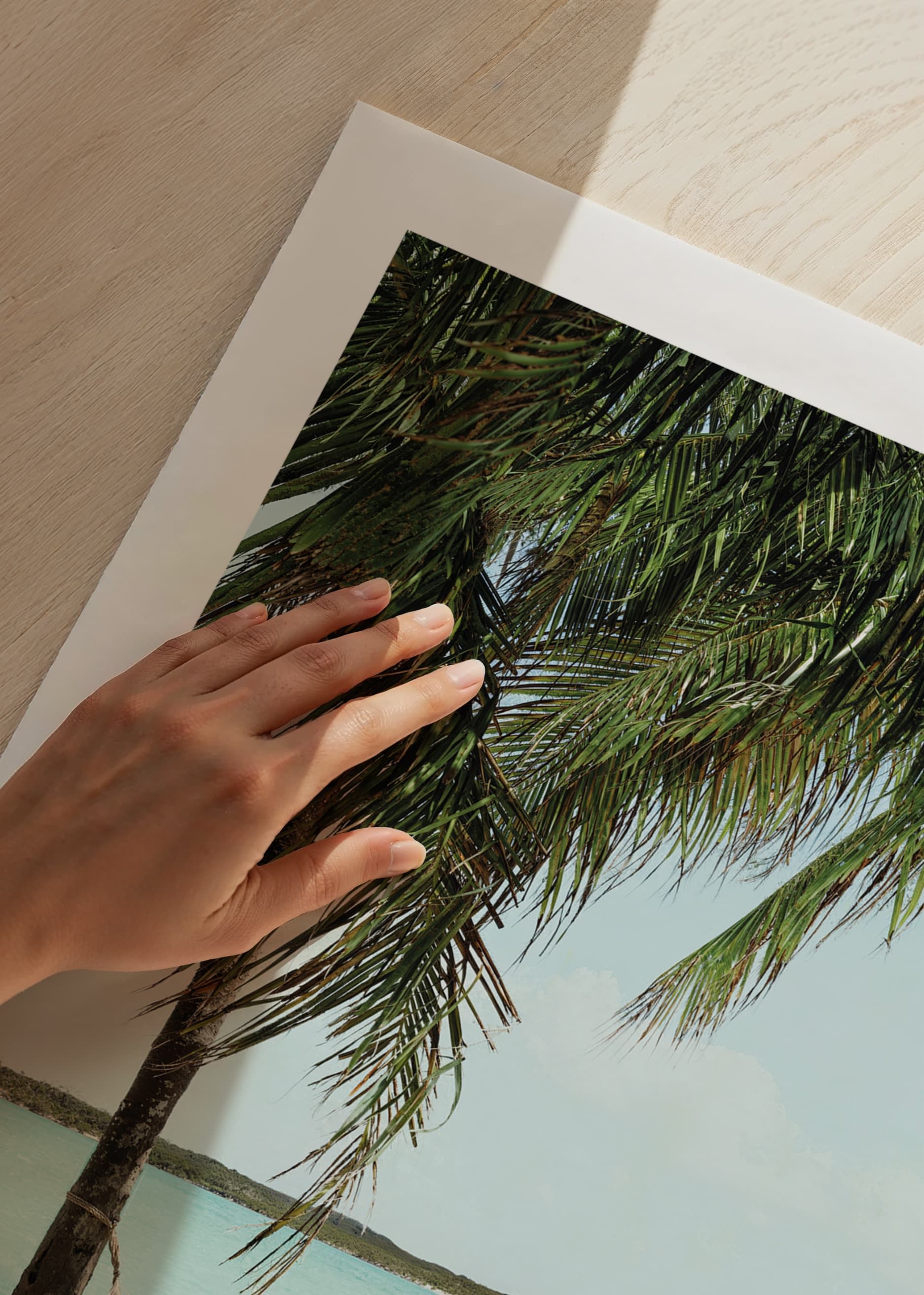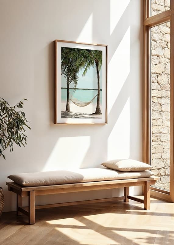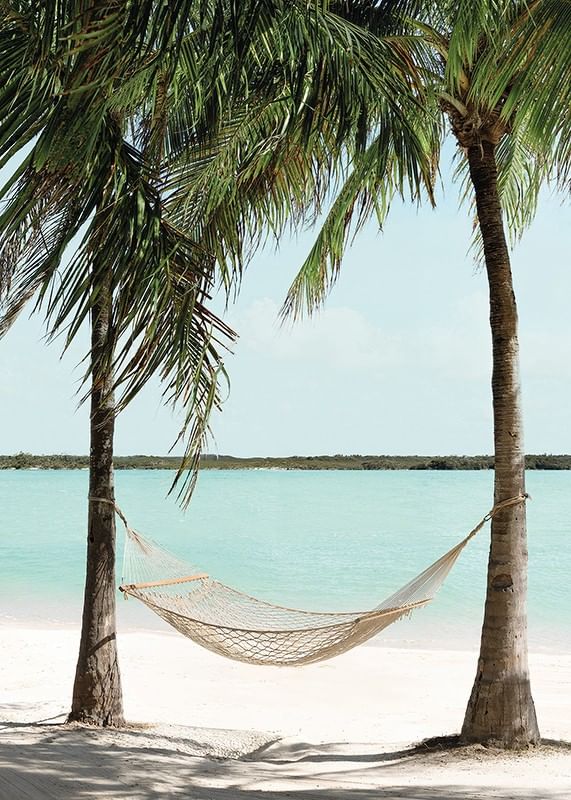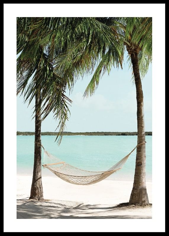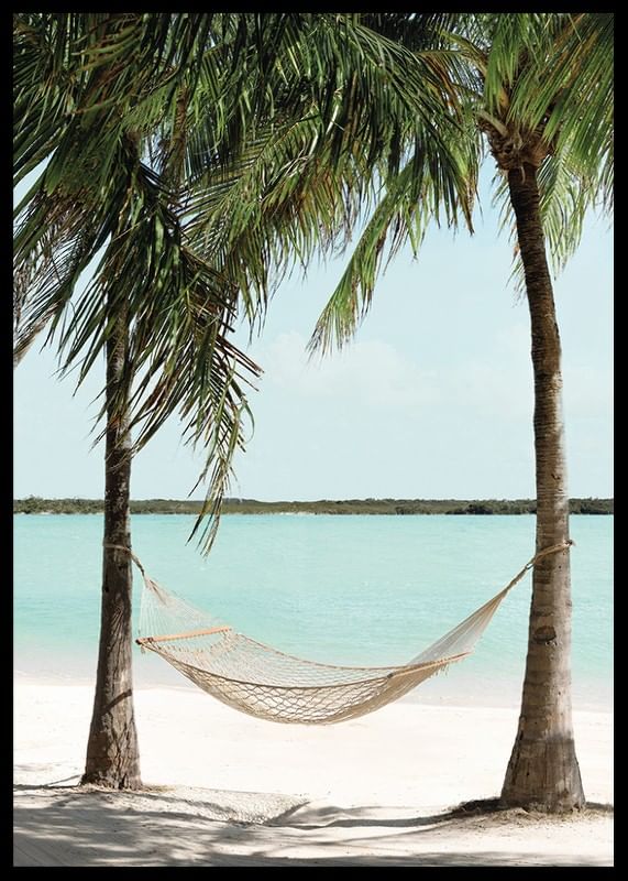 Dröm dig bort till tropiska stränder med denna avkopplande poster. En hängmatta spänd mellan två palmer vid det turkosa vattnet skapar en känsla av ro och semester. Perfekt för att förvandla ditt hem till en fridfull oas och bjuda in till dagdrömmeri.