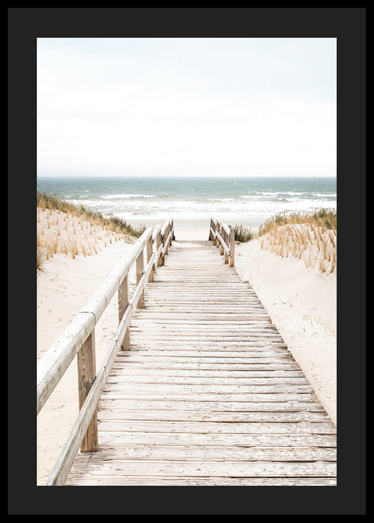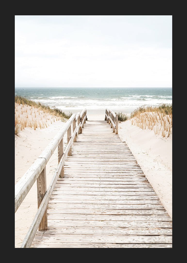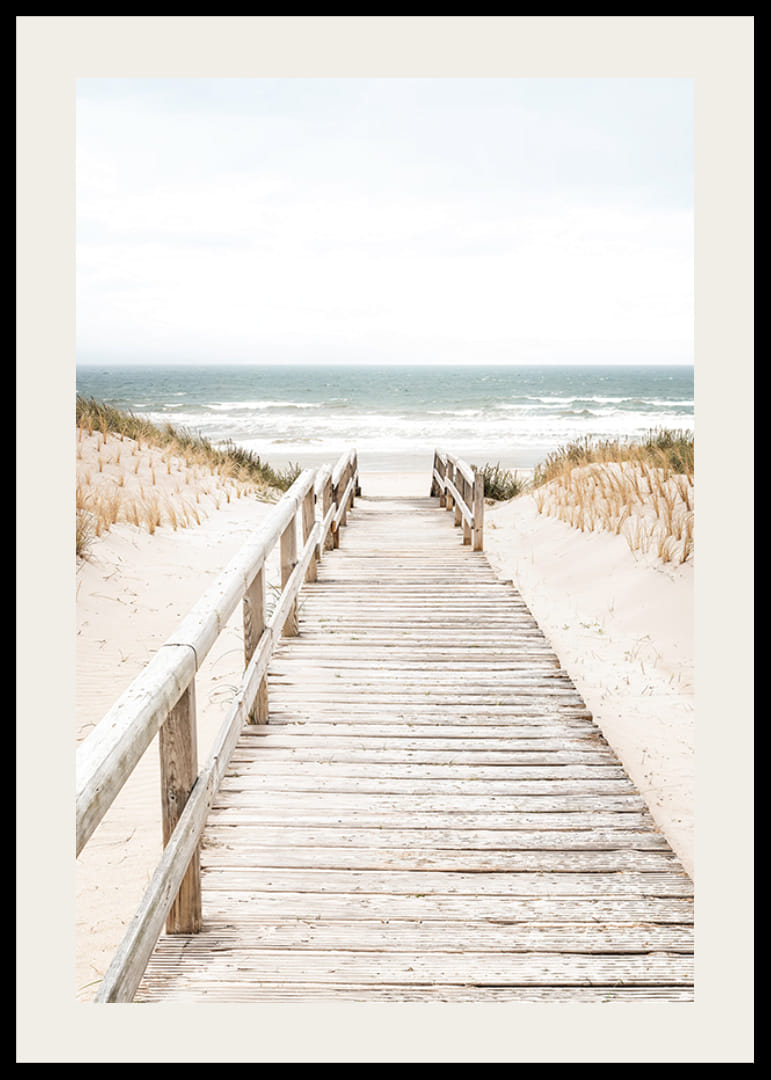 Upplev lugnet med denna vackra poster som visar en träspång över sanddynerna, som leder ner till en stilla strand. Perfekt för att ge ditt hem en känsla av frid och naturlig skönhet, och för att påminna om härliga dagar vid havet.