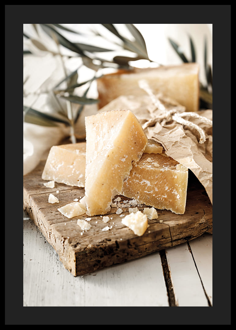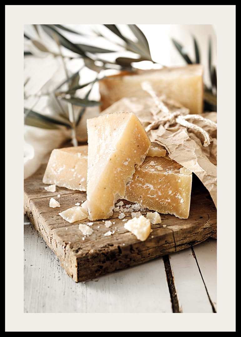 Förhöj ditt kök med denna vackra poster som fångar den rustika charmen av lagrad parmesanost. Med dess gyllene toner och krispiga textur mot en träskiva, skapar bilden en inbjudande atmosfär av kulinarisk njutning och autentisk matlagning. Perfekt för alla matälskare.