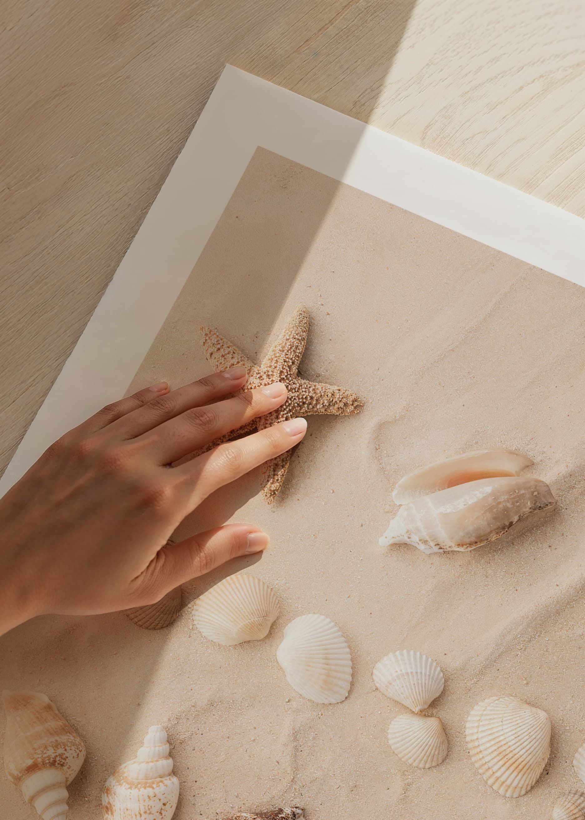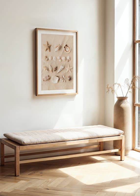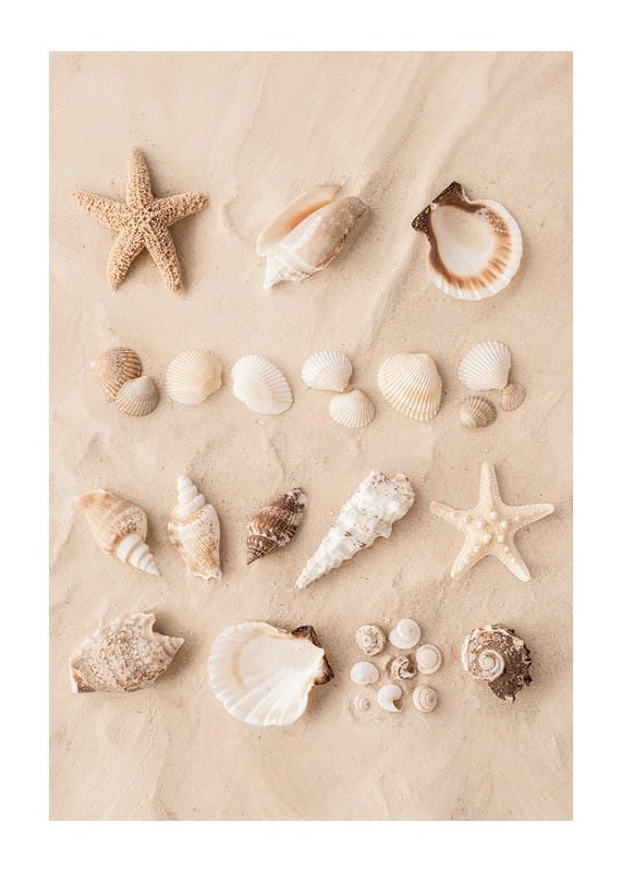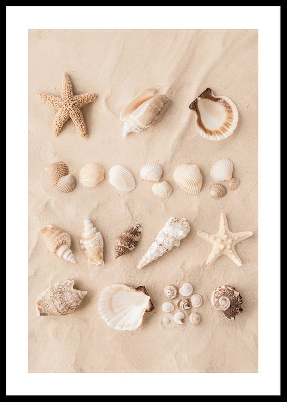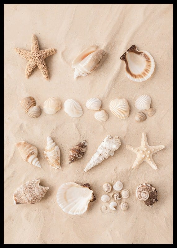Skapa en strandnära känsla i ditt hem med denna vackra poster. Den visar en samling snäckor och sjöstjärnor prydligt arrangerade i sanden. Denna harmoniska komposition fångar essensen av strandens skönhet och är perfekt för att ge ditt rum en touch av naturens elegans.