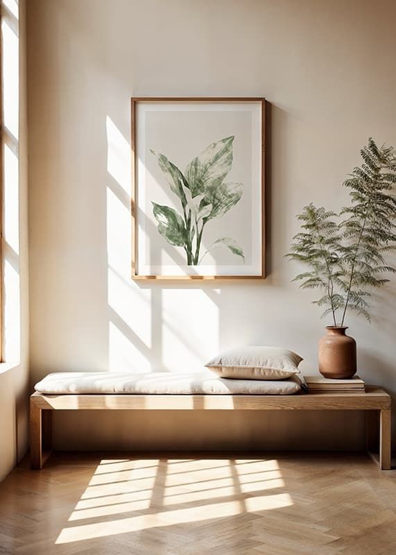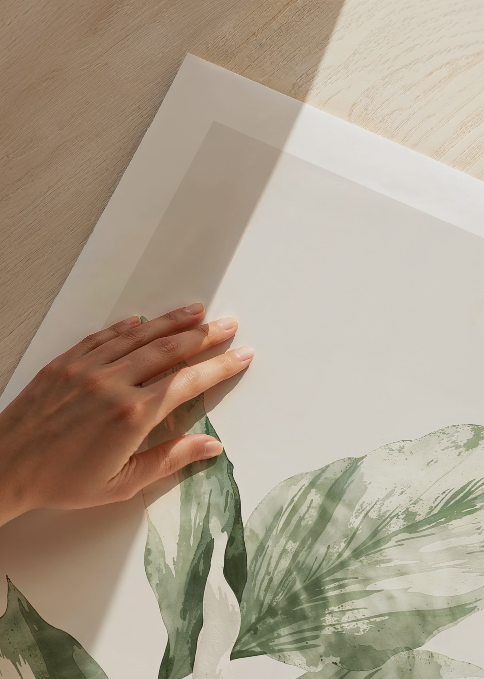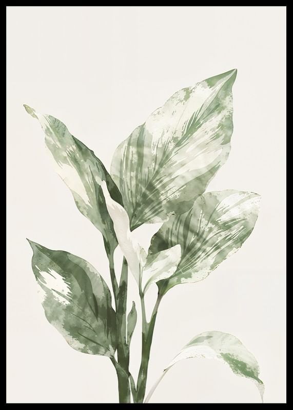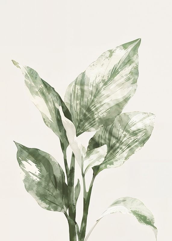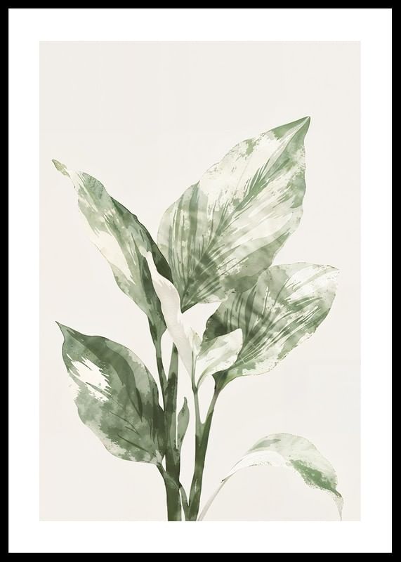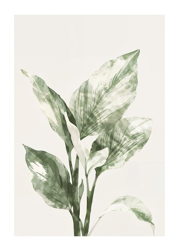 Förvandla ditt hem med vår vackra poster föreställande eleganta, gröna blad mot en ljus, krämfärgad bakgrund. Denna illustration fångar växtens naturliga skönhet och delikata detaljer med en harmonisk färgpalett som utstrålar lugn och fräschör.