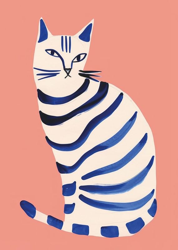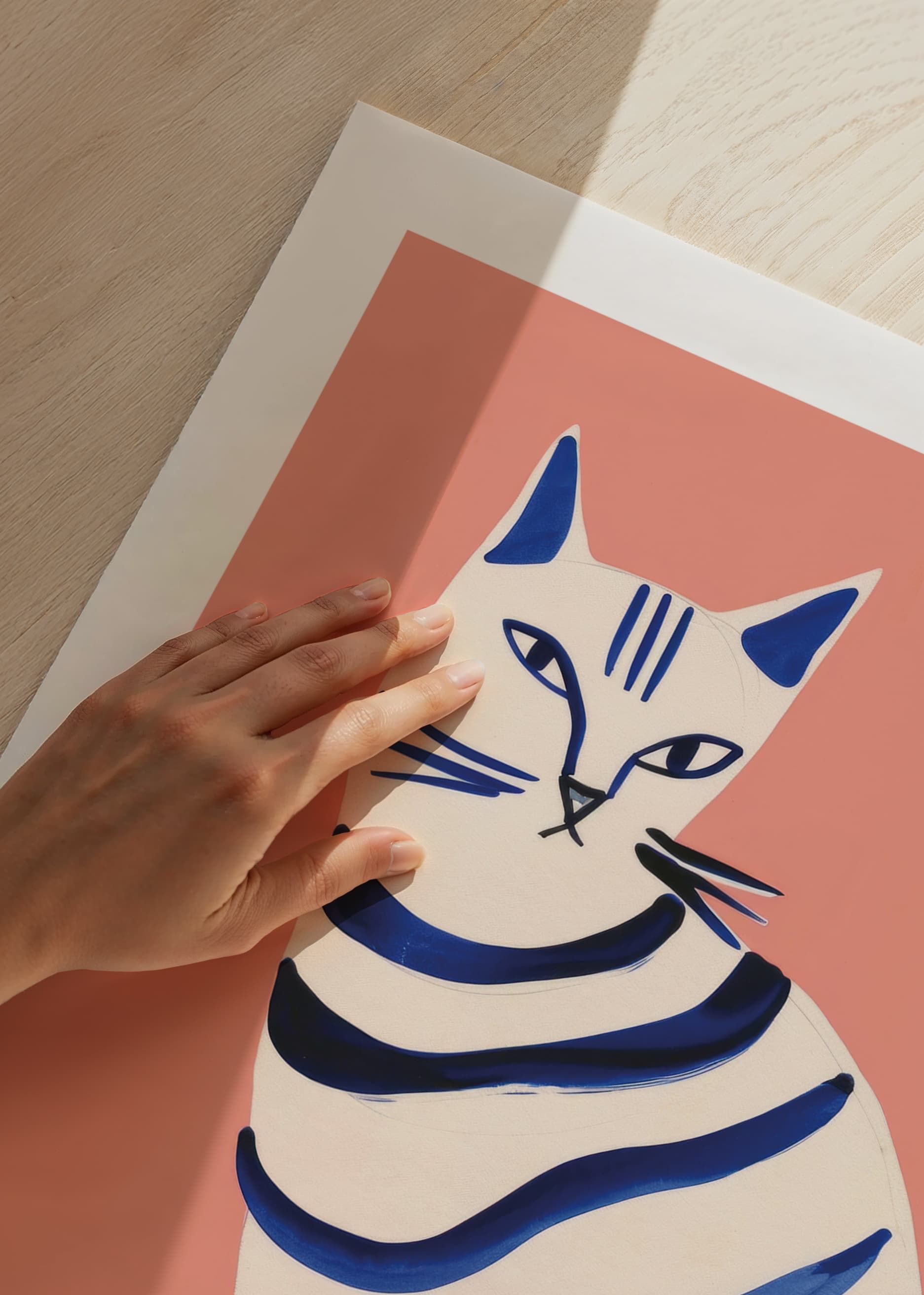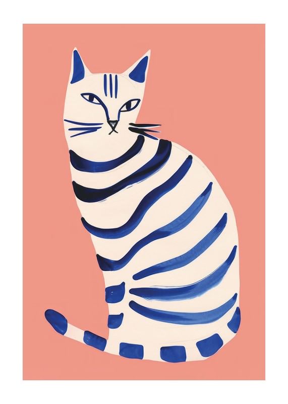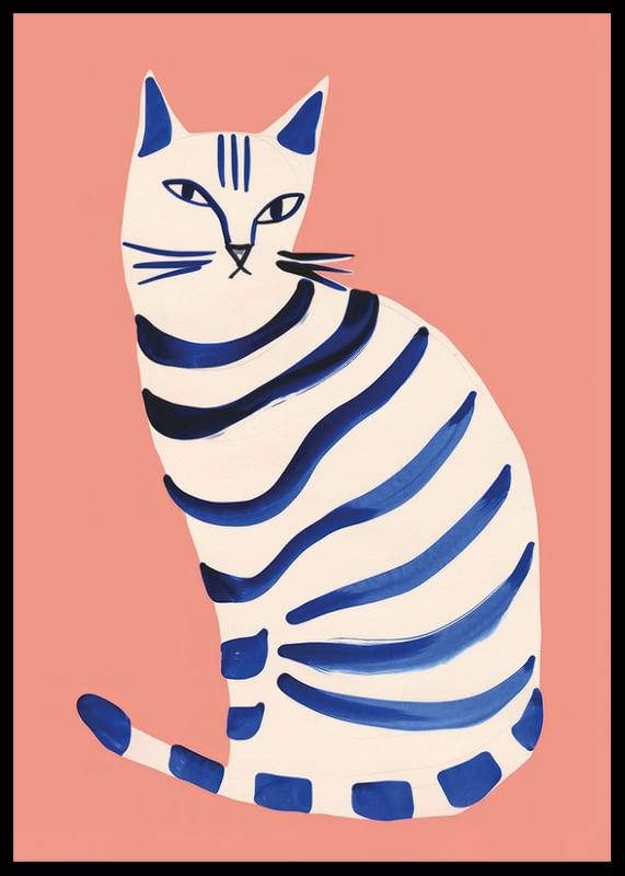 För in lekfull charm och modern konst till ditt hem med vår färgstarka poster föreställande en stiliserad katt med blå ränder mot en varm persikofärgad bakgrund. Denna unika illustration fångar kattens eleganta hållning och uttrycksfulla ansiktsdrag, vilket ger en känsla av både mystik och vänlighet. Perfekt för att ge liv och karaktär till ditt vardagsrum, sovrum eller arbetsrum.