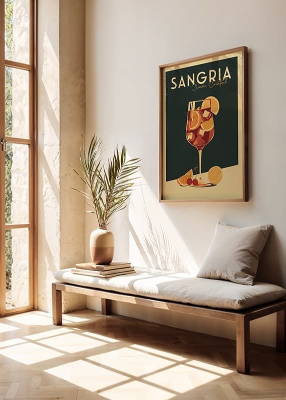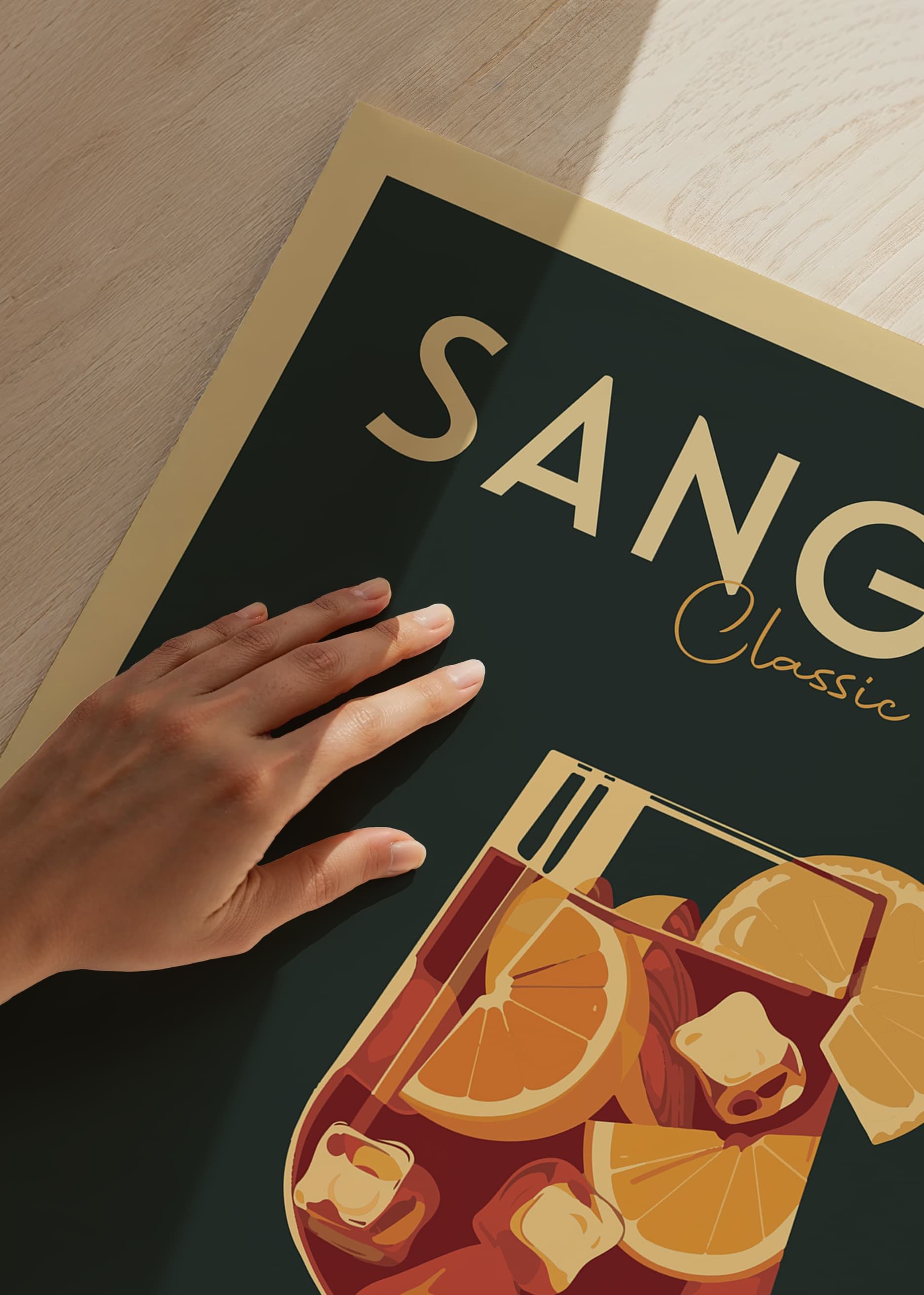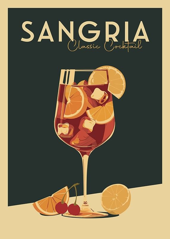 Fånga den festliga och uppfriskande känslan av sommar med vår stilfulla poster föreställande ett glas klassisk sangria. Med sina rika, varma färger och eleganta design, utstrålar denna illustration en känsla av avslappnad lyx och njutning. Perfekt för att dekorera ditt kök, matsal eller uteplats. Låt denna poster tillföra en touch av spansk kultur och charm.