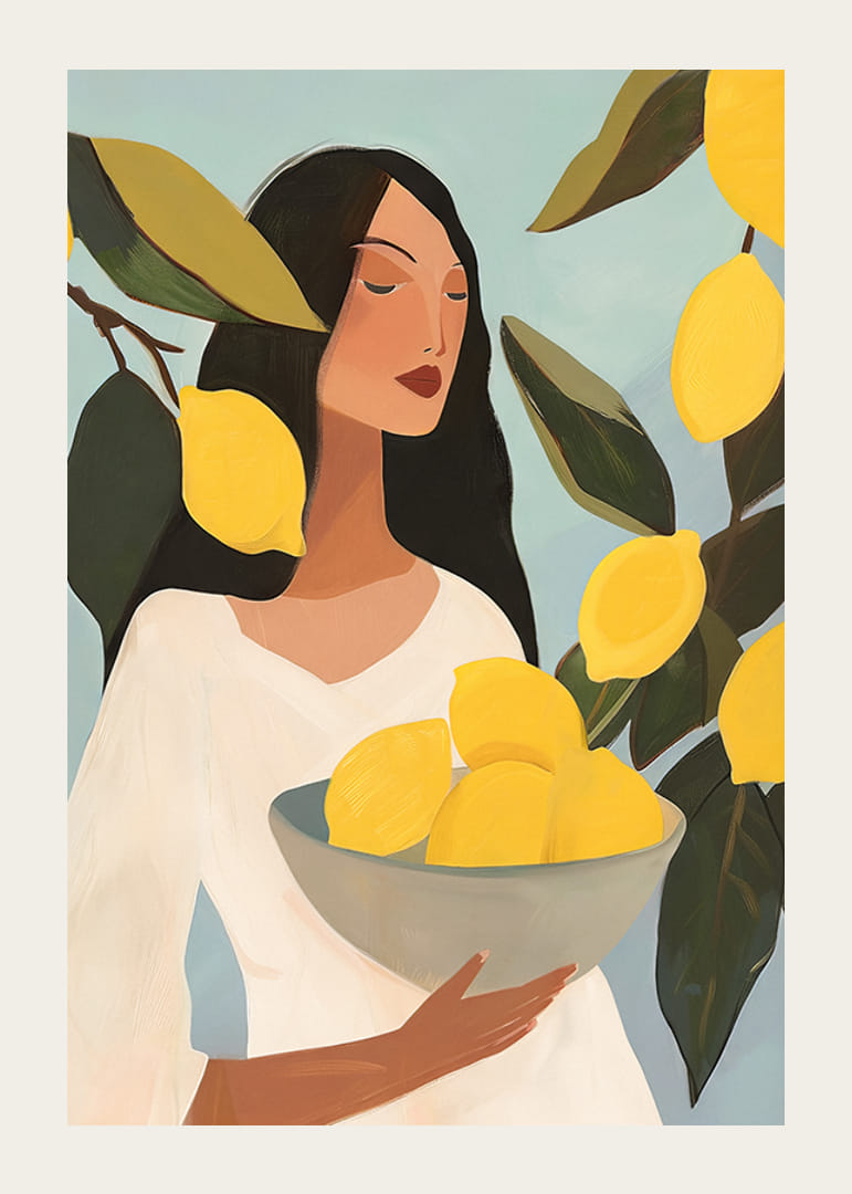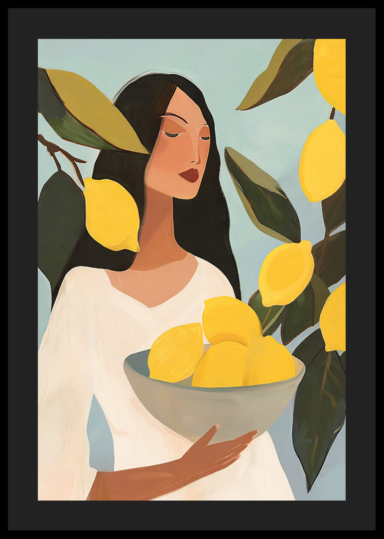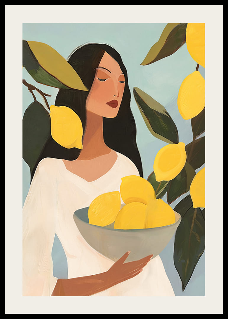 För in en känsla av somrig fräschör och konstnärlig elegans i ditt hem med vår färgstarka poster som föreställer en kvinna med mörkt hår, klädd i vitt, omgiven av solmogna citroner. Denna illustration fångar ett ögonblick av stillhet och enkelhet, där ljusa gula citroner kontrasterar vackert mot den mjuka blå bakgrunden och de mörkgröna bladen. Perfekt för att ge ditt kök, vardagsrum eller arbetsrum en levande och inspirerande atmosfär.