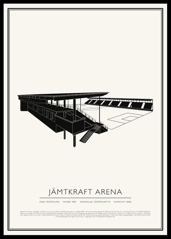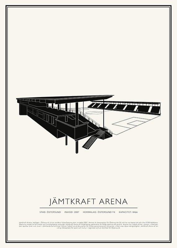 Jämtkraft Arena, belägen i Östersund, är en modern fotbollsarena som invigdes 2007. Arenan är hemmaplan för Östersunds FK och har en kapacitet på cirka 8 500 åskådare. Med sina moderna faciliteter och konstgräsplan erbjuder Jämtkraft Arena en högklassig upplevelse för både spelare och publik. Arenan har också värme i planen, vilket gör den spelbar året runt, även i Jämtlands kalla klimat. Utöver fotboll används arenan för olika evenemang och konserter, vilket visar dess mångsidighet. Jämtkraft Arena är en viktig mötesplats för sport och kultur i regionen och en stolthet för Östersund.